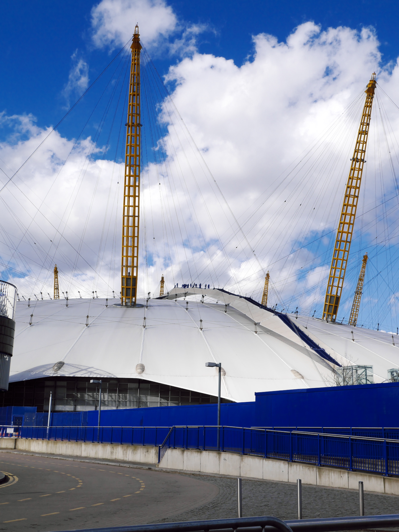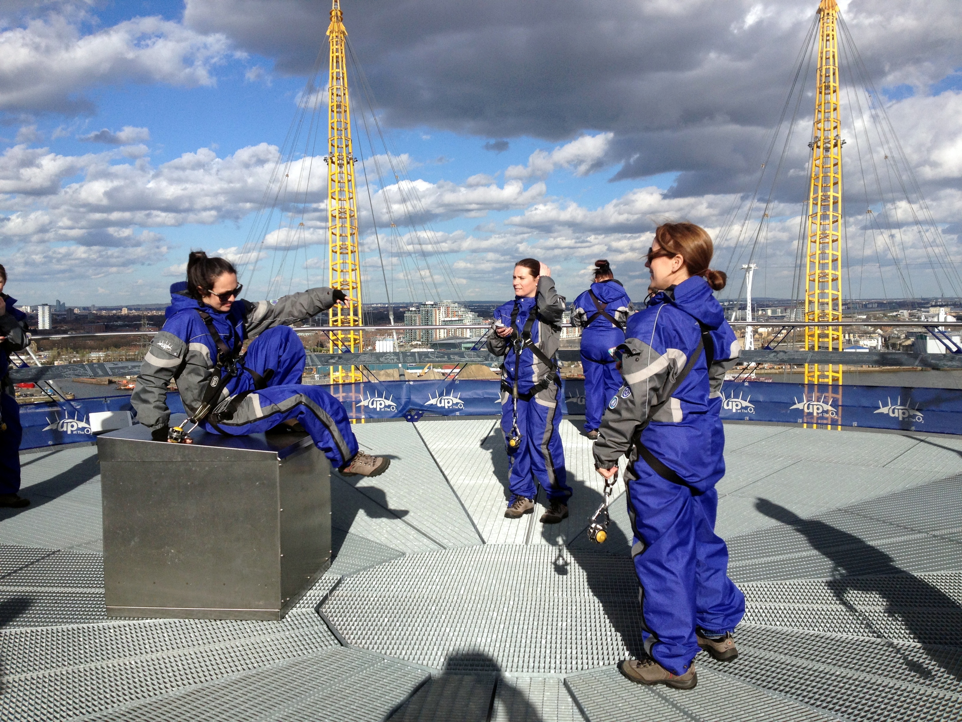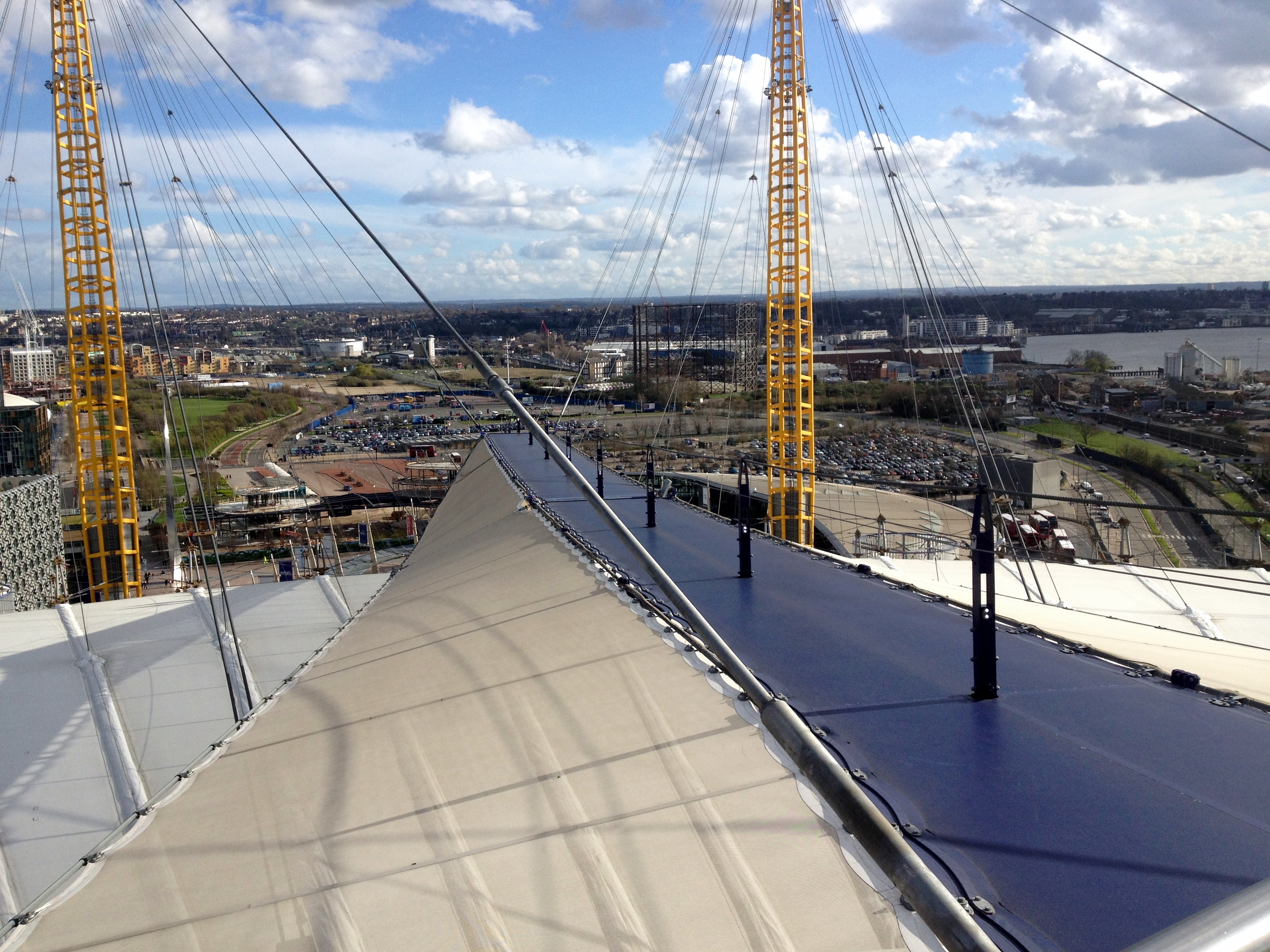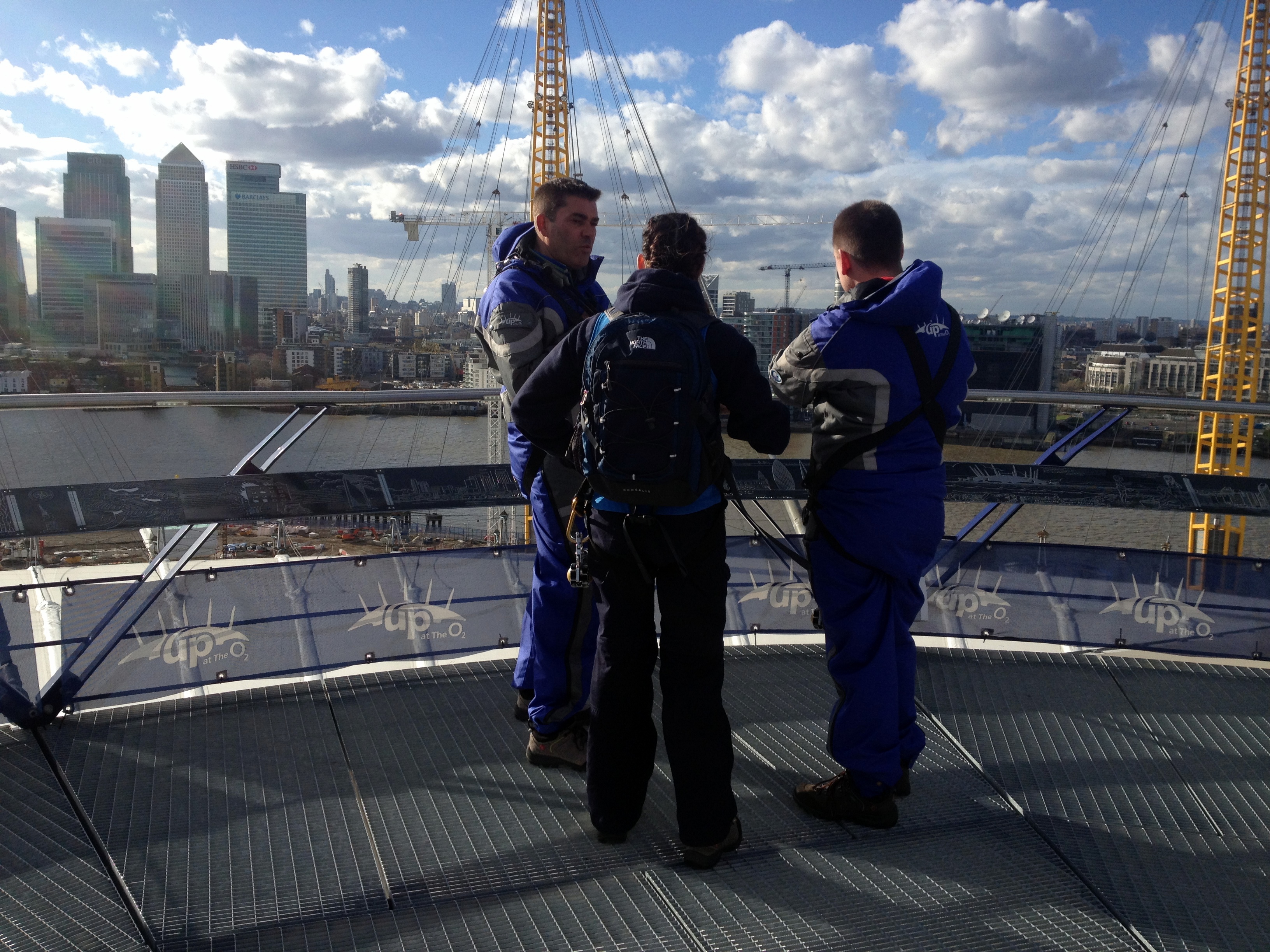L’O2, c’est l’ancien Millenium Dome. Cette grande coupole blanche surplombée d’antennes jaunes est devenue une icône londonienne. C’est la plus grande salle de concert de Londres (Justin Timberlake était d’ailleurs à l’affiche dans les jours qui suivaient). Et qu’allons nous y faire? Visiter les coulisses? Y voir de nouveaux lieux de tournage? Non, non, non… car après le speedboat, nous allons continuer nos aventures bondesques… en escaladant l’O2.