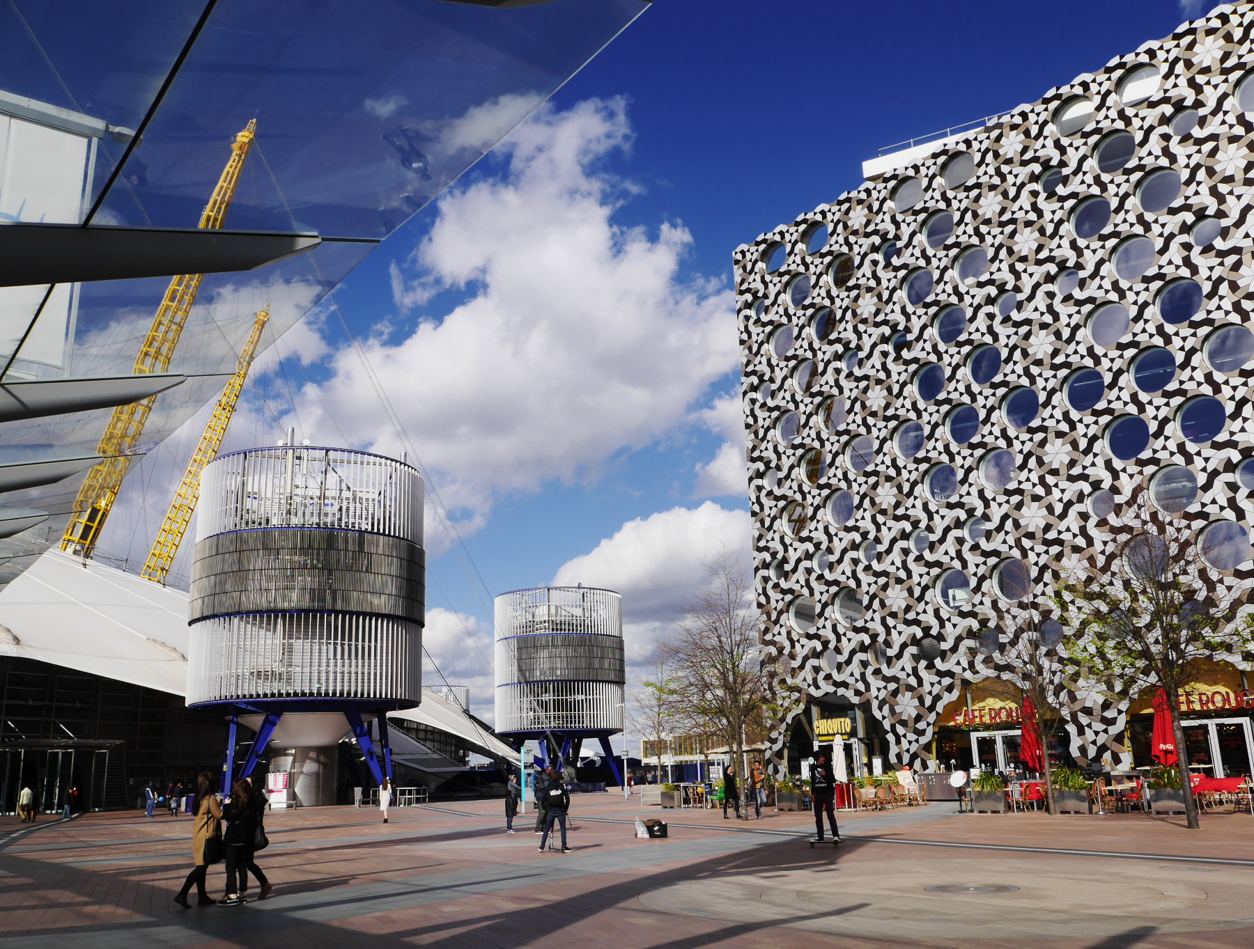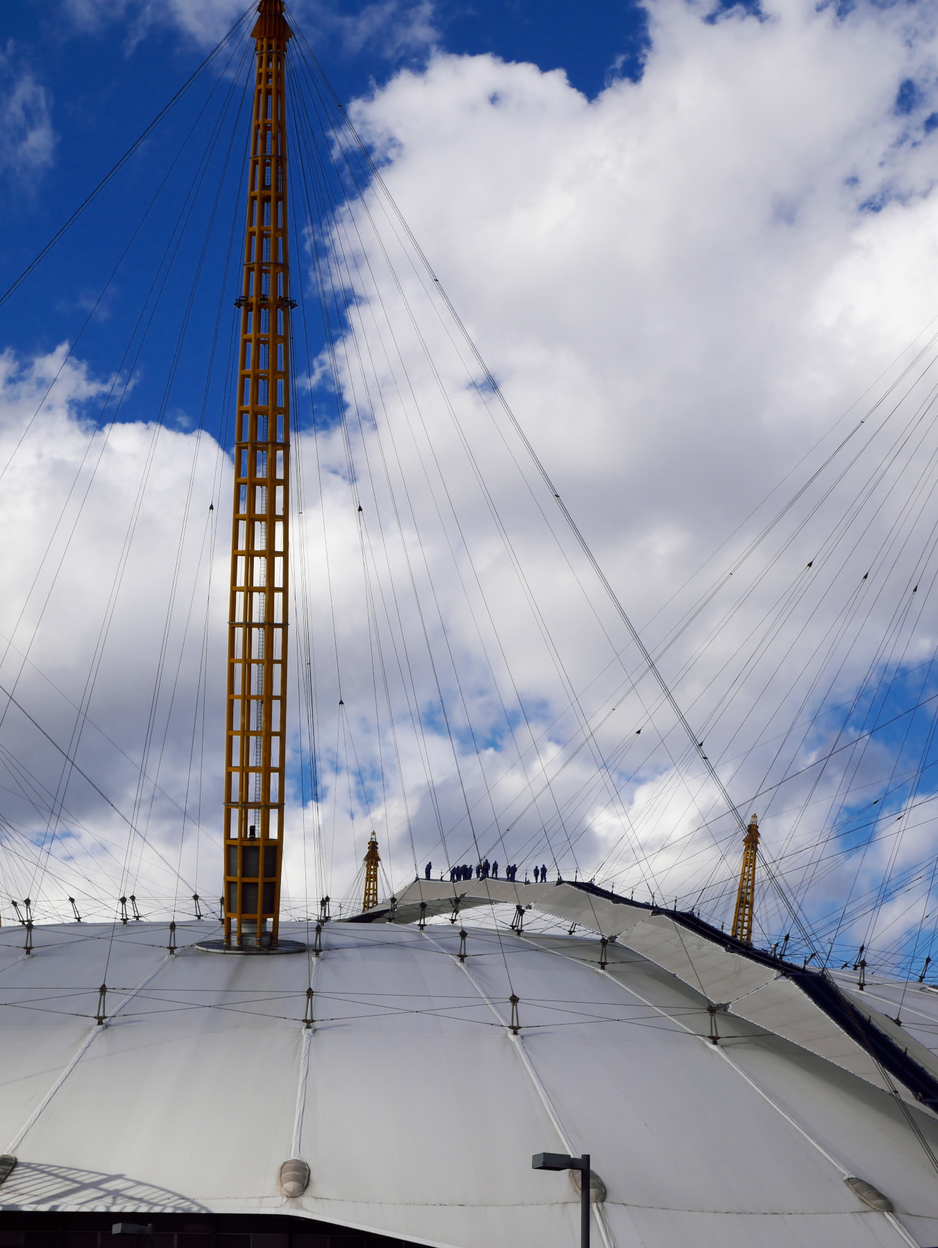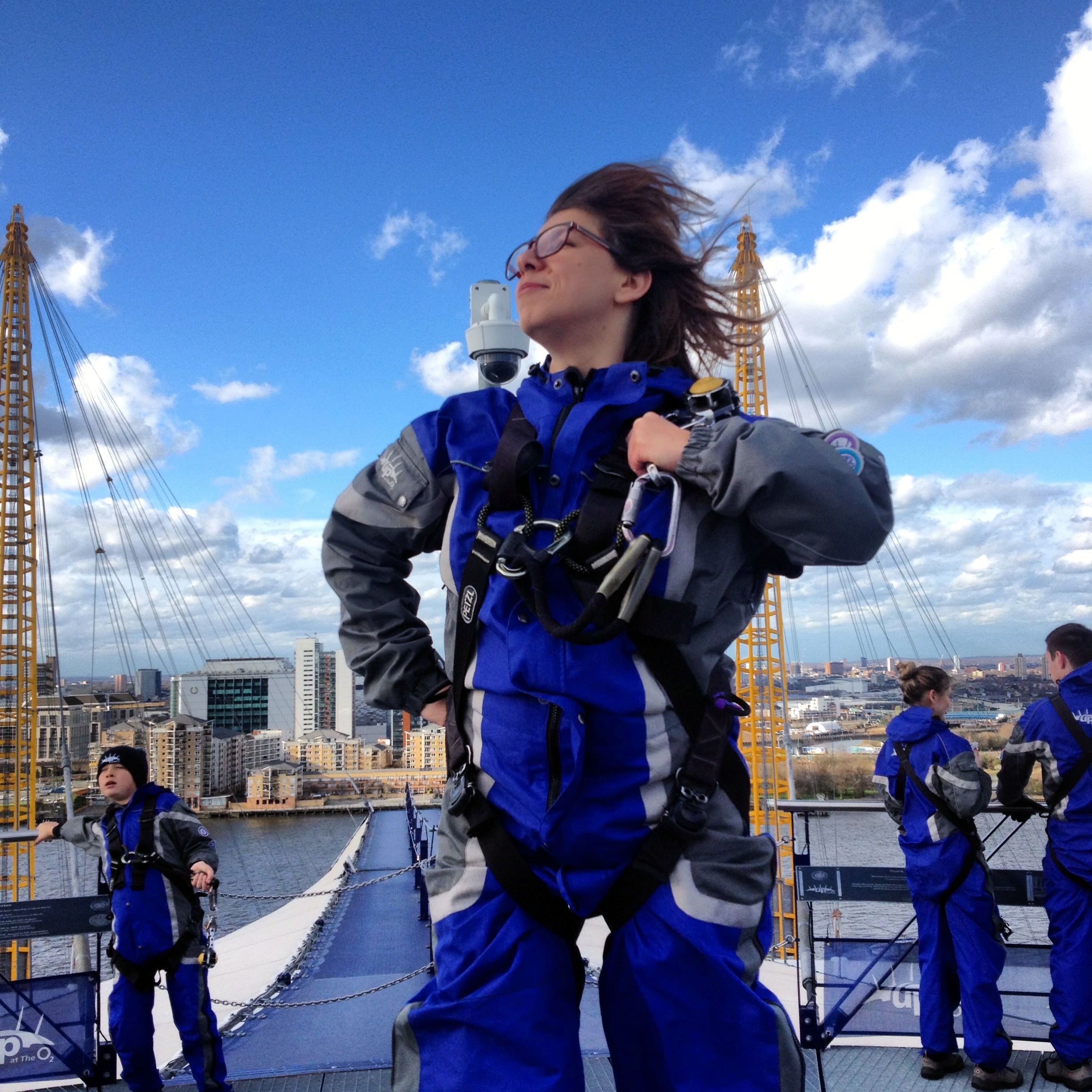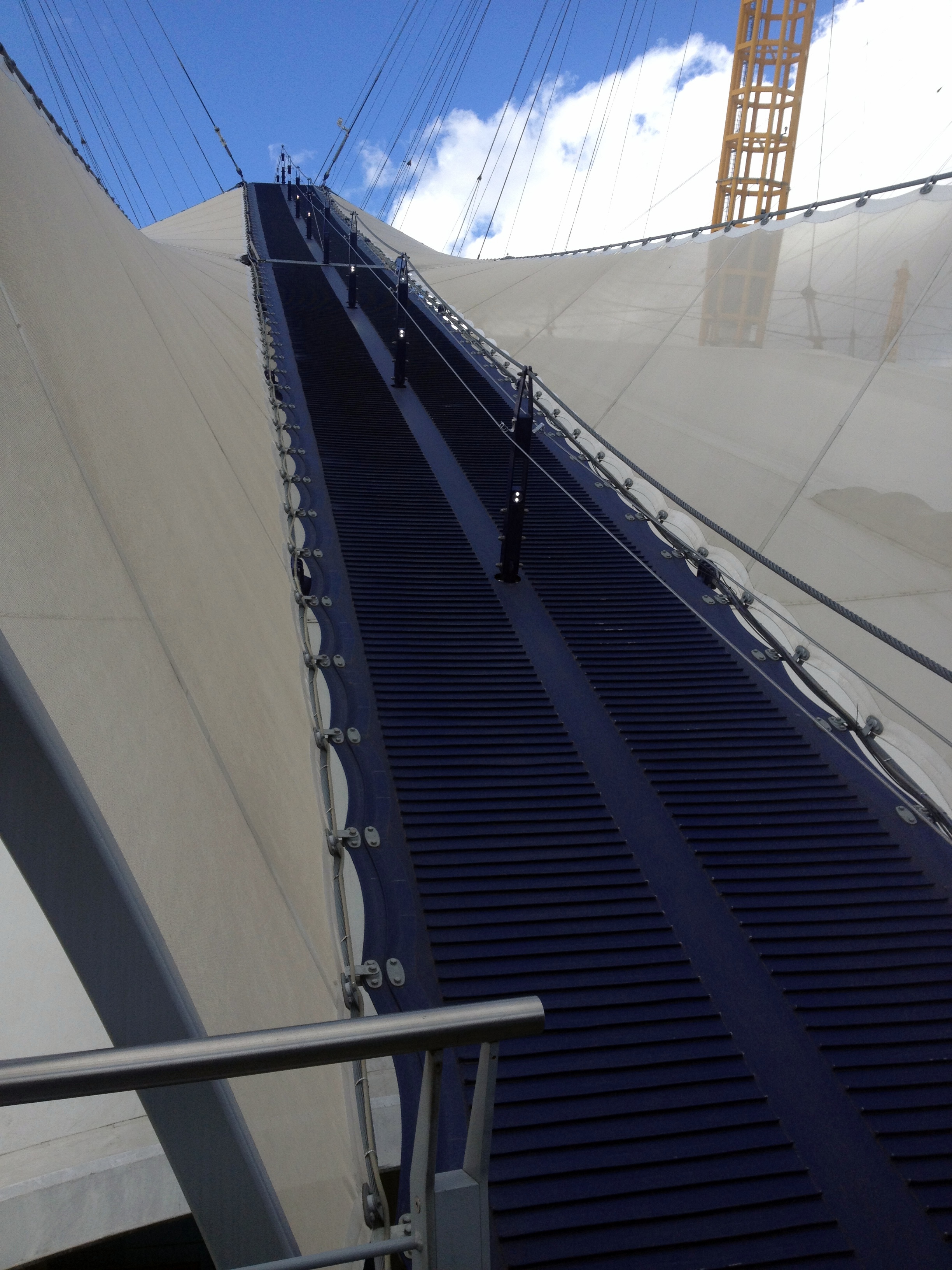 L’O2, c’est l’ancien Millenium Dome. Cette grande coupole blanche surplombée d’antennes jaunes est devenue une icône londonienne. C’est la plus grande salle de concert de Londres (Justin Timberlake était d’ailleurs à l’affiche dans les jours qui suivaient). Et qu’allons nous y faire? Visiter les coulisses? Y voir de nouveaux lieux de tournage? Non, non, non… car après le speedboat, nous allons continuer nos aventures bondesques… en escaladant l’O2.