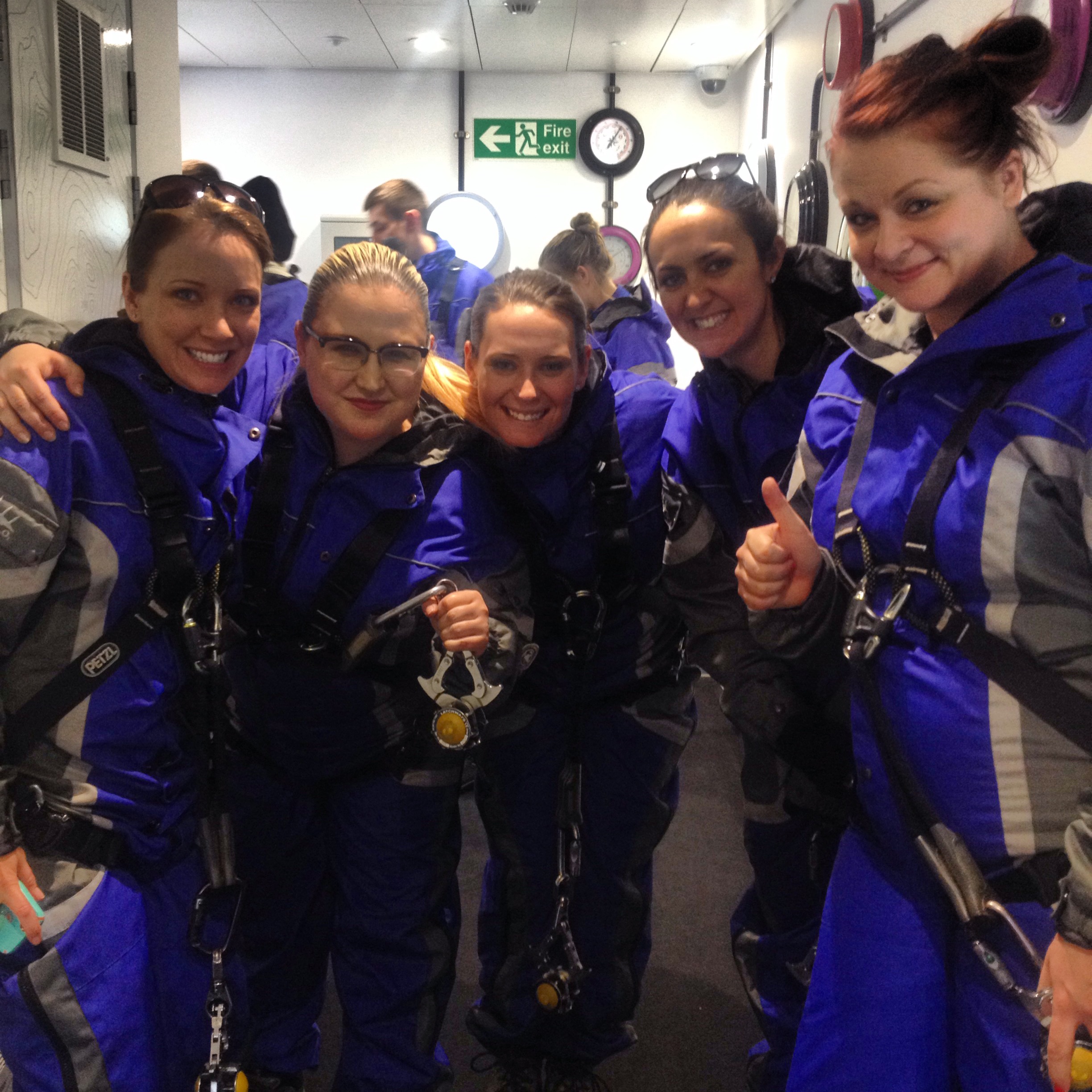 Comme tout bon « alpinistes », les candidats à l’ascension ont droit à un briefing vidéo, en bonne et due forme avec explication de ce qui va se passer et consignes de sécurité. Tout de suite après, on vous emmène pour vous équiper en combinaison, chaussures et sangles de sécurité. Prêtes pour l’aventure, on rigole comme des folles, sans trop savoir ce qui nous attend! Pour notre sécurité, interdit de s’encombrer d’un appareil-photo et le smartphone doit rester caché dans une petite pochette de la combinaison. Serait-ce si dangereux ? Essie et Tiia, toujours les plus enthousiastes partent en premier. Nous voilà dehors, on nous aligne à la queue-leu-leu et accroche la grosse bille de notre sangle à un rail métallique qui court de la base au sommet… sauf que d’ici, le sommet, on ne le voit pas ! Cette boule et ce rail nous serviront de « ligne de vie » lors de notre ascension. Notre guide nous donne le signe du départ, et en avant! Surprise, alors que nous nous attendions à marcher sur une espèce de passerelle inclinée, il s’agit plutôt d’une espèce de tapis en plastique épais, mais souple, et semé de cannelures pour empêcher de déraper. Et on monte…