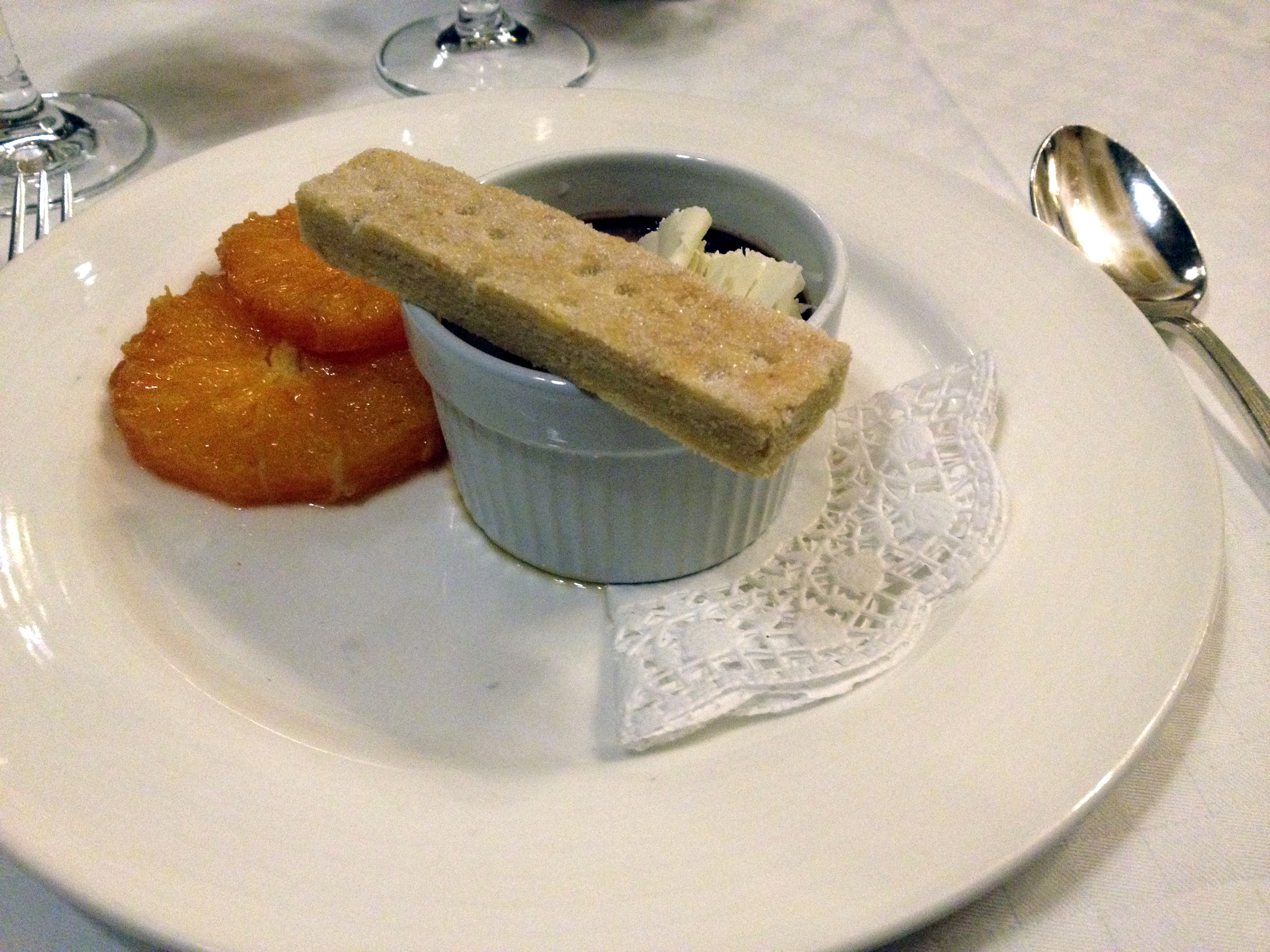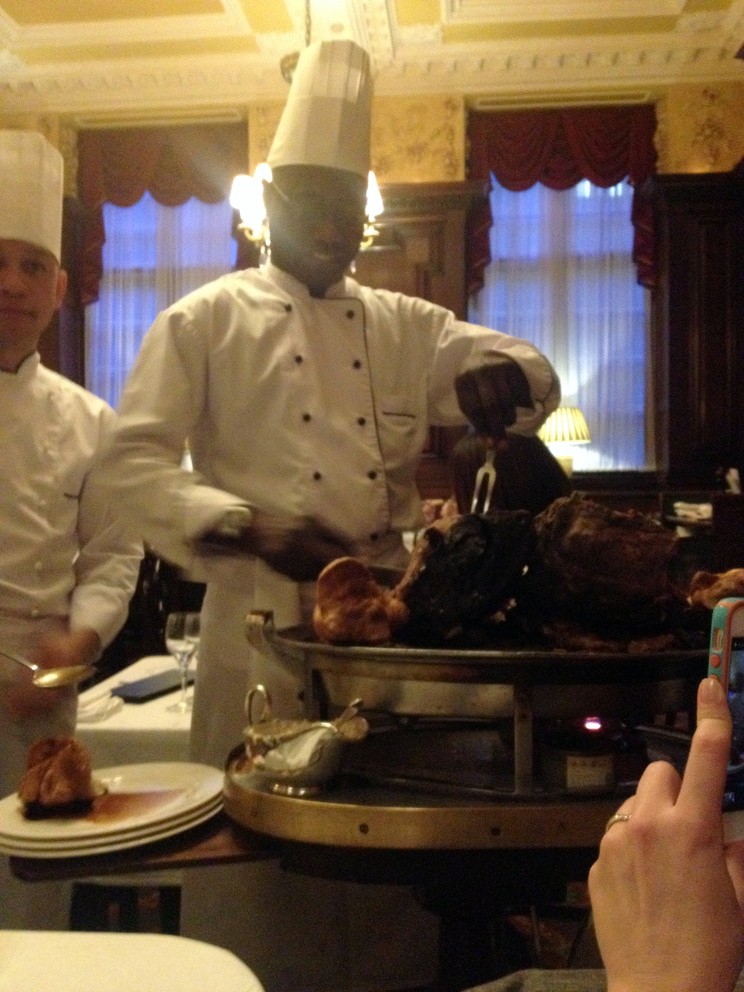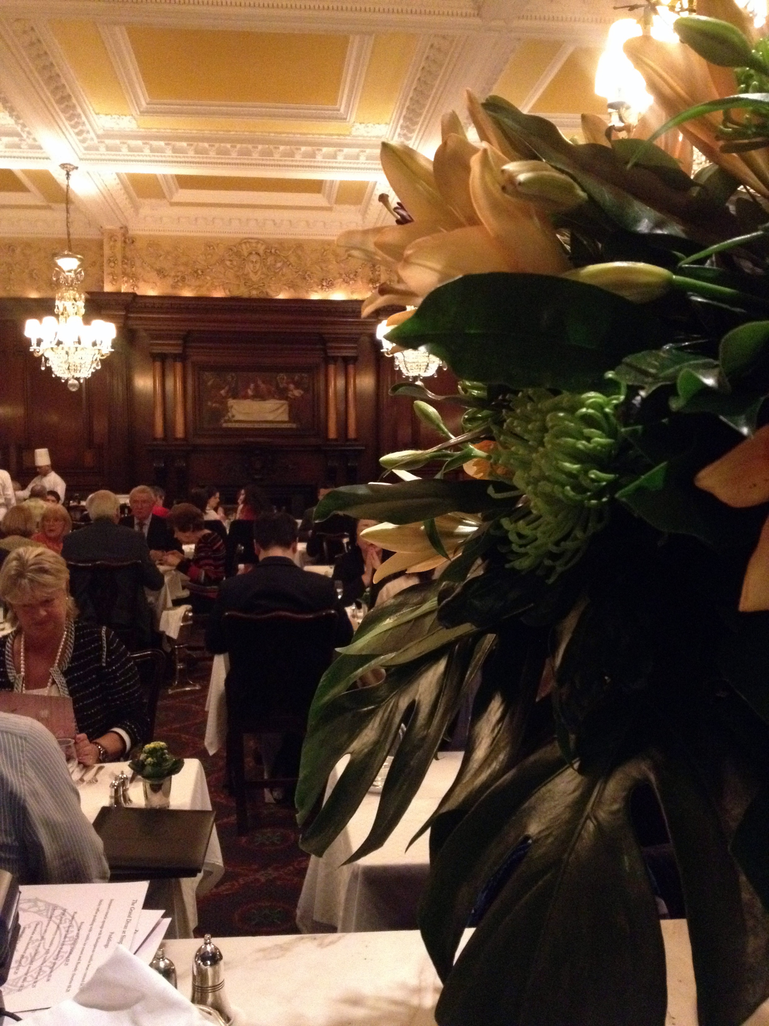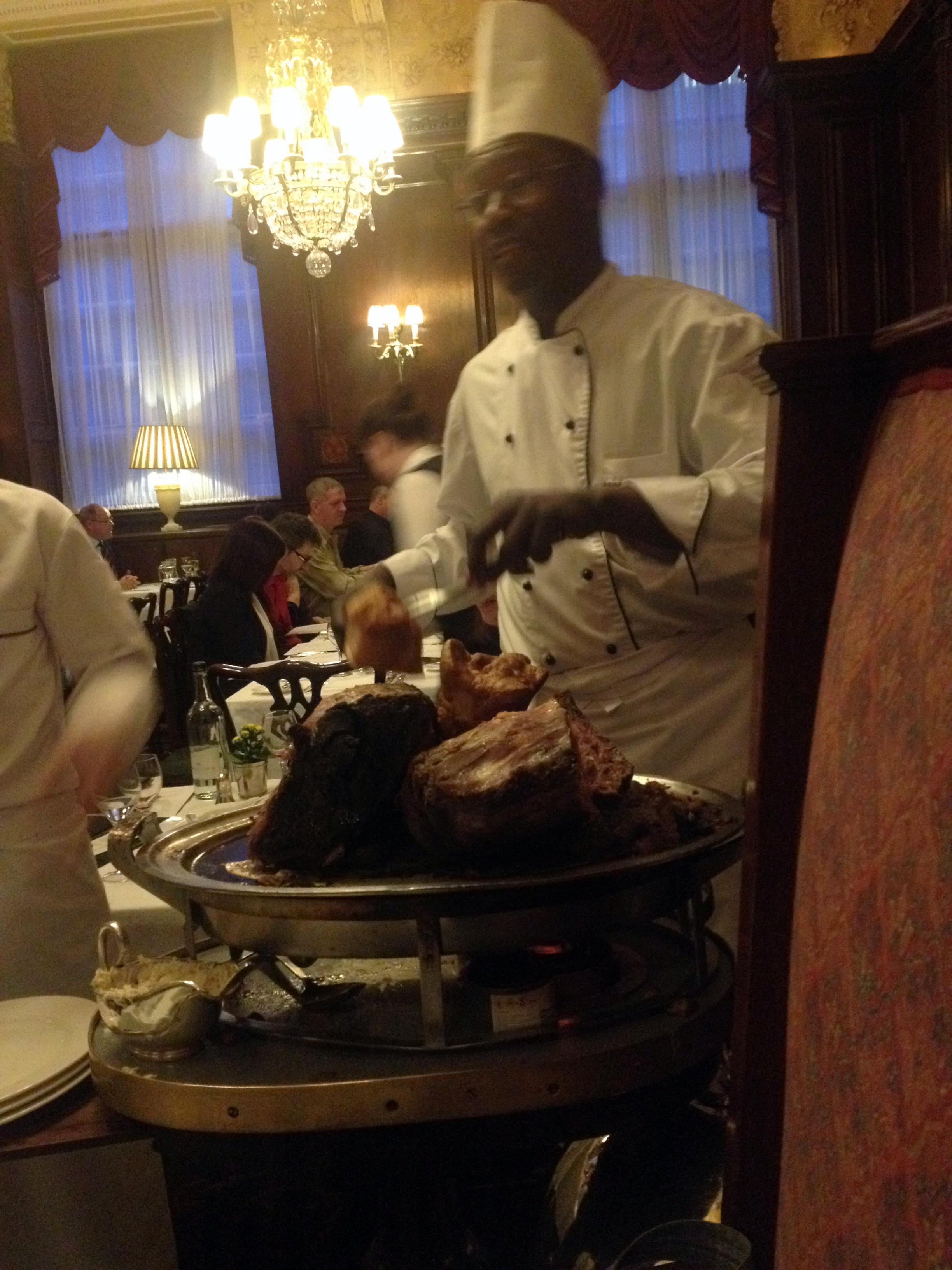 Pas le temps de réfléchir aux exploits accomplis, nous retournons vite à l’hôtel, le temps de se changer et nous nous engouffrons en vitesse dans une voiture pour rejoindre la quartier du Strand pour un classique londonien: « dinner and a show ». Le dîner, ce sera au Simpson’s-in-the-Strand, un restaurant dans la plus pure tradition du club londonien. Ancien café et club d’échec, on y vient à présent déguster du roast beef sous les grands plafonds à moulures, assis de profondes chaises recouverte de velours. Nous sommes prises en charge par un personnel jovial et stylé qui nous accueille avec un « Where are the men? » Eeeh non, Messieurs! Ces dames mangent entre elles et en plus, affamées comme nous étions, nous sommes toutes jetées sur le roastbeef (avec pudding et légumes). Imaginez la tête de notre serveur lorsque 6 jeunes filles très distinguées s’exclament en coeur : « Beeeef! » sur le ton d’une troupe de mâles en mal de viande rouge lorsqu’il vient prendre notre commande. Et lorsqu’arrive le bœuf, c’est assez impressionnant ! On apporte une énorme pièce de viande (dans notre cas, deux, puisque deux sortes de cuissons étaient demandées) et les master carvers découpent une juteuse pièce de viande (avec gravy, si vous le souhaitez). On se laisse conseiller par le sommelier et on déguste. La viande est délicieuse! Très tendre, la cuisson demandée de mon côté (saignant) tendait plus vers le « à point » que le saignant mais le goût a tout racheté. Impossible de terminer le pudding et tous les légumes, il fallait que je garde une place pour le dessert: un délicieux biscuit sablé servi sur des oranges marinées au rhum et aux épices. Miam!!!