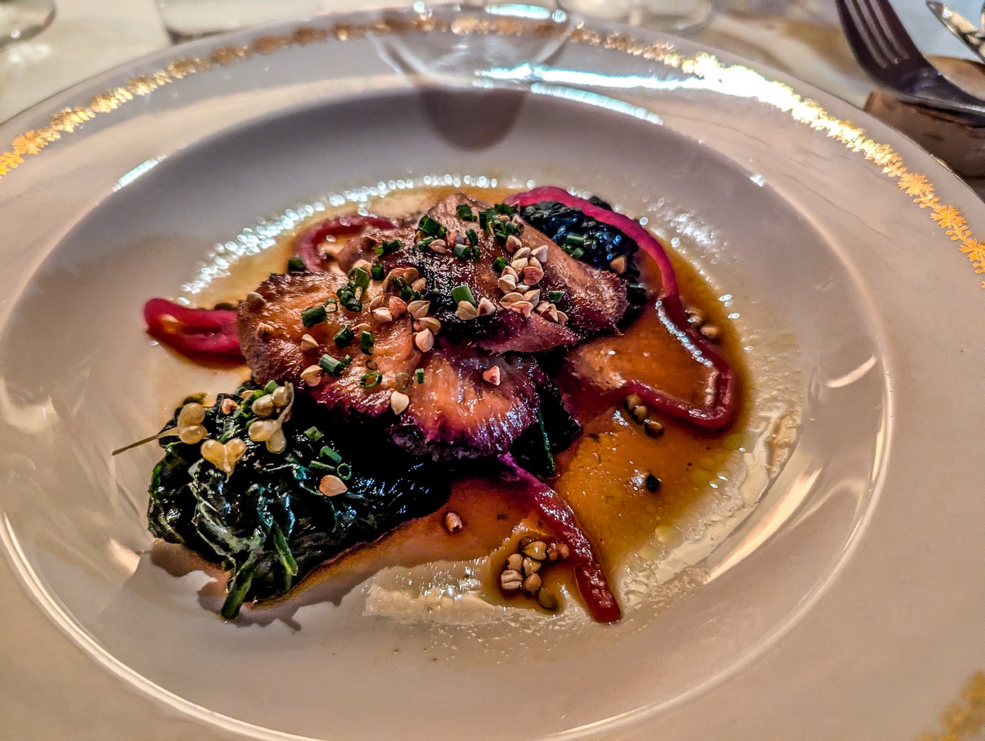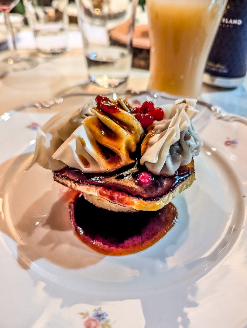 - En plat principal, des gyozas d’élan, avec une sauce à l’élan, des airelles et une base de navet rôti.