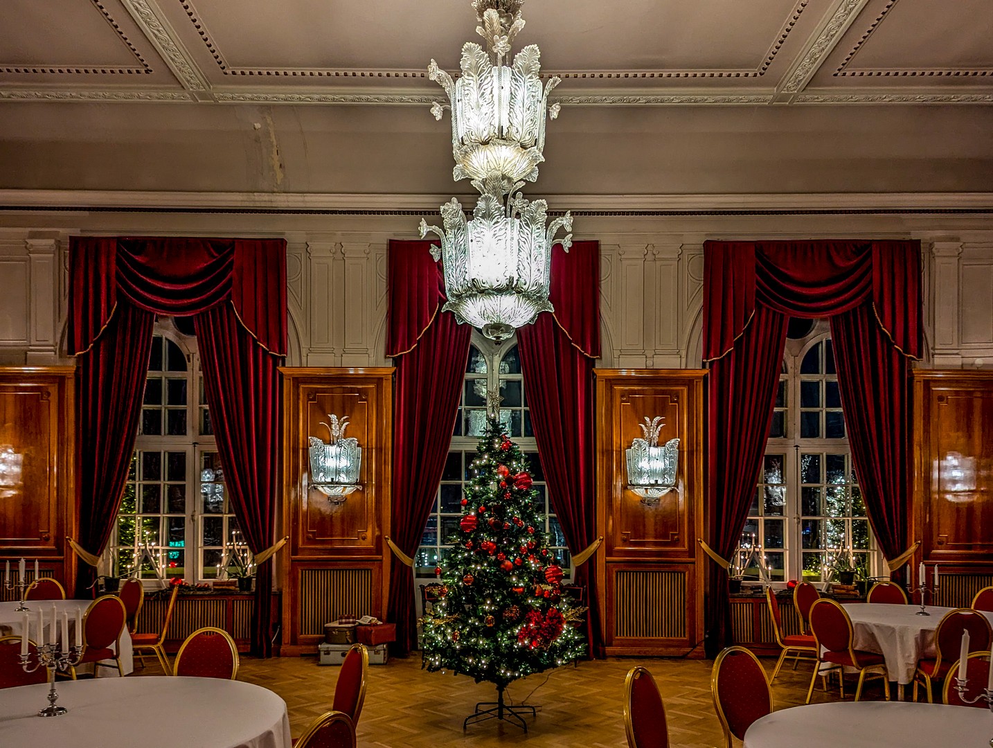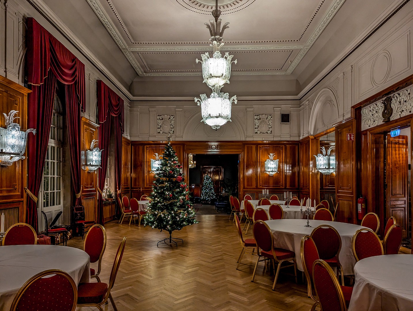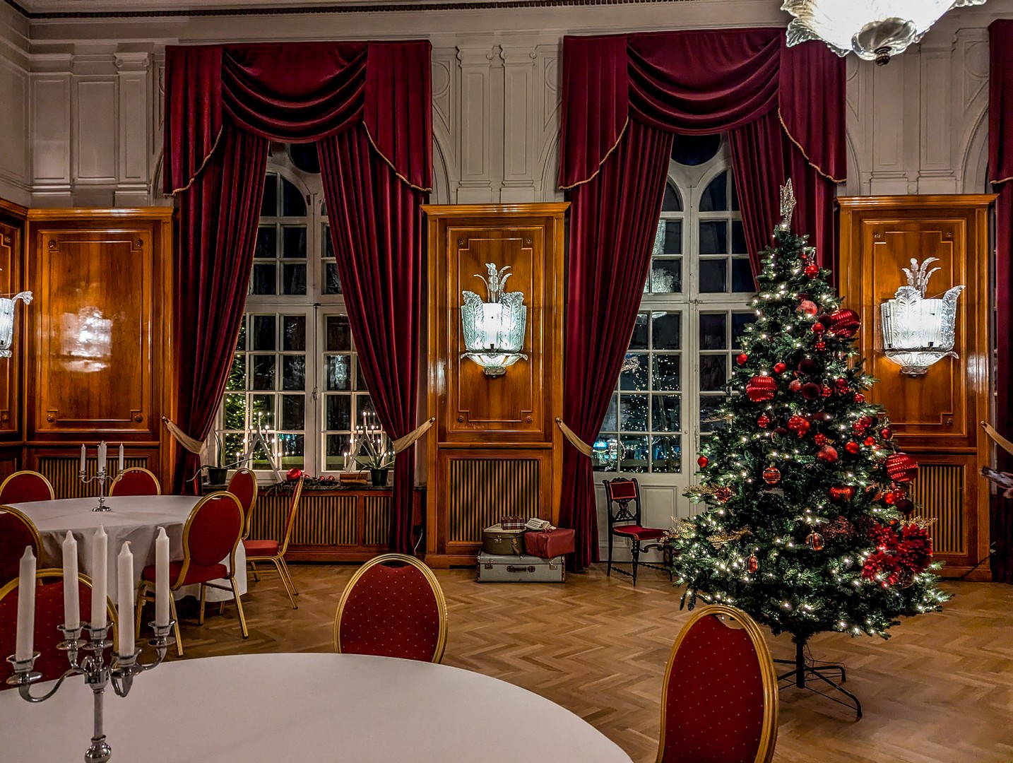 Les salons s’enchaînent : salon bleu, salon vert, la salle de bal, toute de rouge habillée, avec des lustres en verre pressé-moulé à la Lalique. Le lustre principal est gigantesque, et Haparanda se souvient encore de son arrivée, en cariole tirée par des chevaux depuis le sud du pays.