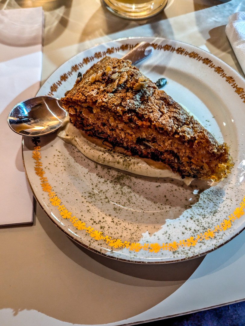 - En dessert, un carrot cake au granola, cream cheese et poudre de réglisse, une confiserie très prisée en Scandinavie.