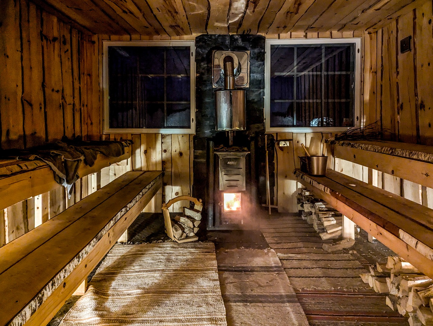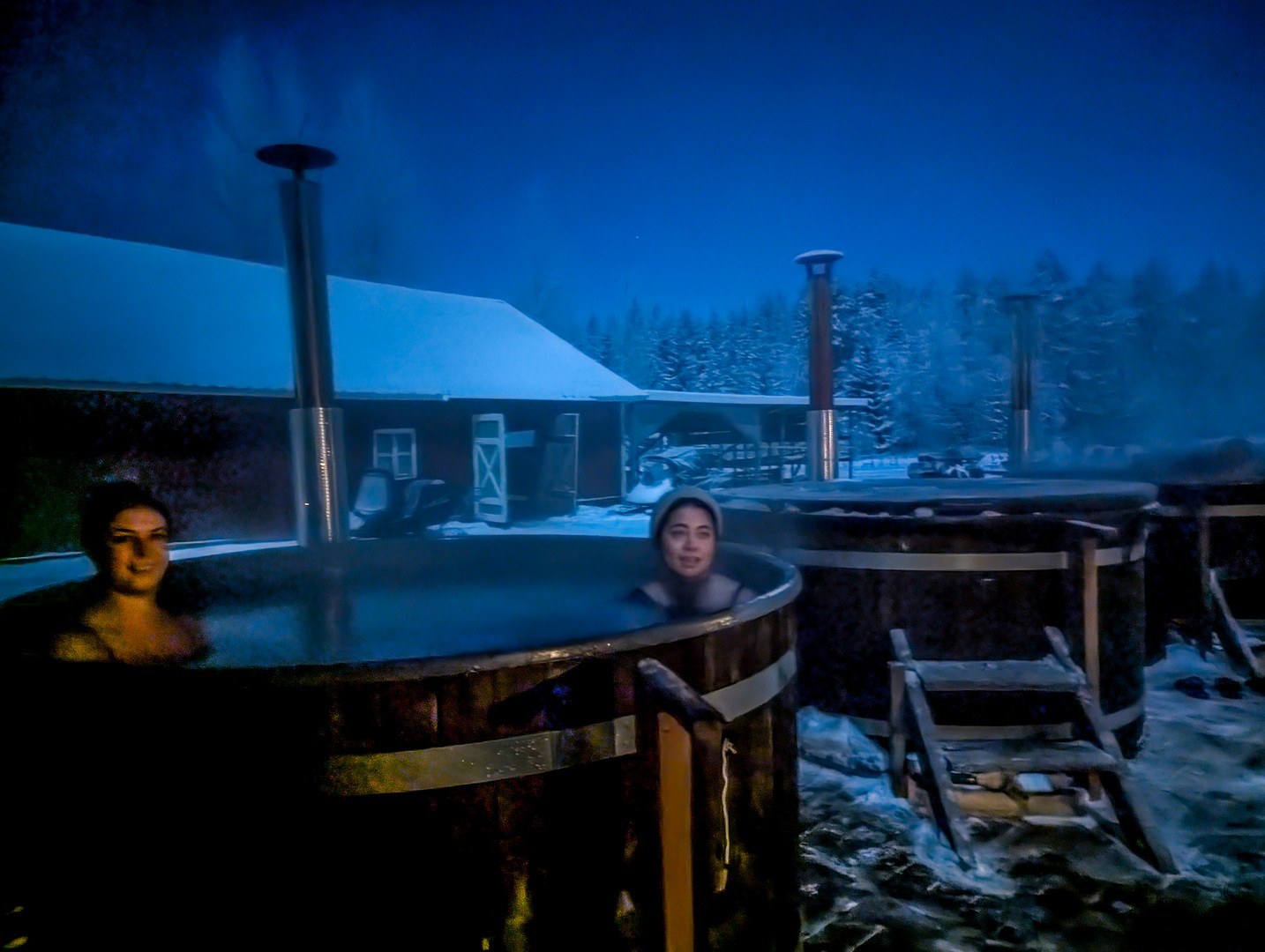 Pour terminer la soirée, nous avons profité du sauna, qui peut accueillir au moins une vingtaine de personnes, et du jacuzzi en extérieur. Là, je me suis vraiment sentie « dans le Grand Nord ». Température ambiante : -20 °C. En sortant du sauna pour se rafraîchir, mes cheveux gelaient instantanément ! Même dans le jacuzzi, la sensation de chaleur mêlée au froid extérieur était tout simplement voluptueuse.