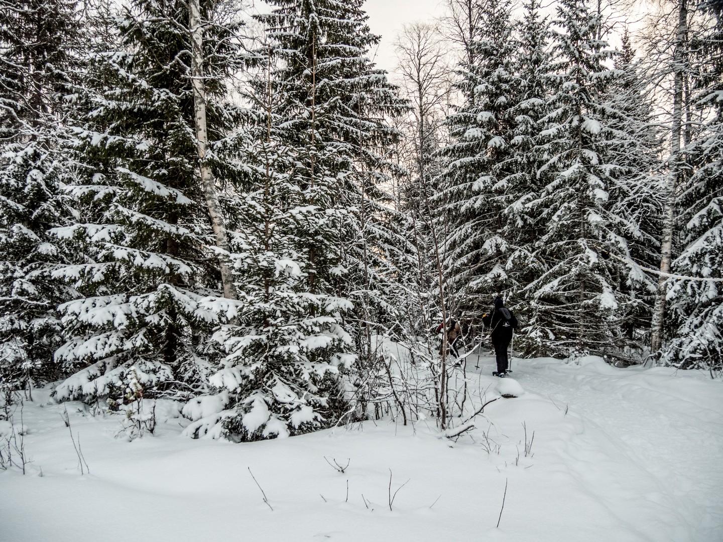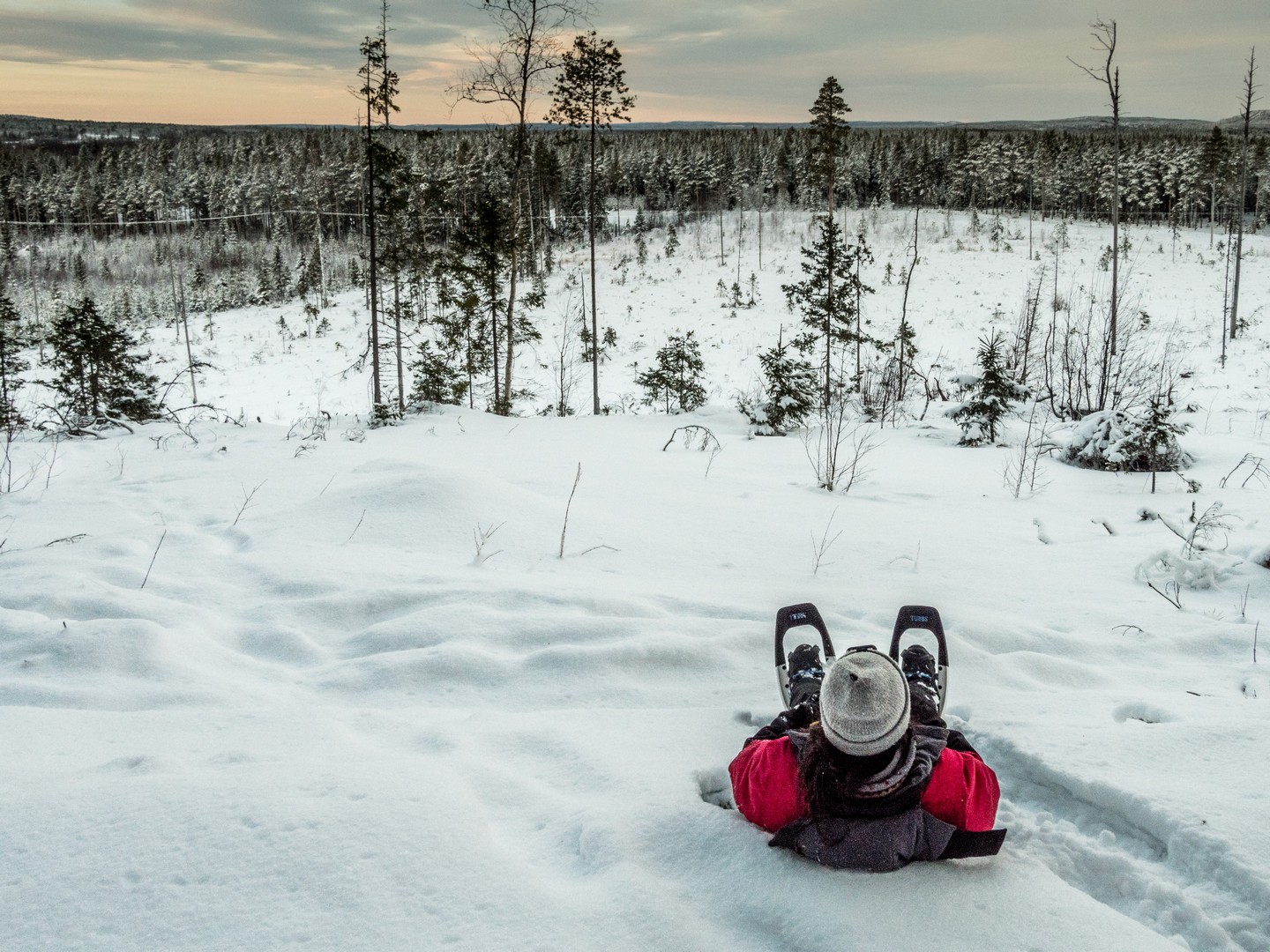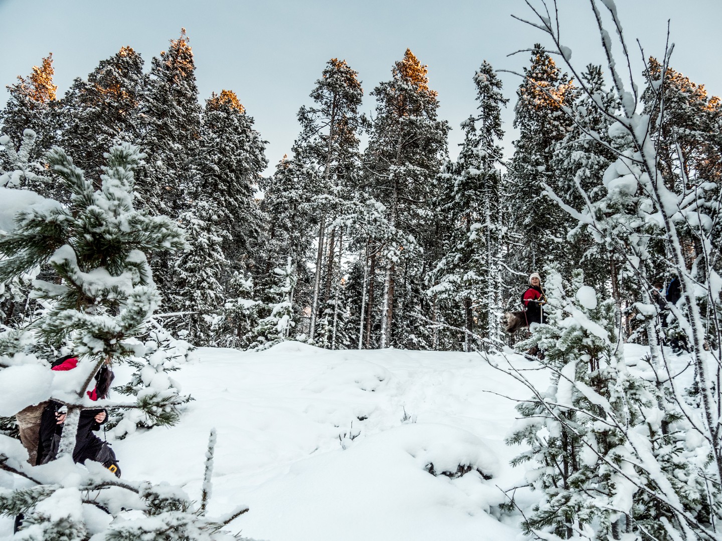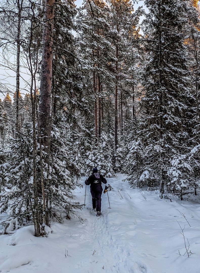Il est 9 h 30, et le soleil se lève seulement. Seuls les sommets des sapins sont éclairés d’une lumière rose-orangée, une douce lumière qui ne nous quittera pas de la journée, car le soleil n’ira pas beaucoup plus haut au-dessus de l’horizon. Enfin tous convenablement équipés, nous nous mettons en route, à la queue-leu-leu, pour rejoindre la forêt. Très vite, nous sommes plongés dans un décor où les couleurs se réduisent à l’essentiel : le blanc immaculé de la neige, les silhouettes sombres des sapins, les nuances pastel du ciel et des combinaisons de mes compagnons de randonnée… Tout est si paisible. On n’entend que le crissement des raquettes sur la neige. Pas de vent, pas d’oiseaux… juste Pontus qui brise de temps en temps le silence, car la balade inclut toujours des informations sur la forêt qui nous entoure, ainsi que quelques techniques de survie « au cas où ».