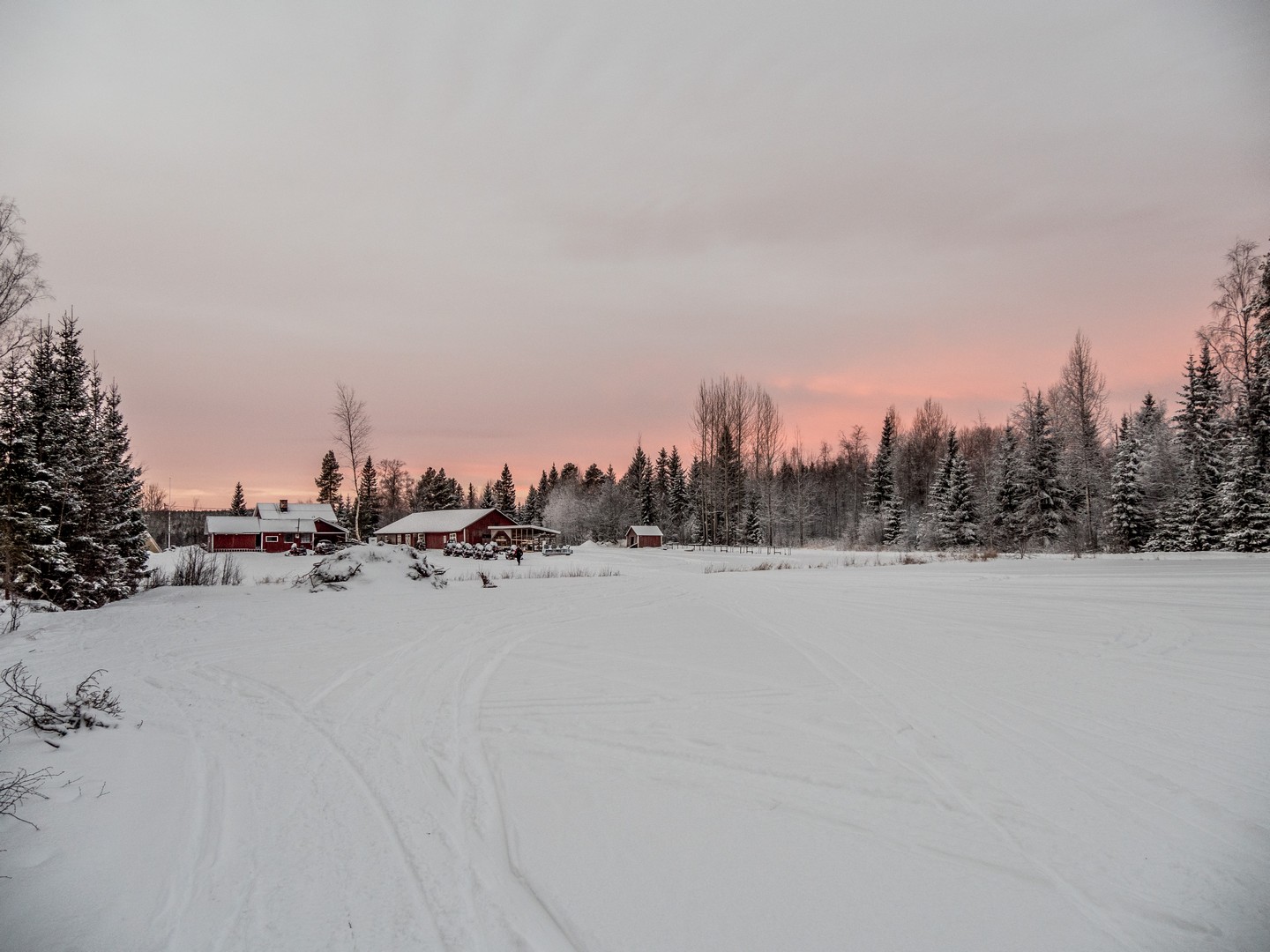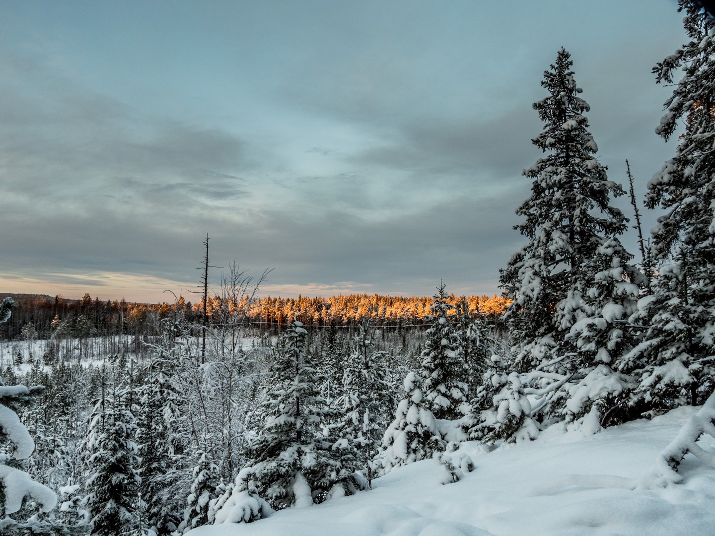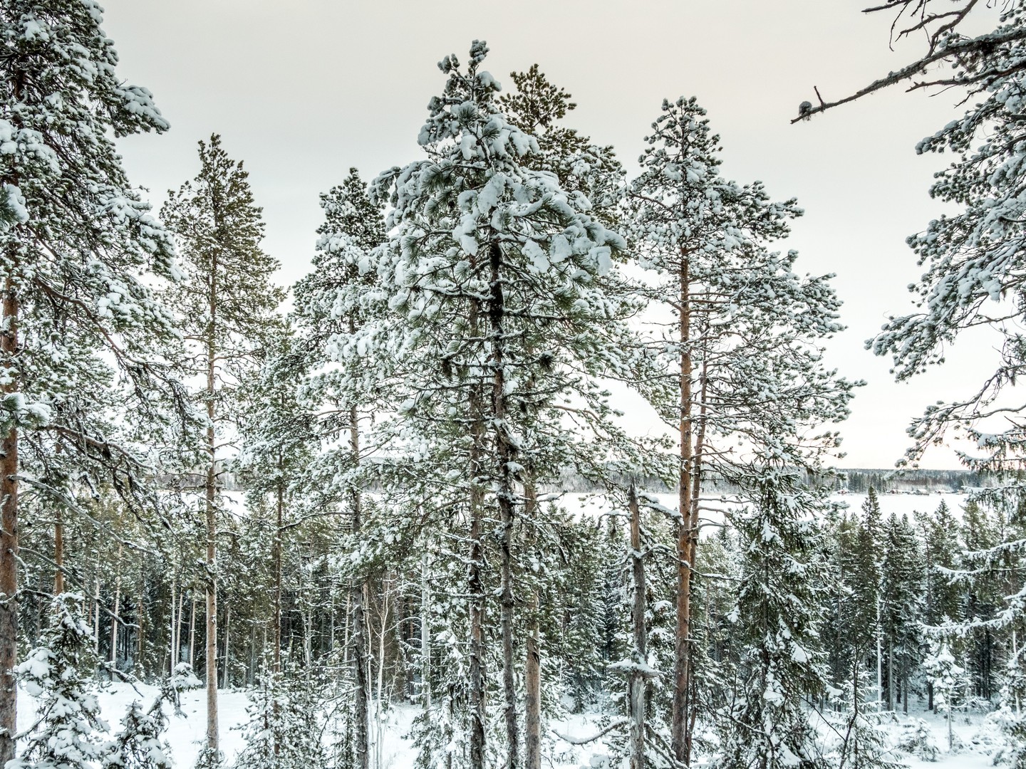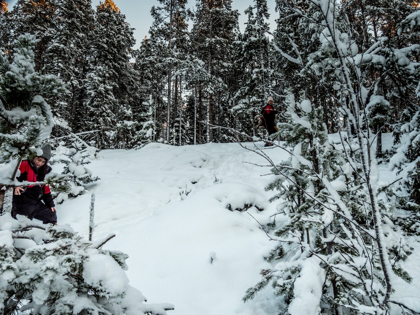Il est 9 h 30, et le soleil se lève seulement. Seuls les sommets des sapins sont éclairés d’une lumière rose-orangée, une douce lumière qui ne nous quittera pas de la journée, car le soleil n’ira pas beaucoup plus haut au-dessus de l’horizon. Enfin tous convenablement équipés, nous nous mettons en route, à la queue-leu-leu, pour rejoindre la forêt. Très vite, nous sommes plongés dans un décor où les couleurs se réduisent à l’essentiel : le blanc immaculé de la neige, les silhouettes sombres des sapins, les nuances pastel du ciel et des combinaisons de mes compagnons de randonnée… Tout est si paisible. On n’entend que le crissement des raquettes sur la neige. Pas de vent, pas d’oiseaux… juste Pontus qui brise de temps en temps le silence, car la balade inclut toujours des informations sur la forêt qui nous entoure, ainsi que quelques techniques de survie « au cas où ».