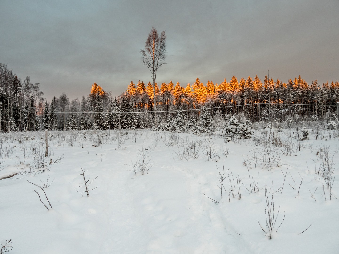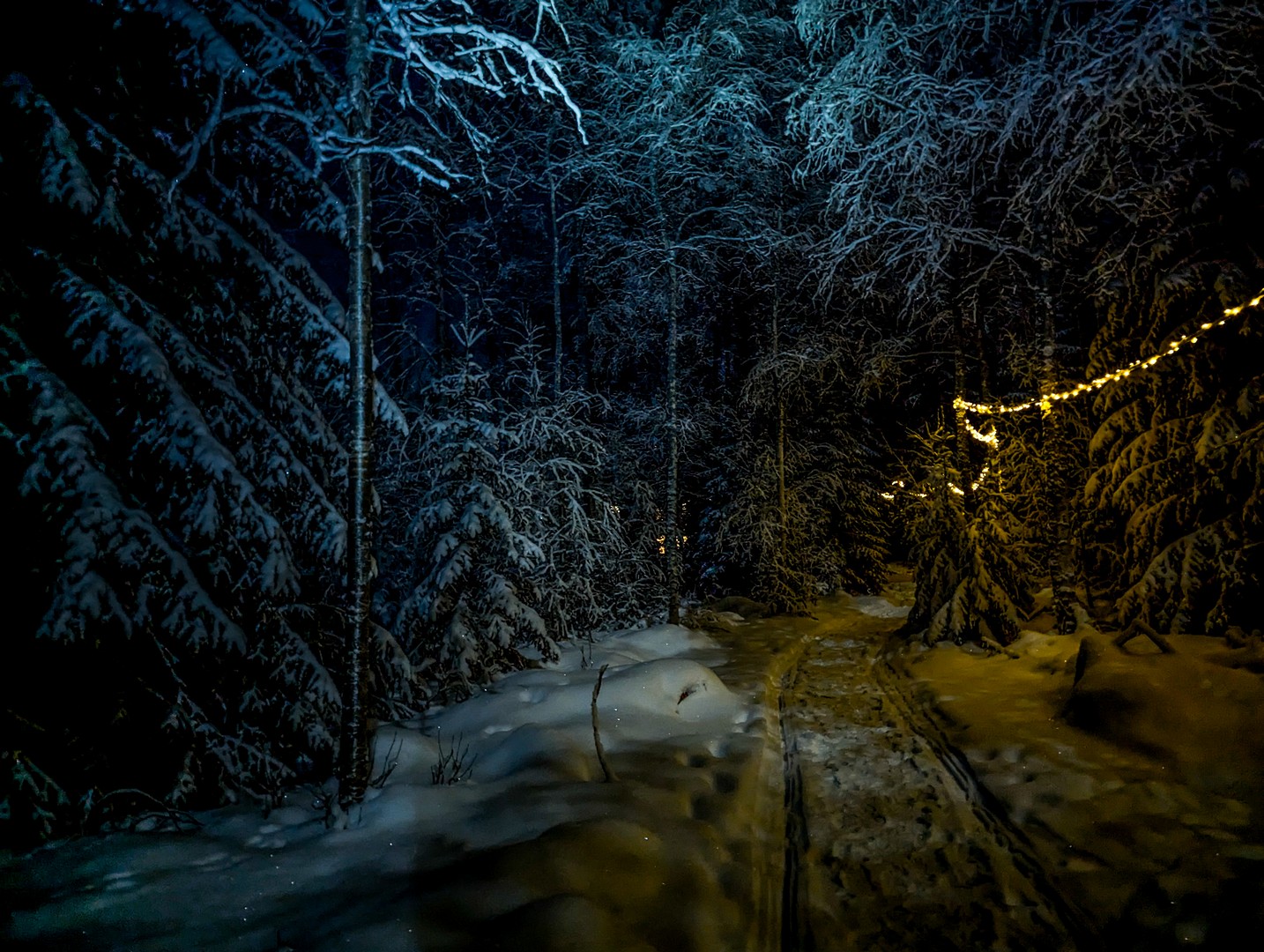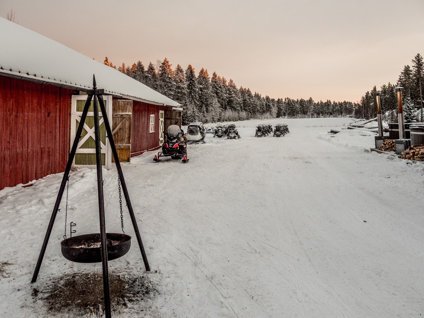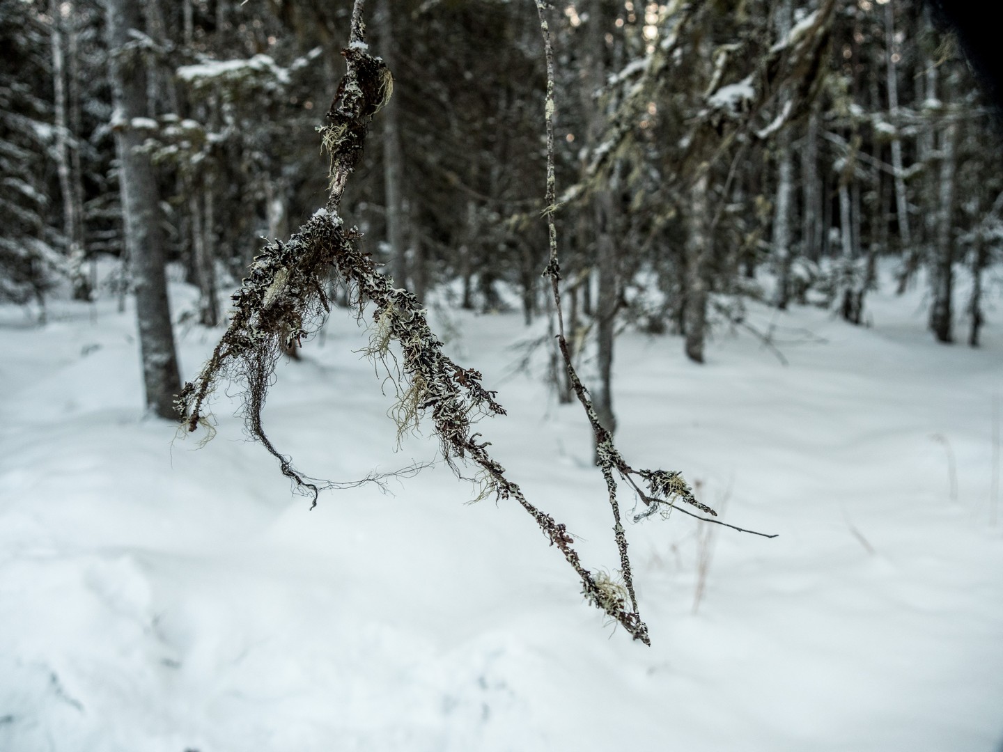 Il est 9 h 30, et le soleil se lève seulement. Seuls les sommets des sapins sont éclairés d’une lumière rose-orangée, une douce lumière qui ne nous quittera pas de la journée, car le soleil n’ira pas beaucoup plus haut au-dessus de l’horizon. Enfin tous convenablement équipés, nous nous mettons en route, à la queue-leu-leu, pour rejoindre la forêt. Très vite, nous sommes plongés dans un décor où les couleurs se réduisent à l’essentiel : le blanc immaculé de la neige, les silhouettes sombres des sapins, les nuances pastel du ciel et des combinaisons de mes compagnons de randonnée… Tout est si paisible. On n’entend que le crissement des raquettes sur la neige. Pas de vent, pas d’oiseaux… juste Pontus qui brise de temps en temps le silence, car la balade inclut toujours des informations sur la forêt qui nous entoure, ainsi que quelques techniques de survie « au cas où ».