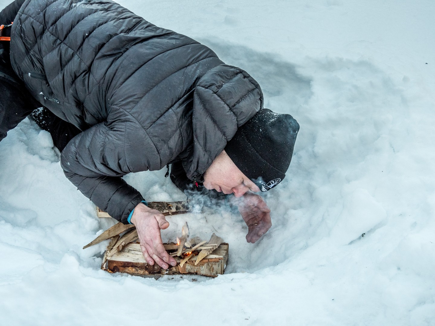 D’ailleurs, après une petite heure, il devra nous faire une démonstration d’allumage de feu en condition de neige ! Nous sommes arrivés au sommet d’une colline avec une jolie vue sur la forêt et, au loin, un des bras de mer qui entourent la région de Luleå.