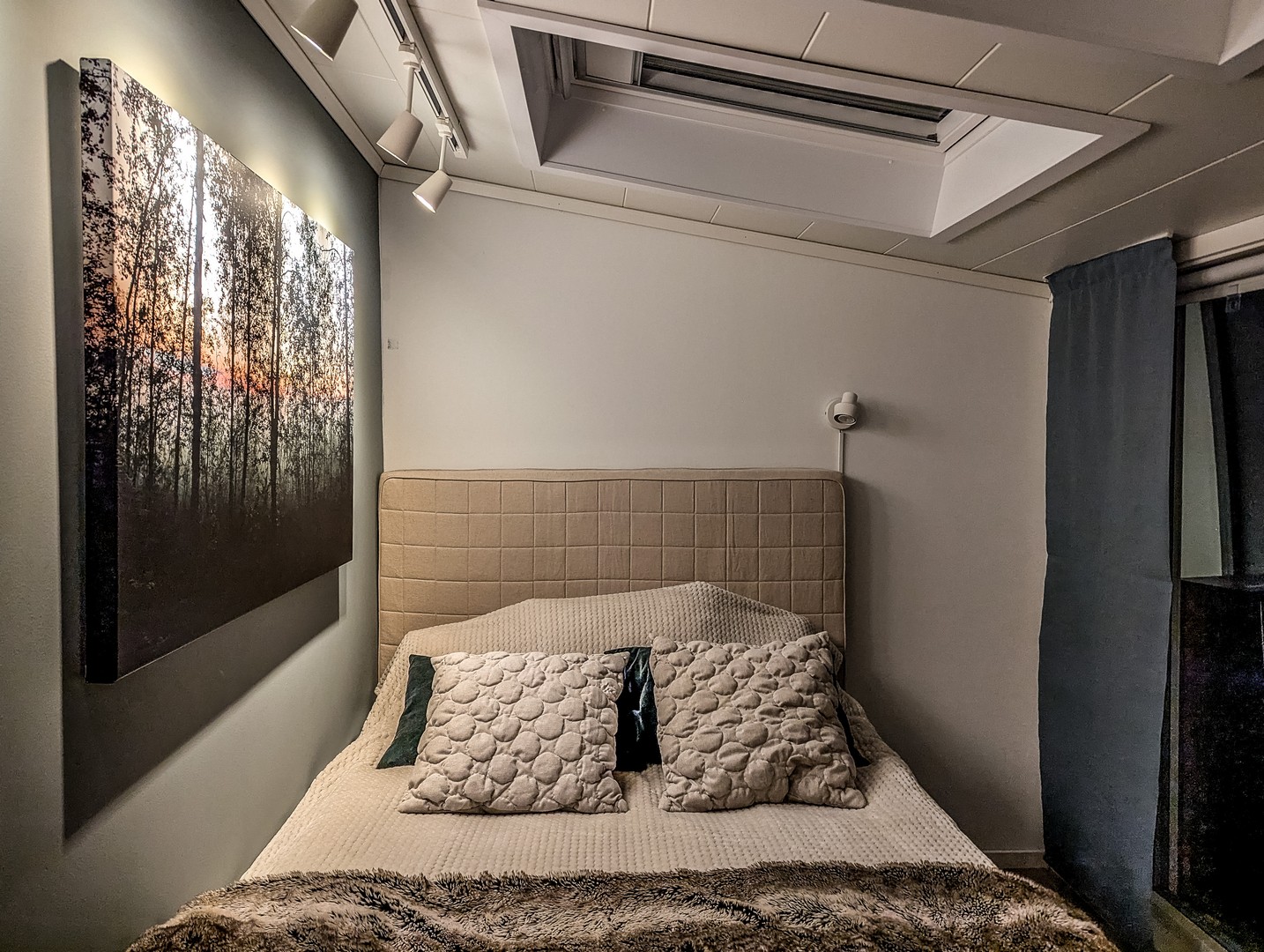 Pour accéder au logement, il faut parcourir un sentier éclairé de petites lumières et bordé de pins. C’est tout simplement magique ! Tous les igloos donnent sur une prairie et sont orientés pour maximiser les chances d’admirer les aurores. L’intérieur des cabines est douillet, élégant et simple, avec un minimalisme nordique caractéristique : un grand lit face à la fenêtre, avec une literie ultra confortable (la meilleure de tout notre voyage), une table, deux fauteuils, des placards, et une théière. Cosy !