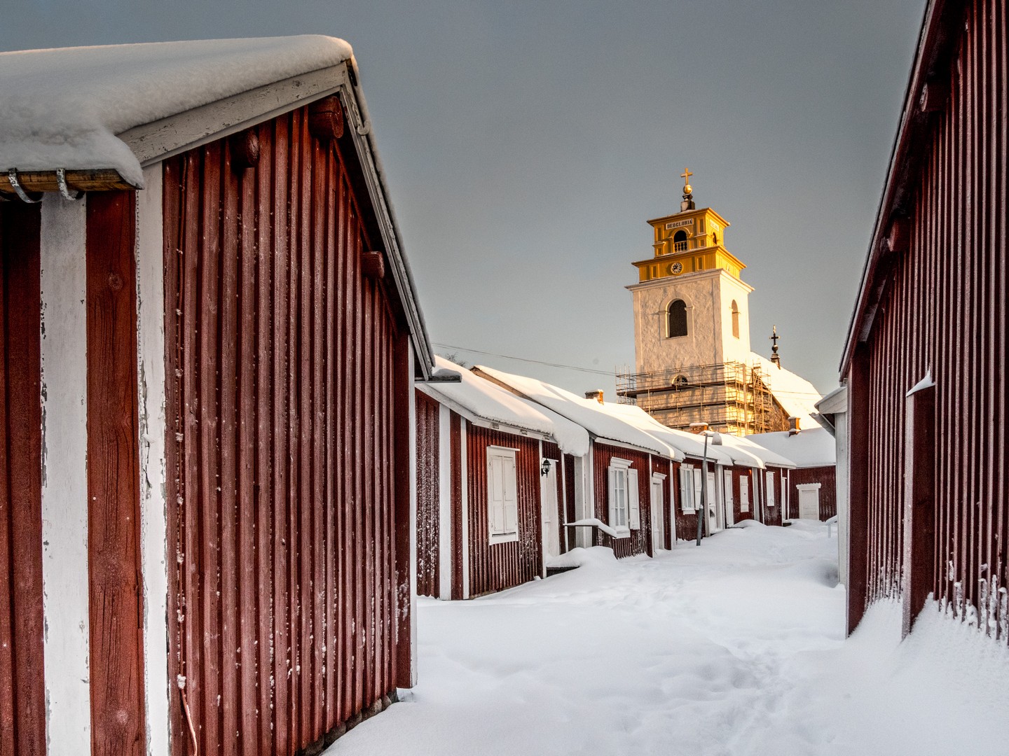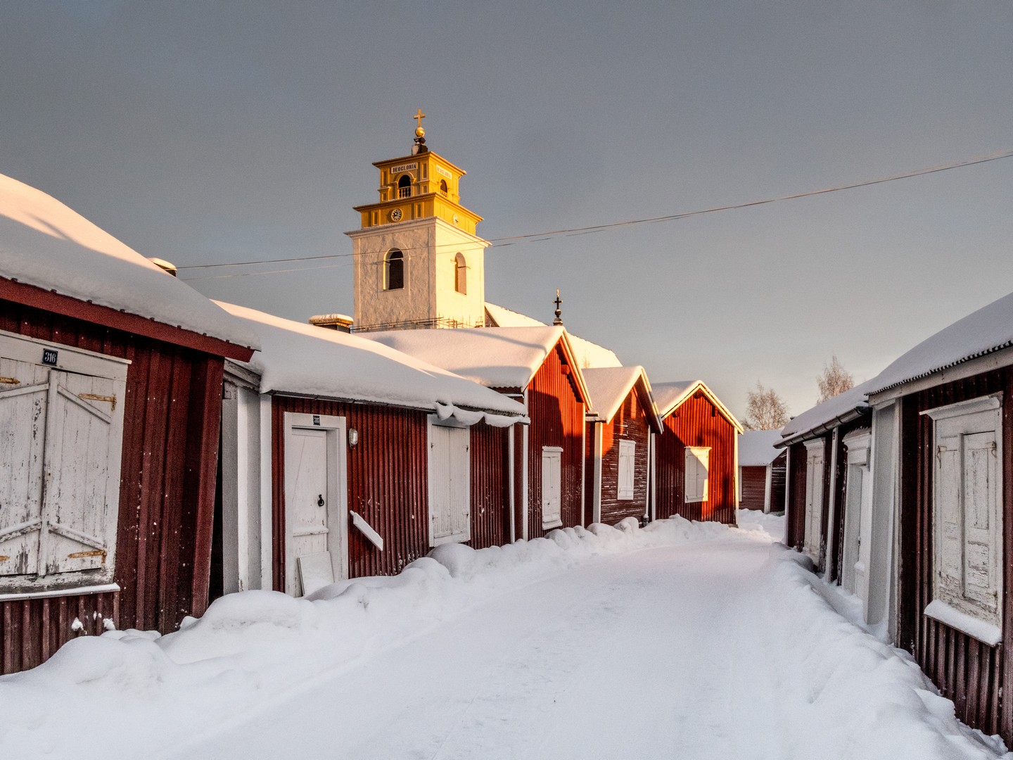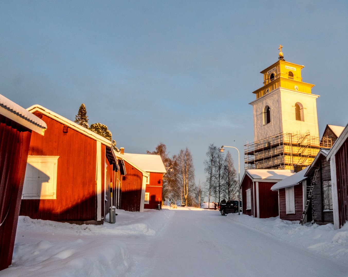 Il est encore tôt lorsque nous quittons Mörön pour rejoindre un des joyaux du nord de la Suède : Gammelstad. En suédois, « Gammelstad » signifie « vieille ville », et pour cause : c’est ici que fut fondée Luleå avant que la ville ne soit « déménagée » plus près de la mer suite à des bouleversements géologiques. À l’origine, simple comptoir commercial, le village s’est transformé en centre religieux avec la construction de l’église de Nederluleå au XVe siècle. La Suède, ayant embrassé la Réforme, imposait alors l’obligation d’assister régulièrement aux services religieux : à moins de 10 kilomètres, tous les dimanches ; à 20 kilomètres, un dimanche sur deux ; à 30 kilomètres, une fois toutes les trois semaines. Mais comment faire en Laponie, où les distances jusqu’à l’église la plus proche étaient bien plus longues ? La solution fut de permettre à chaque famille de construire une maisonnette sur les terres de l’église pour y passer une nuit ou deux. C’est ainsi qu’apparurent les « villes-églises ». On en trouve plusieurs dans le Norrbotten (région nord de la Suède), mais Gammelstad est la mieux préservée avec ses 404 cabanes, ce qui lui a valu d’être inscrite au patrimoine de l’UNESCO.
