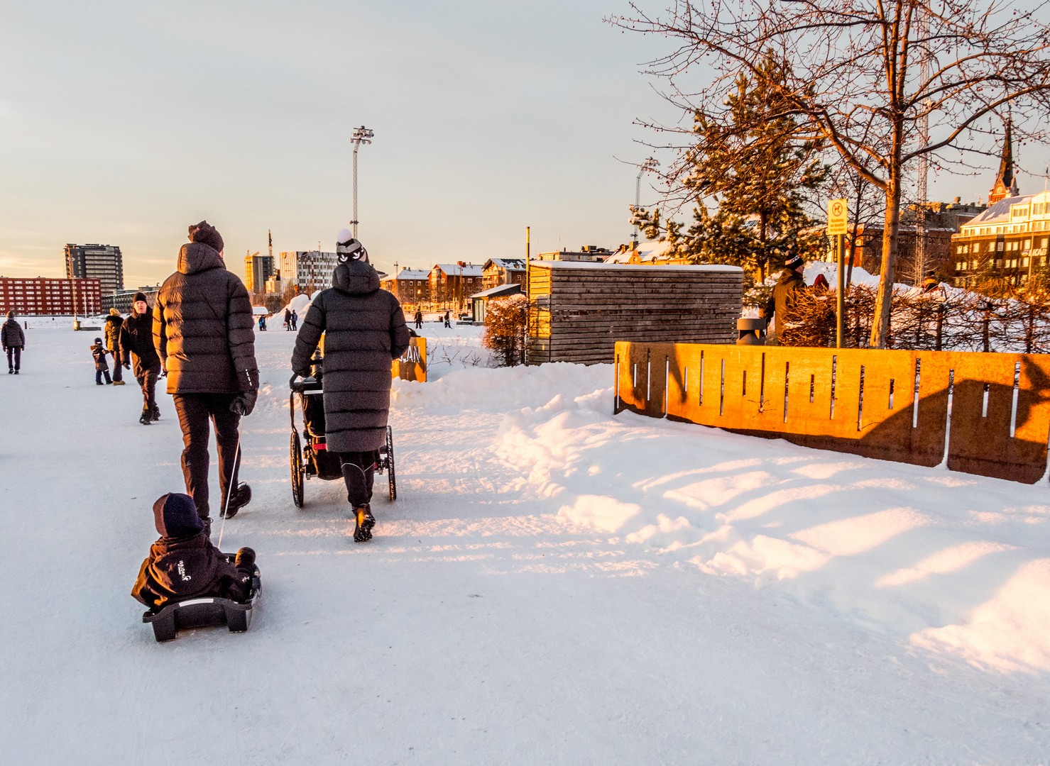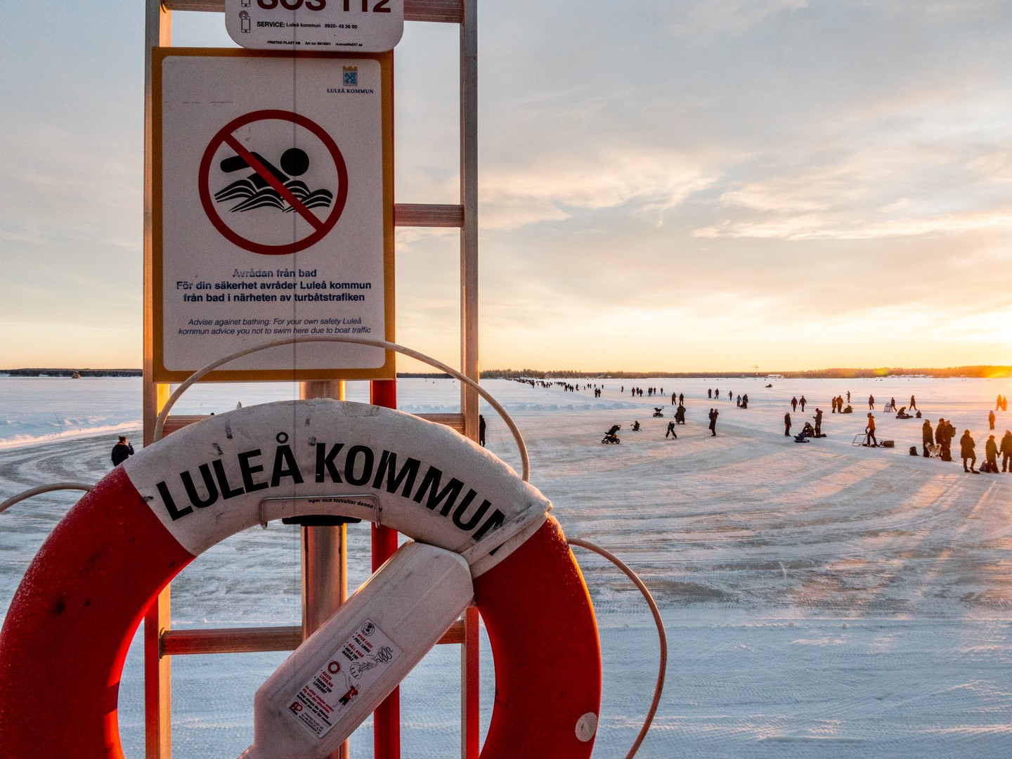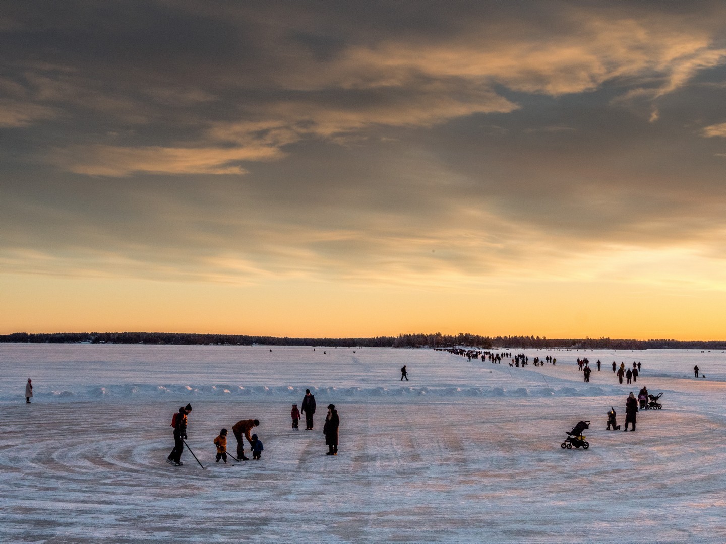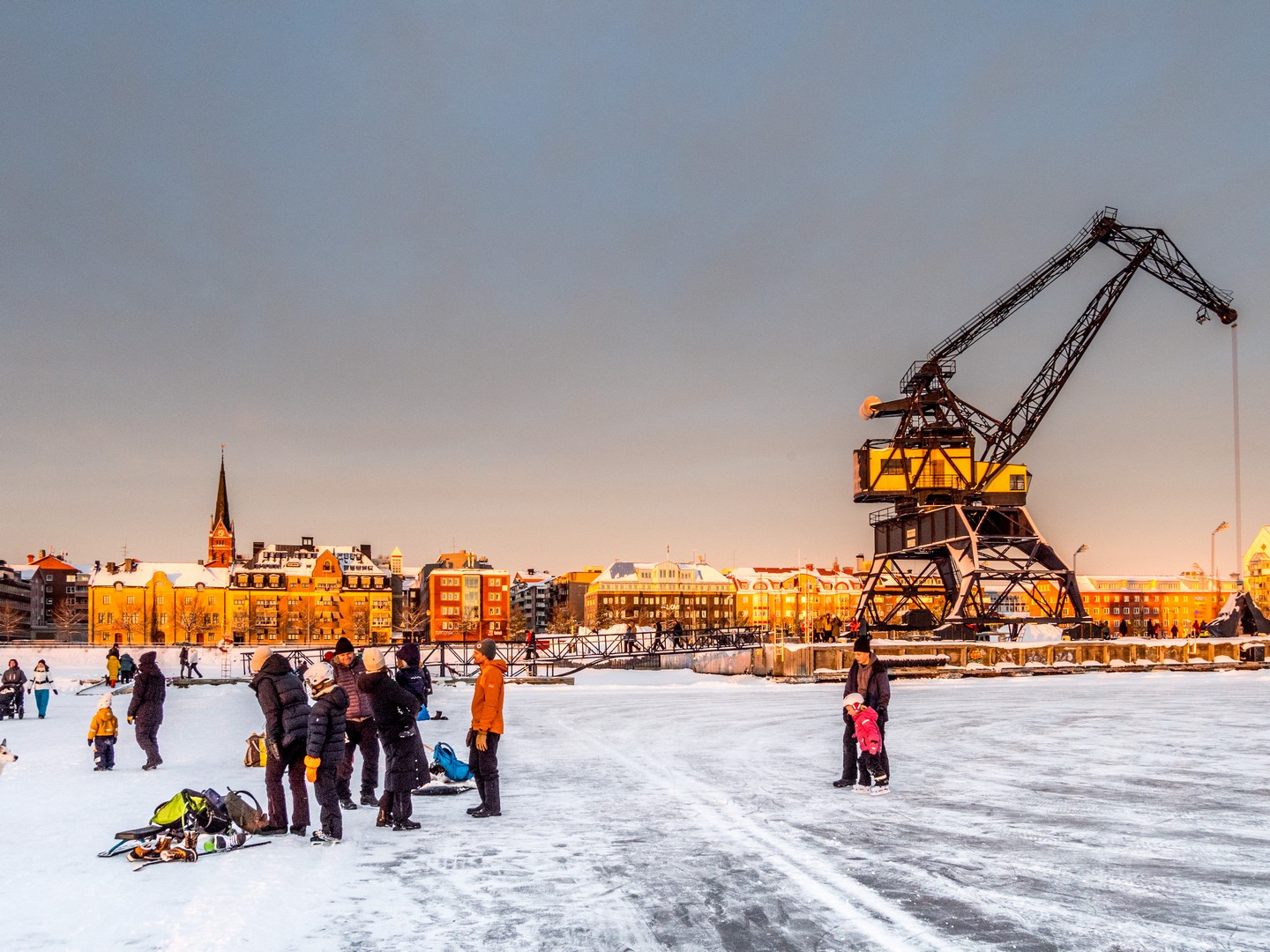 C’est le début de l’après-midi et le soleil se couche sur la ville. Un retour un peu brutal à la civilisation après le calme de la forêt et de Gammelstad. Nous sommes dimanche, il fait beau, il gèle, mais pas trop : c’est la météo idéale pour sortir en famille. Quand on habite en Laponie, on s’emmitoufle et on va se balader sur la patinoire (« Isbanan »), un circuit de 10 kilomètres entre le port nord et le port sud de la ville. On dirait que tout Luleå y est aujourd’hui. Certains en patins, d’autres en kick-sled ou en luge, avec les enfants et même avec le chien. C’est un sacré spectacle et l’ambiance est joyeuse, presque festive. Sous la lumière qui décline, colorant la glace et la neige de nuances orangées, on distingue des milliers de silhouettes qui se rendent en file bien droite vers Gråsjälören, une île de l’archipel de Luleå où un petit café tenu par le Lion’s Club local attend les courageux. On dirait une colonie de fourmis en mouvement !