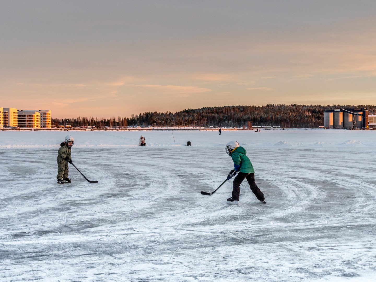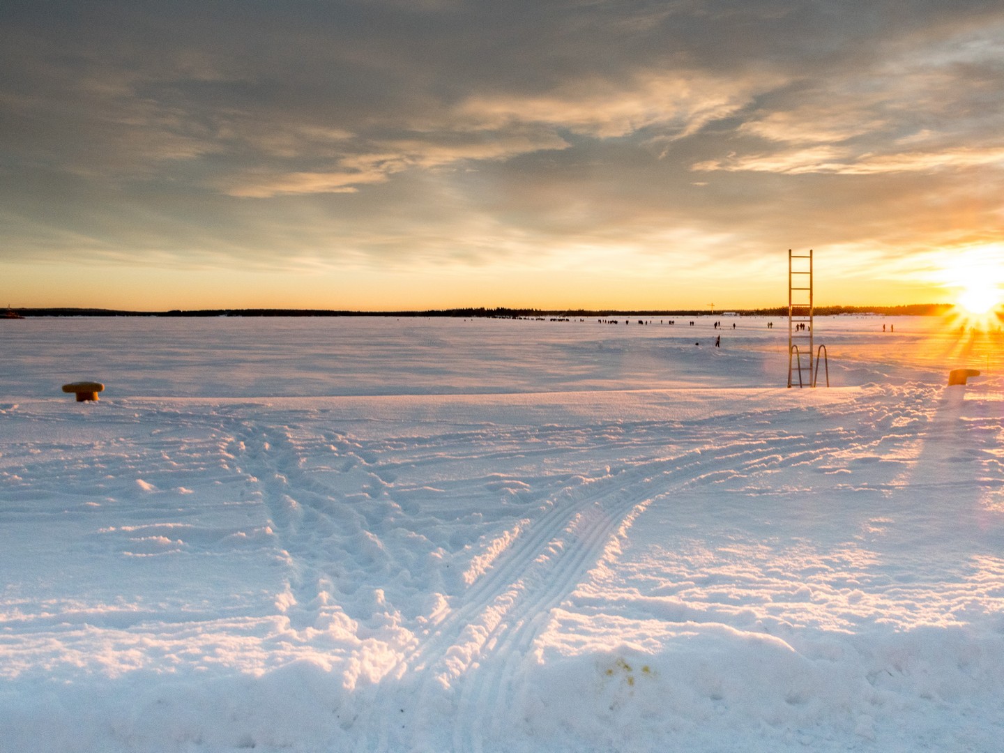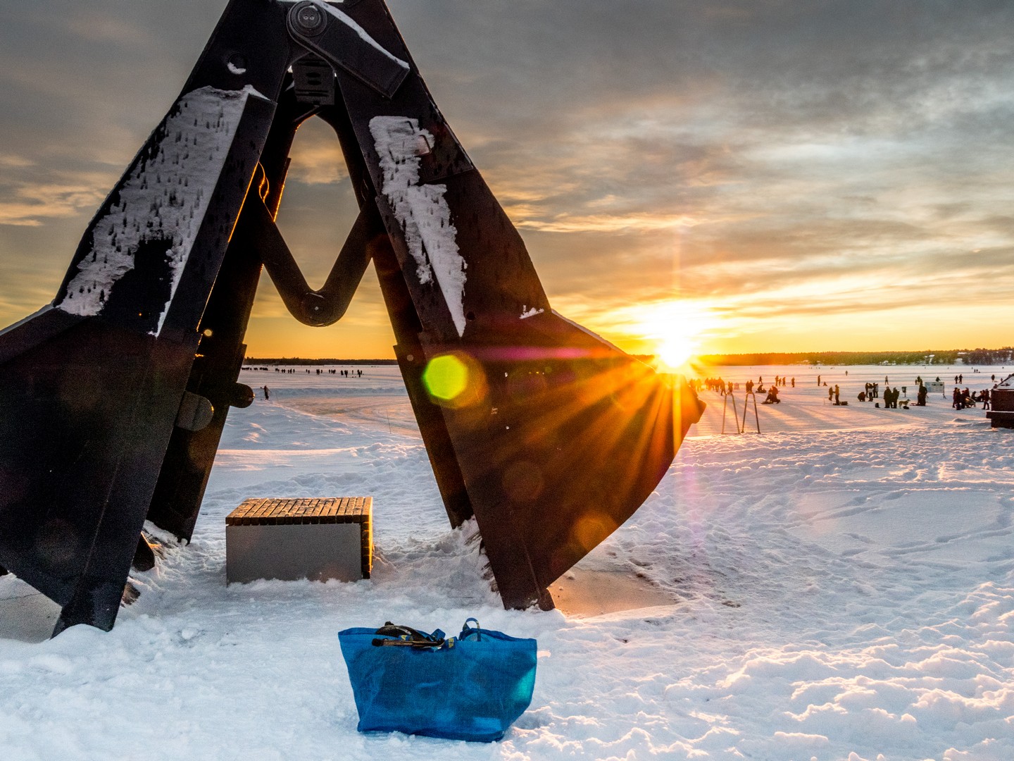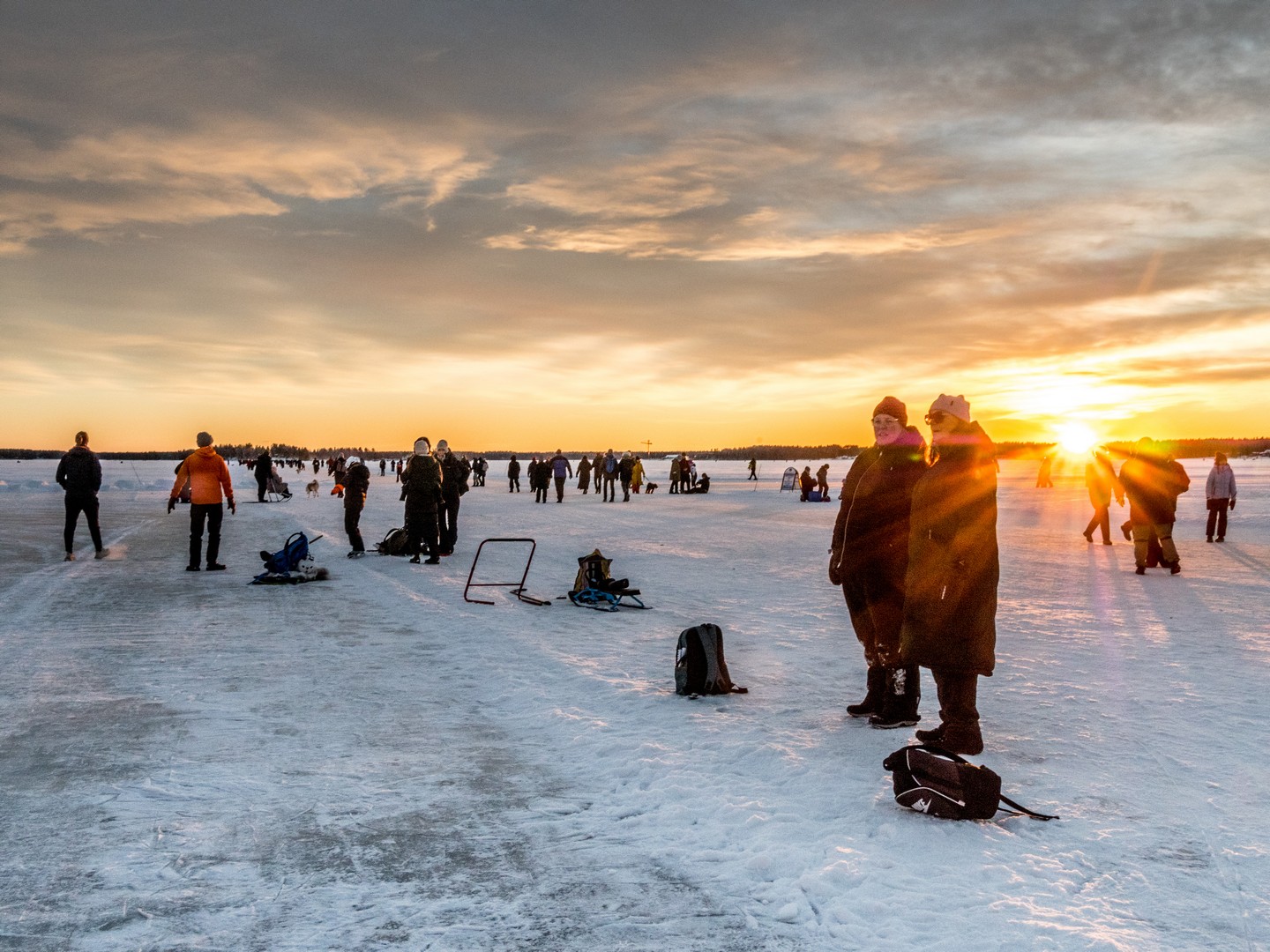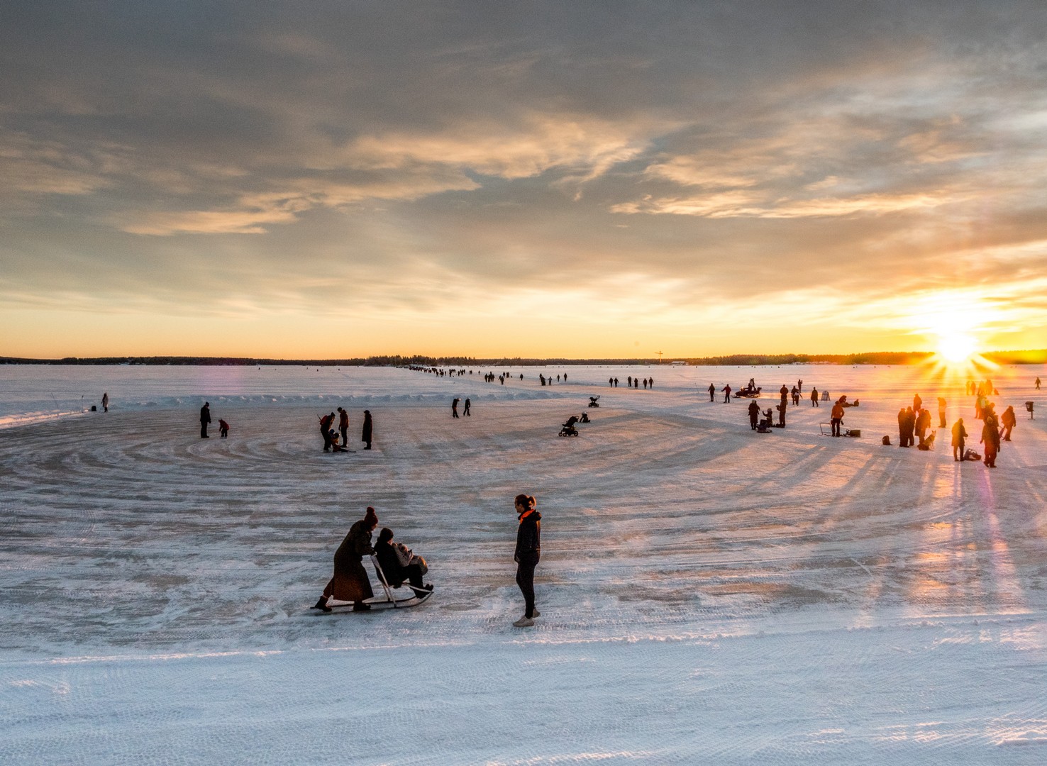 C’est le début de l’après-midi et le soleil se couche sur la ville. Un retour un peu brutal à la civilisation après le calme de la forêt et de Gammelstad. Nous sommes dimanche, il fait beau, il gèle, mais pas trop : c’est la météo idéale pour sortir en famille. Quand on habite en Laponie, on s’emmitoufle et on va se balader sur la patinoire (« Isbanan »), un circuit de 10 kilomètres entre le port nord et le port sud de la ville. On dirait que tout Luleå y est aujourd’hui. Certains en patins, d’autres en kick-sled ou en luge, avec les enfants et même avec le chien. C’est un sacré spectacle et l’ambiance est joyeuse, presque festive. Sous la lumière qui décline, colorant la glace et la neige de nuances orangées, on distingue des milliers de silhouettes qui se rendent en file bien droite vers Gråsjälören, une île de l’archipel de Luleå où un petit café tenu par le Lion’s Club local attend les courageux. On dirait une colonie de fourmis en mouvement !