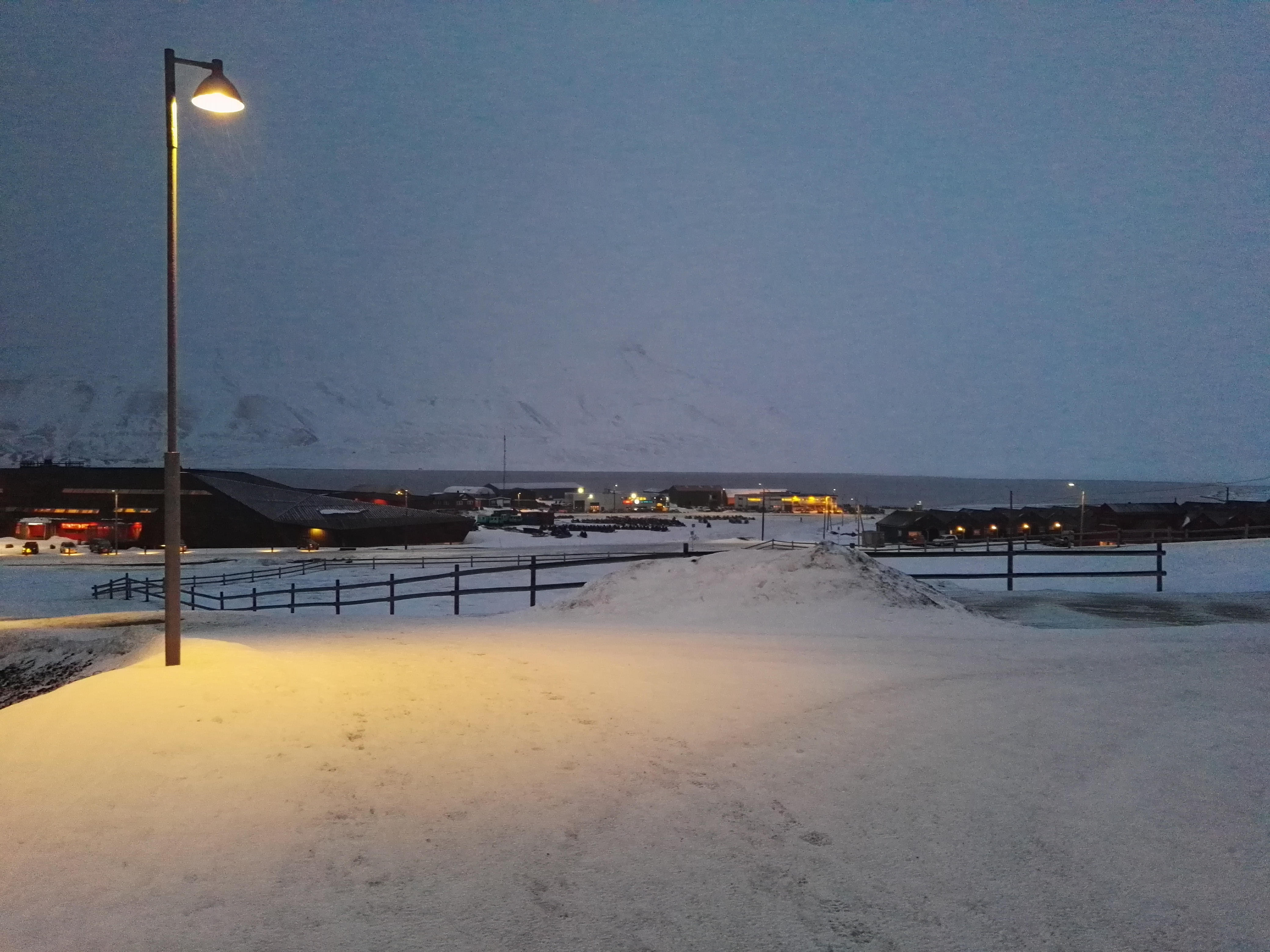 Enfin, je fais mes premiers pas "d'exploratrice" au Svalbard. J'ai l'impression d'être dans un étrange film à la fois beau et un peu angoissant. Avec la nuit qui tombe, le paysage blanc devient bleu, le vent souffle, souffle, et souffle encore et sur les flancs des montagnes qui entoure la vallée où s'est établie Longyearbyen, il y a des tas d'espèce de pylônes qui font un bruit étrange. Une espèce de souffle fantomatique, plaintif... Non, ce n'est pas ici le monde du silence. Désormais, ce bruit sera celui du Svalbard pour moi. Pendant que je marche et que j'admire le paysage!, je ne réalise pas que j'ai oublié portefeuille et carte de banque. Cata ! Ca me servira de leçon : ne JAMAIS oublier quoi que ce soit lorsqu'on part ne faire ne fut-ce que des courses, sinon c'est un calvaire. Une grosse heure plus tard, me voilà arrivée en ville.