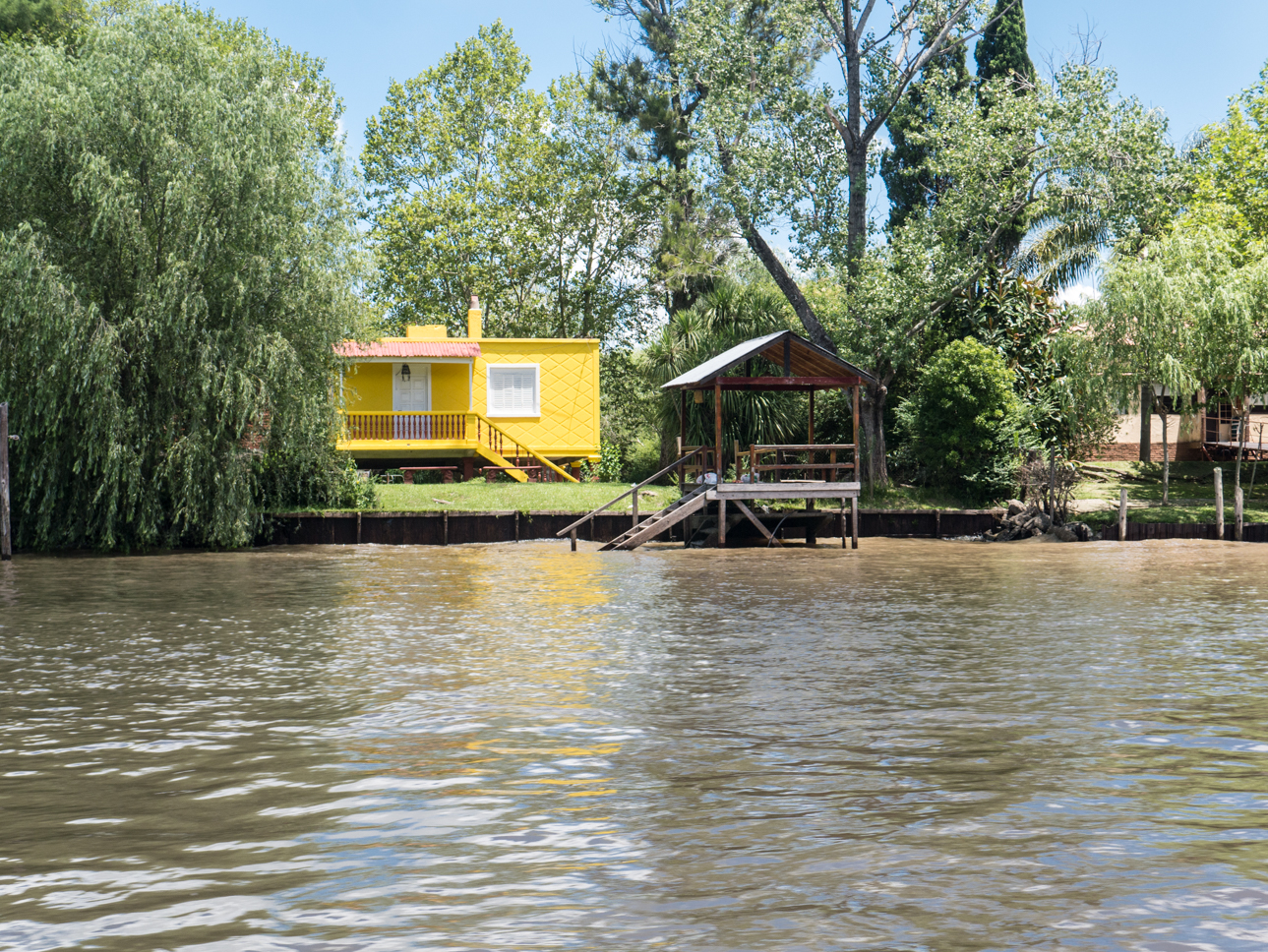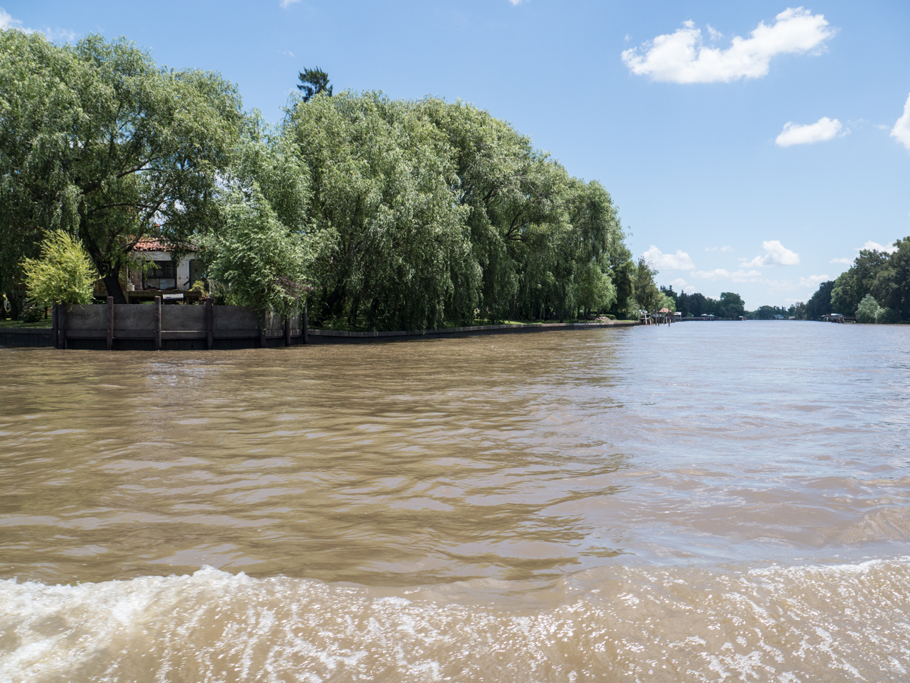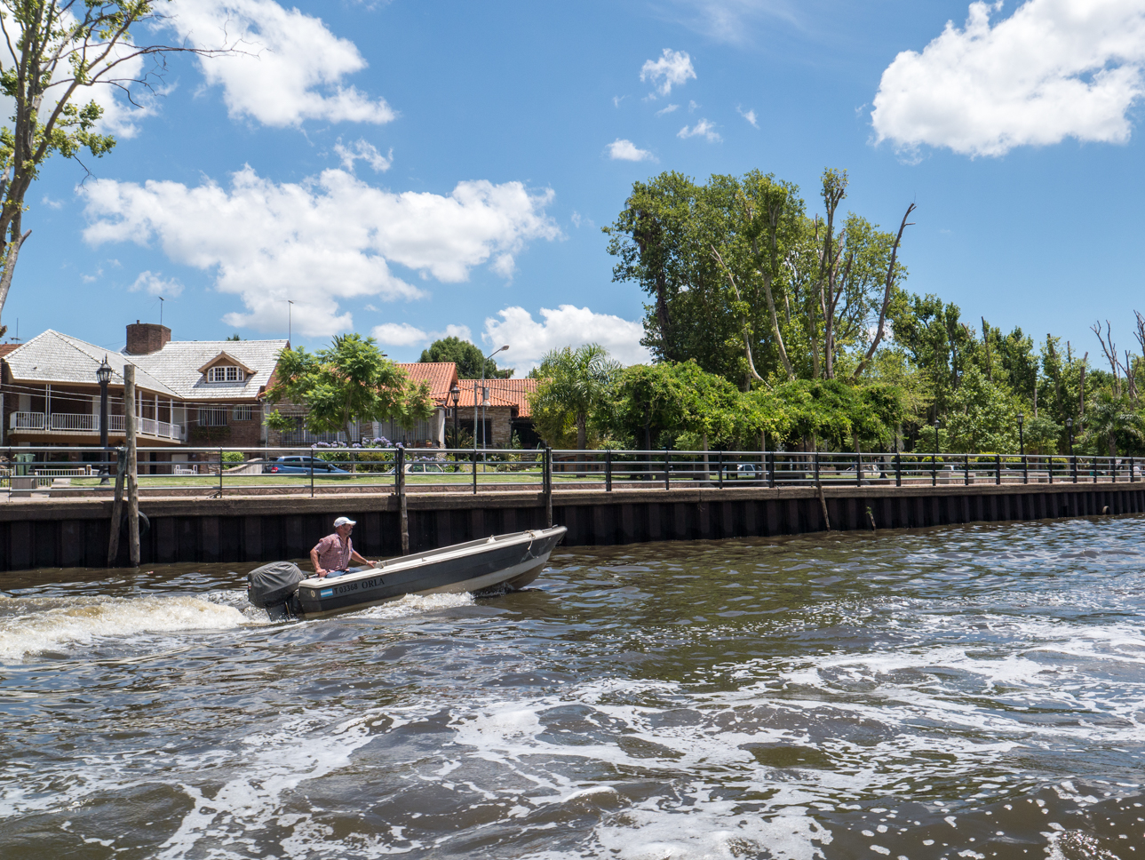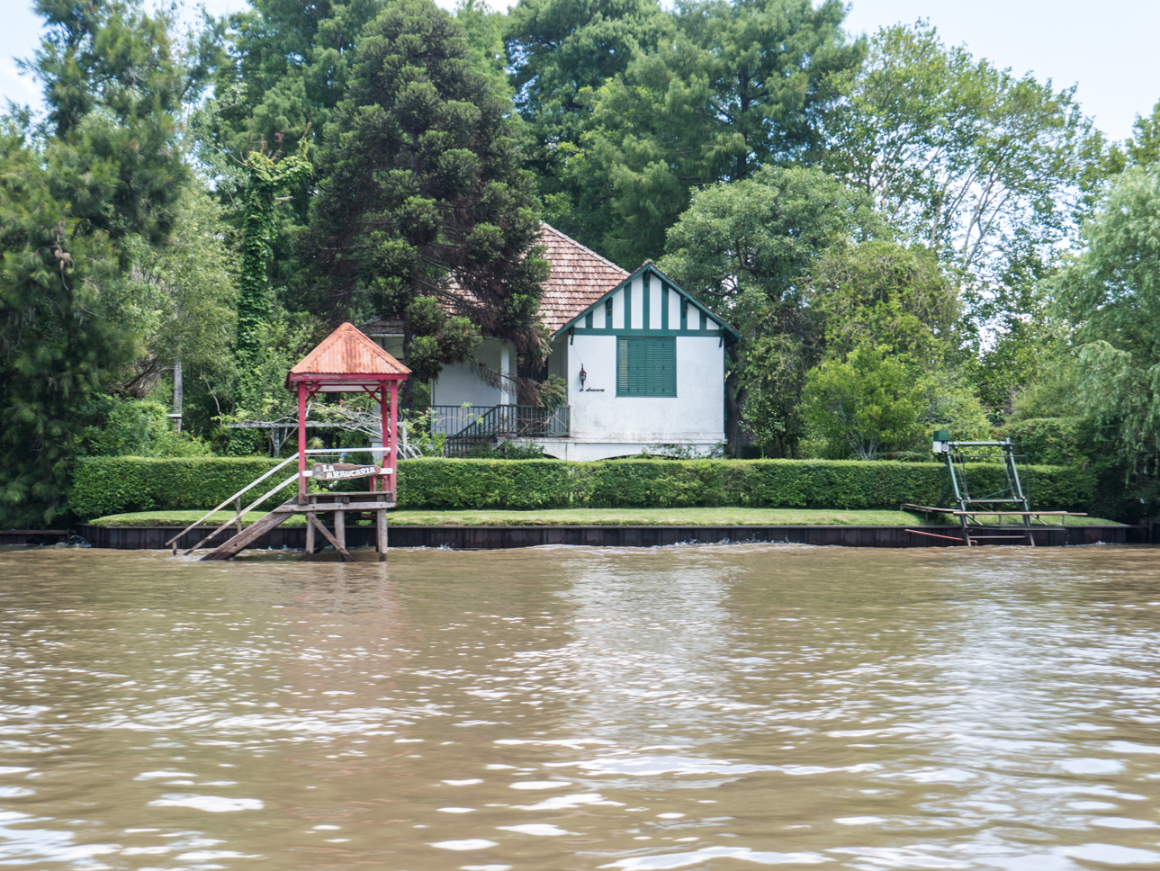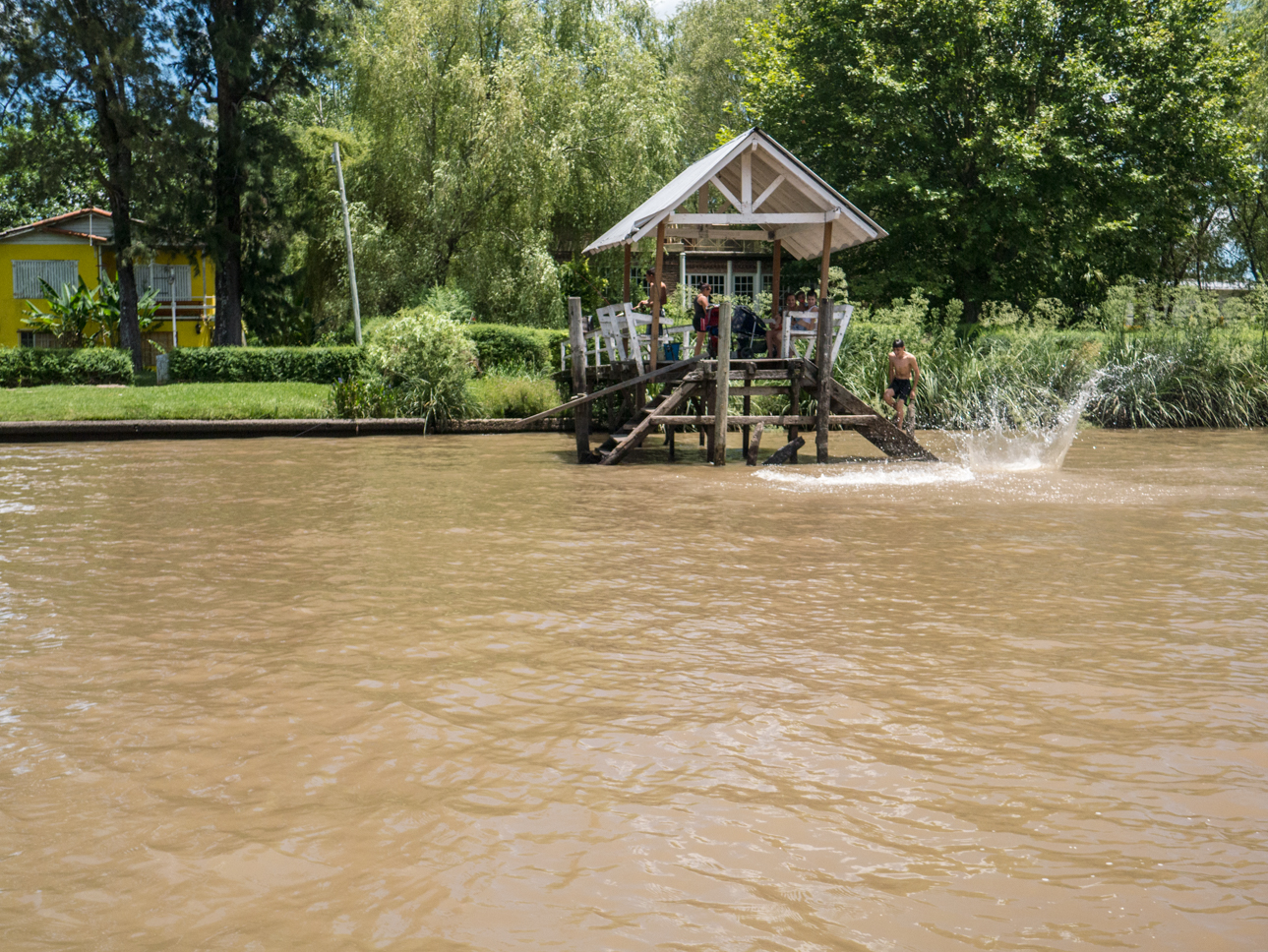Tigre, c’est un centre-ville en bord de fleuve et des myriades de petites îles à fleur d’eau. Les maisons y sont presque toutes sont construites sur pilotis, et il y en pour tous les goûts : de la grande villa à la modeste cabine de pêcheur. Toutes ont un ponton et une barque à moteur… Comme je vais vite le découvrir lors de cette balade dans le delta, tout passe par la rivière : le courrier par exemple, ou les courses, qui sont acheminées en bateau. Tout un mode de vie bien différent de celle de la capitale, alors que seulement 30 kilomètres les séparent. Parmi les gens qui y habitent à l’année, une bonne poignée d’artistes… et pas mal de familles ! Au début de la balade, ce qu’on peut voir n’est pas très engageant. On passe à côté du port et d’un parc d’attraction un peu décati (le Parque de la Costa). On croise même des péniches chargées de bois (souvenir de l’époque où Tigre était sur la route des exploitations du bois et des fruits). Il y a même quelques épaves qui rouillent sur les rives. Par contre, dès que l’on quitte les voies principales, très soumises au trafic et donc dangereuses, il y a plein d’enfants que l’on voit se jeter depuis les pontons dans l’eau couleur café au lait du Delta. Une eau chargée de limon et de minéraux, venant du fin fond du continent. Elle n’a pas l’air engageante comme çà, mais à voir tous ces gamins s’ébattre dans l’eau, ça donne envie !