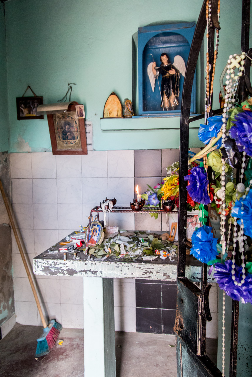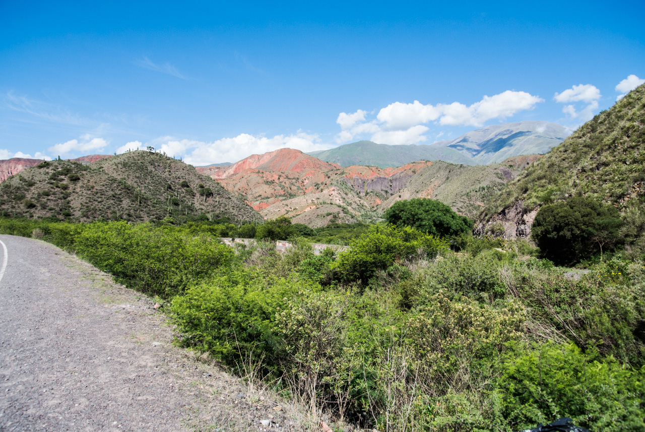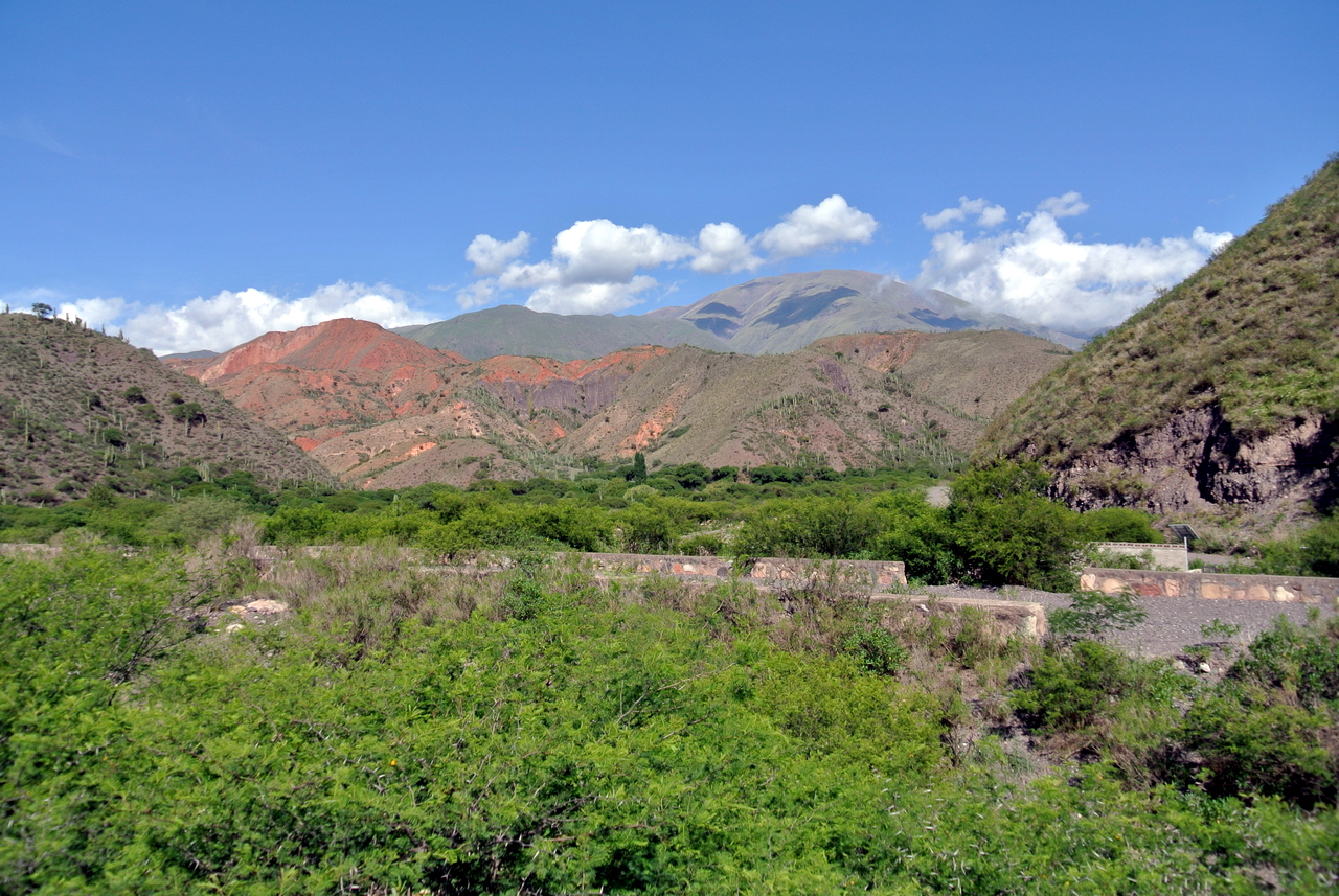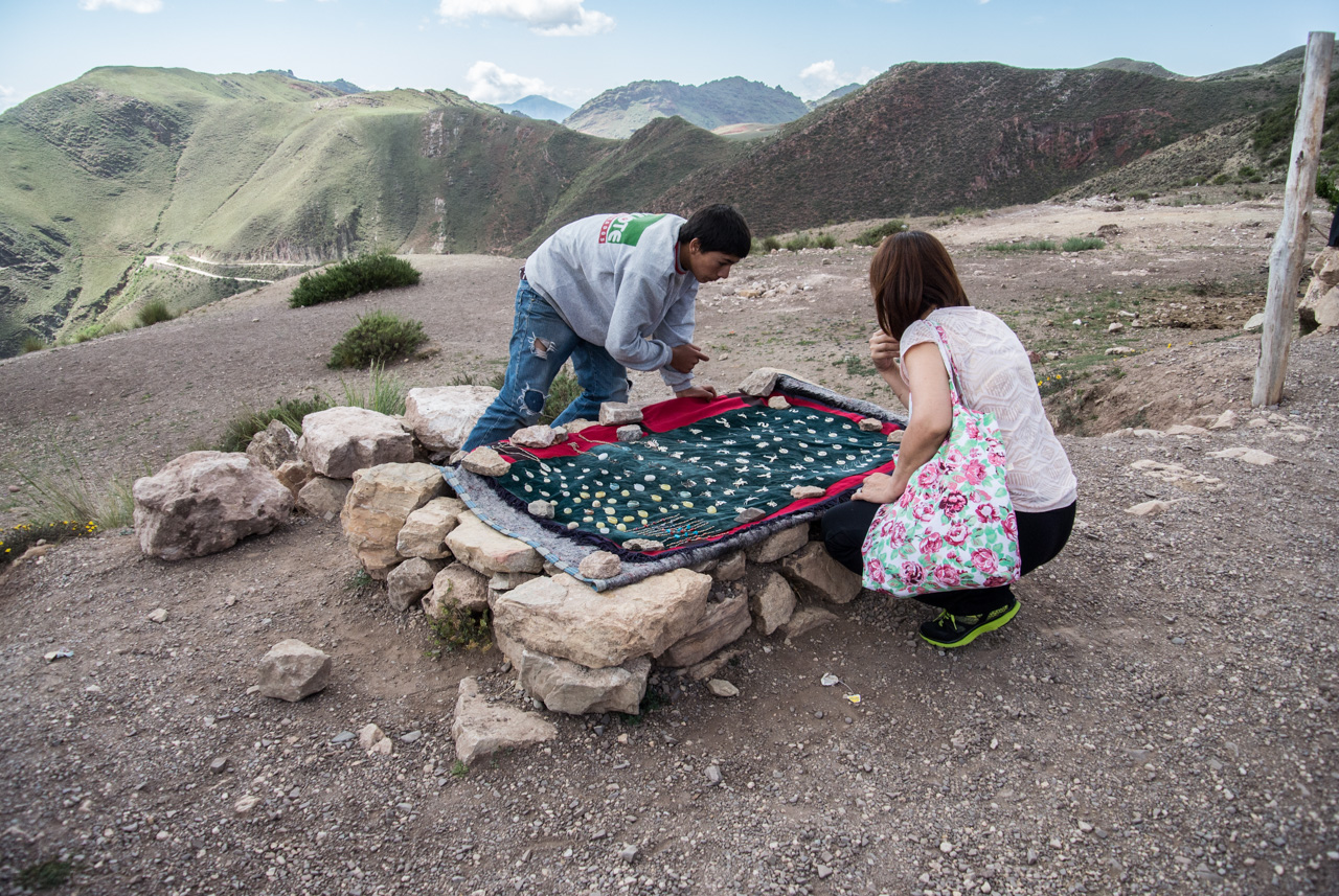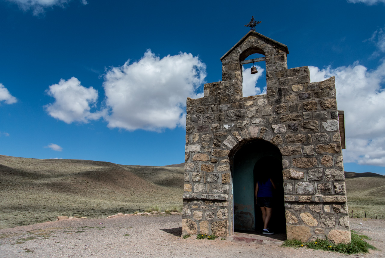 Tôt le matin, le mini-bus vient chercher les valeureux passagers et en route pour les Vallées Calchaquies. A début, tout est vert, nous traversons les champs de tabacs dans la vallée avant de commencer à monter dans de vertes collines recouvertes de forêt. Premier arrêt : le pont qui enjambe l’Escoipe. La Quebrada de Escoipe montre une gorge escarpée, avec une végétation luxuriante, quasi tropicale mais soudain, la route se met à monter : c’est la « Cuesta del Obispo » une route qui grimpe en lacet jusqu’à 3348 mètres ! Petit à petit, on monte, monte, monte, chaque zigzag permettant un point de vue superbe sur un paysage de plus en plus sauvage et aride. C’est incroyable, alors que nous venons à peine de quitter une vallée si fertile. Au sommet, nous voilà arrivés à une chapelle : la Piedra del Molino (attention à l’altitude en sortant du véhicule). La chapelle est dédiée à l’archange Raphaël mais à l’intérieur, les rites andins subsistent. Sur le petit autel, on y trouve des feuilles de coca et du tabac, à côté des fleurs et images saintes. Le genre d’offrande faite à la Pachamama, la Terre-mère des Incas. Le paysage est à couper le souffle. Avec ce ciel bleu, les montagnes pelées et multicolores dévoilent leurs couleurs : du vert, du rouge, de l’ocre, de l’orange.