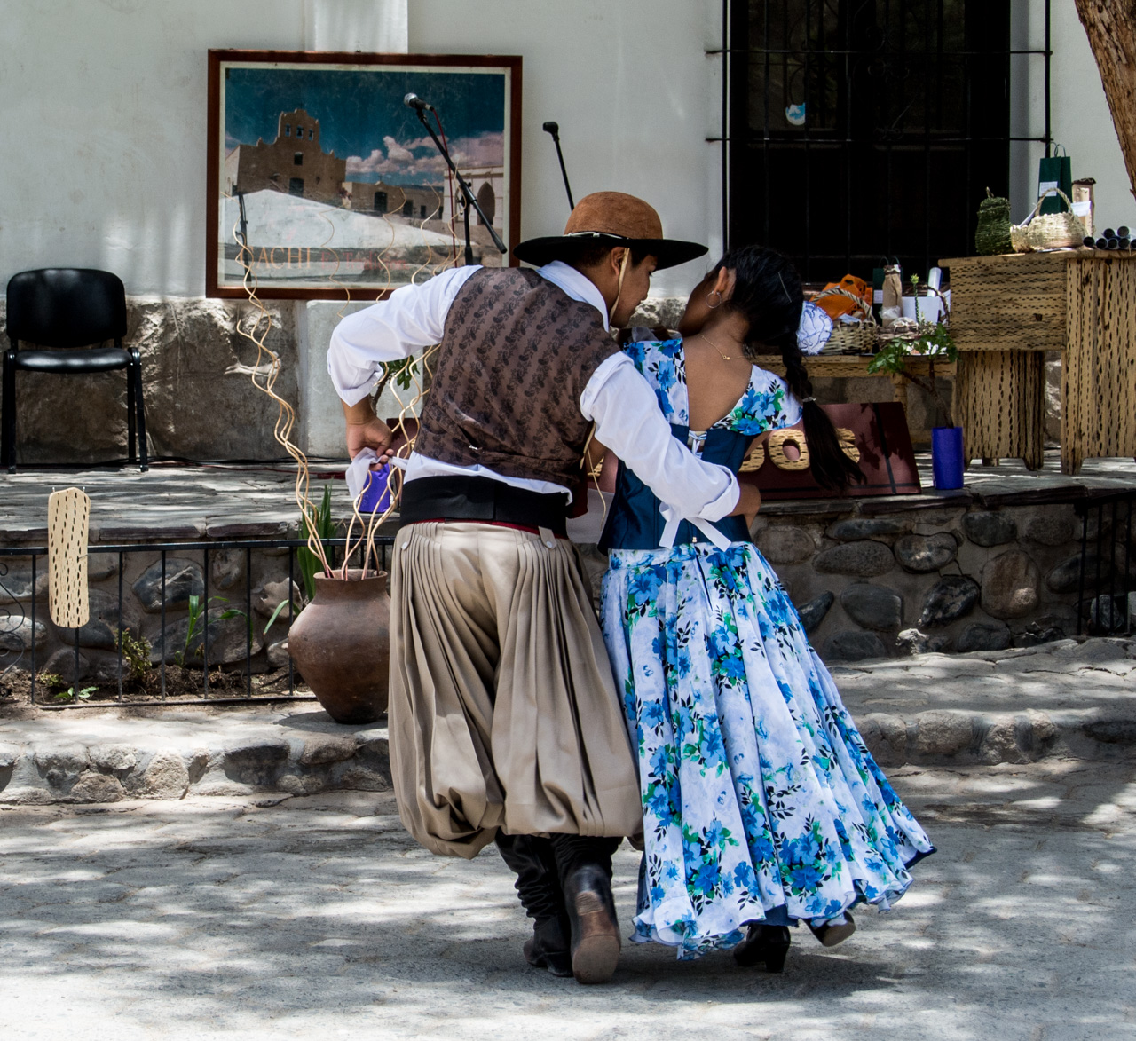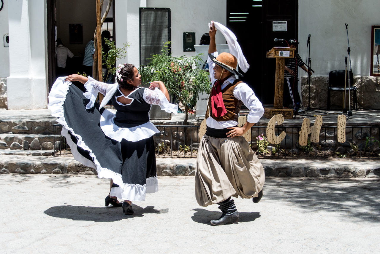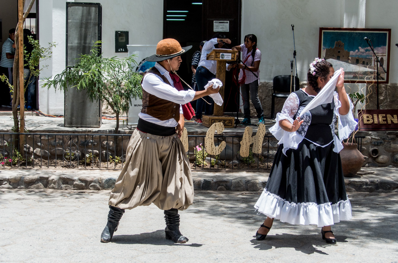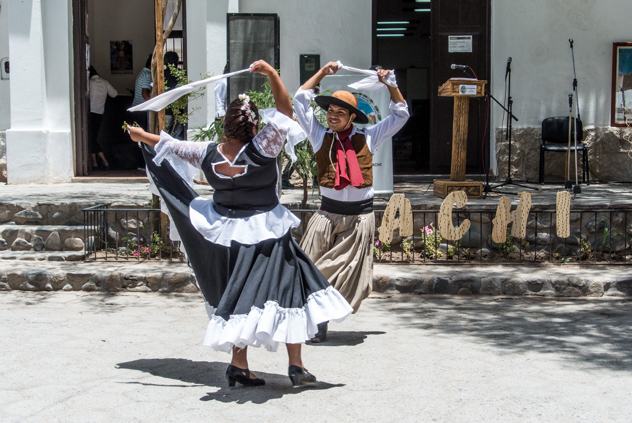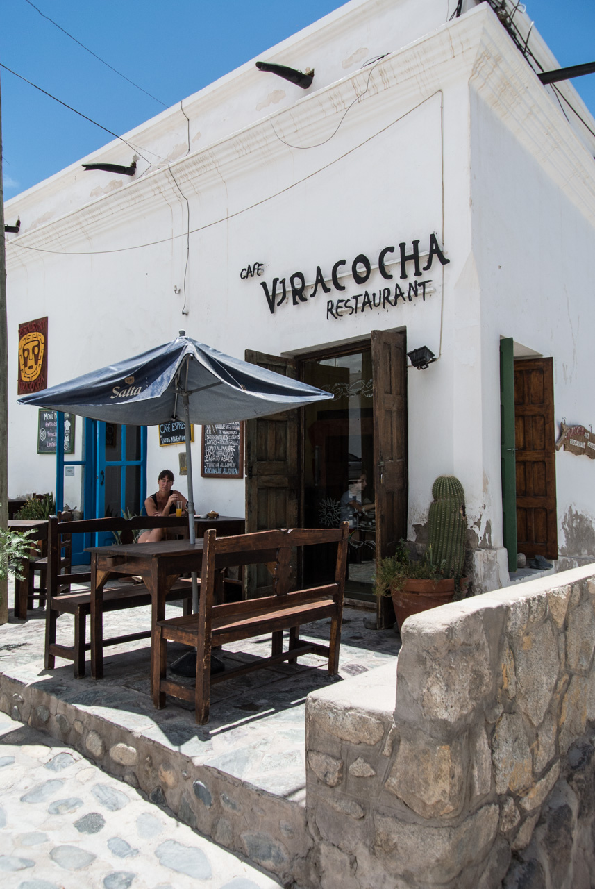 Finalement, nous arrivons à notre destination : Cachi. Une jolie petite ville, aux rues pavées, aux maisons en psé et au grand ciel bleu. Cachi est un vrai livre d’imagine et au milieu de tout ça, l’inévitable parc/plaza centrale où se termine un concours de danse. Malgré l’altitude, il fait chaud. Très chaud. Je vais trouver refuge à une terrasse sous les arbres du parc. Je crève la dalle, c’est le moment de tester autre chose que les empanadas. Je me décide donc pour l’humita : un ballotin de pâte de maïs relevé avec des épices et des oignons, enroulé dans des feuilles de maïs puis cuit soit au four, soit à l’eau. Le genre de truc qui vous tient au corps, même à petite dose. Le goût est surprenamment doux et subtil à mon palais maintenant habitué aux saveurs diverses des empanadas.
