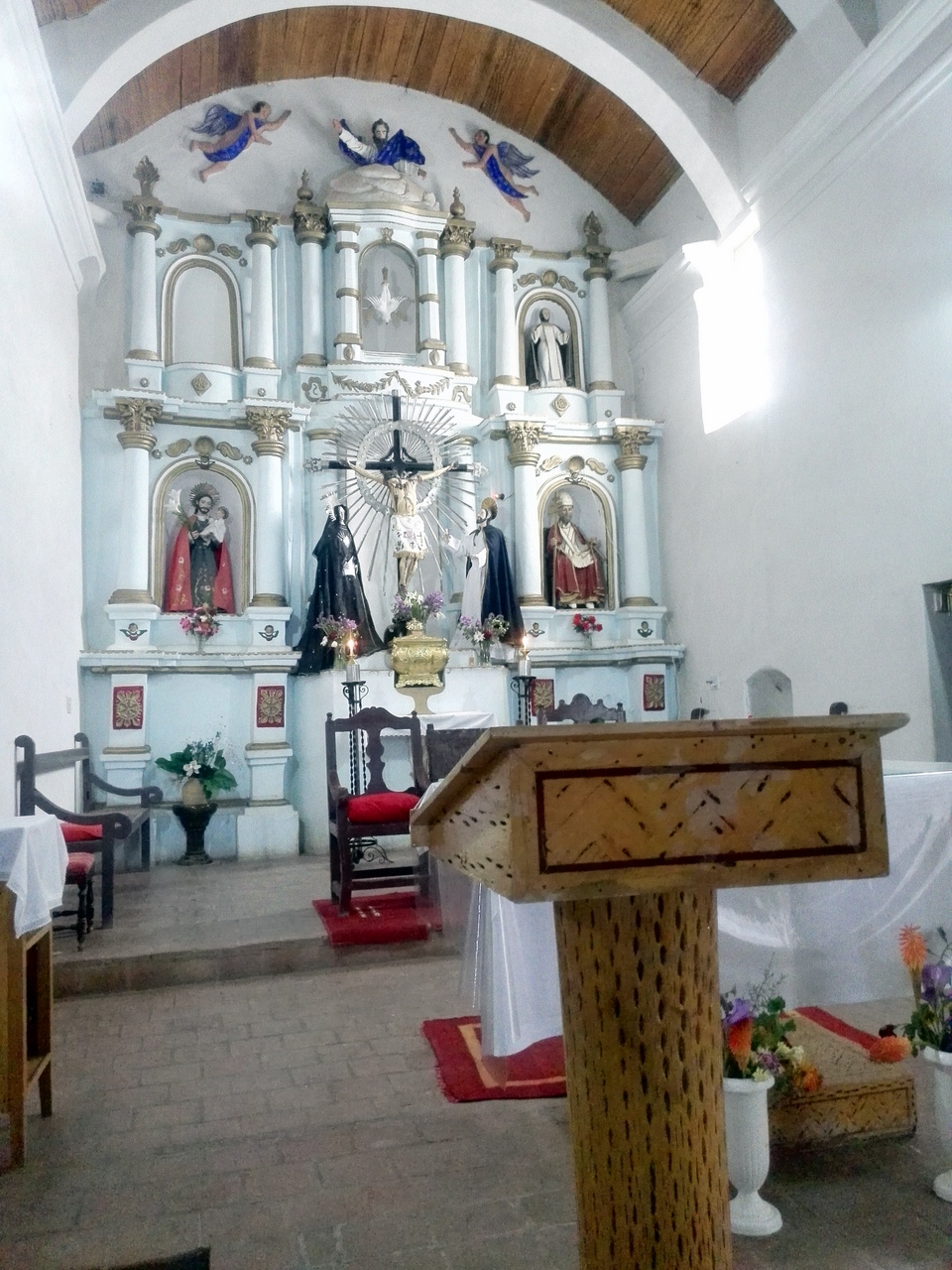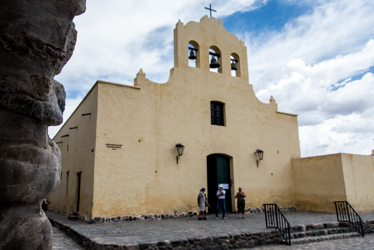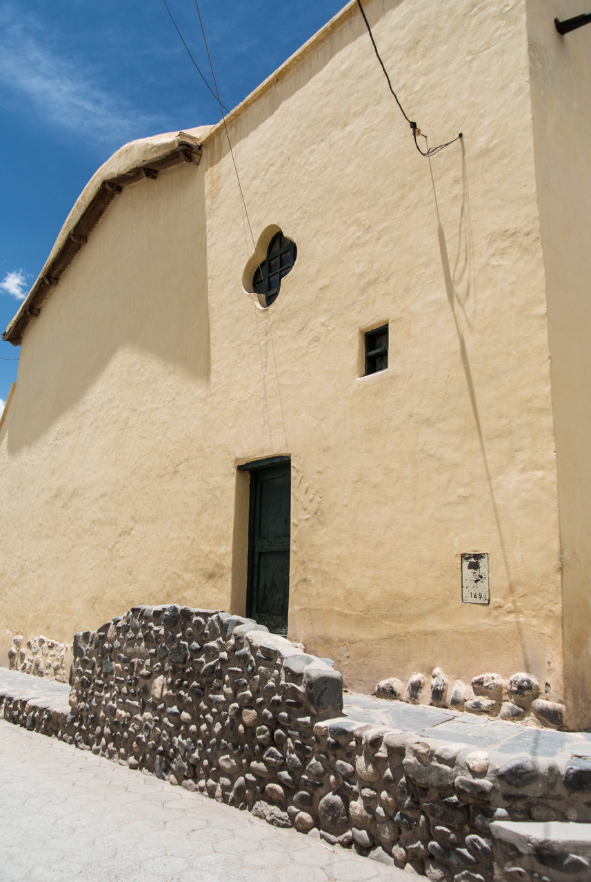Mes pas me guident vers l’église, un des rares bâtiments qui ne soit pas blanc à Cachi. Ce n’est pas sa seule particularité. Son intérieur (dont son toit) est en bois de cactus. Mais oui… à cette altitude, il y a très peu d’arbres… par contre, comme j’ai pu le constater, le cactus croît en abondance. Une fois séché, il devient aussi dur que le bois et voilà le succulent transformé en bois de construction. Un bois très clair et parsemé de trous.