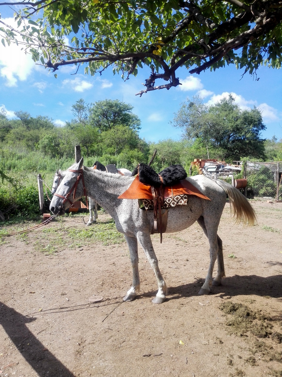 Sous le patio, notre groupe fait connaissance : deux Chiliens de Santiago, un avocat brésilien et un couple argento-espagnol qui habite… à Bruxelles. Pendant que Guillermo prépare les chevaux, je le regarde faire. Il y en a plusieurs mais je détecte immédiatement lequel est le sien : un magnifique cheval gris. Je regarde les autres… et si je pouvais deviner parmi tous ces chevaux lequel sera le mien. En moins d’une minute, je remarque un cheval un peu moins grand que les autres, couleur pie avec une jolie crinière. Je parie qu’il m’est destiné ! Une grosse demi-heure plus tard, quand les chevaux sont sellés, Guillermo me tend une bride… et c’est bien mon cheval pie! Il ne reste plus qu’à monter. Ce sera la première fois.