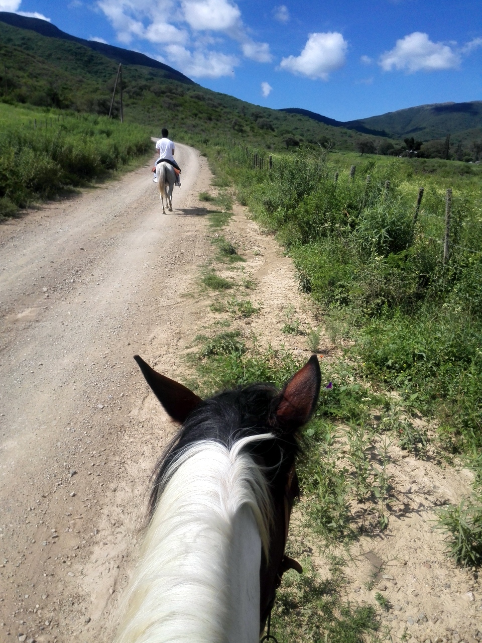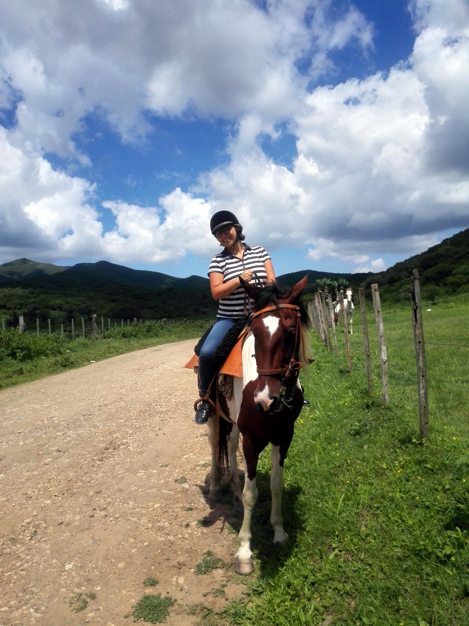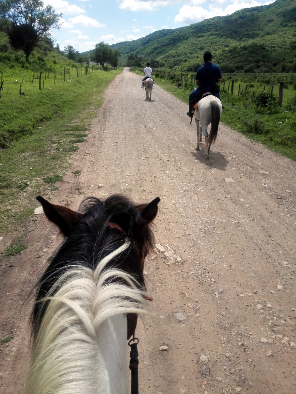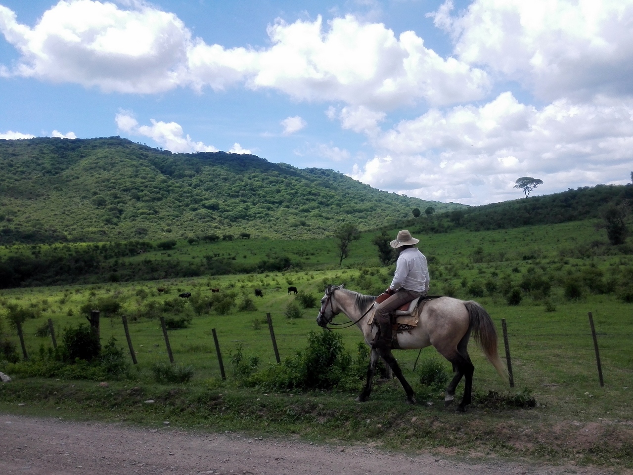 Lectrice, Lecteur, c’est à ce point de l’histoire que je dois te faire une confession. J’aime les animaux, ça, tu le sais si tu me suis depuis un moment. Et donc j’aime aussi le cheval. Surtout dans mon assiette. Particularité culturelle belge : nous mangeons de la viande de cheval, eh oui. Pire encore, mon grand-père étant boucher chevalin, j’ai grandi avec l’habitude du steak de cheval-frites du mercredi. Bref, je ne peux pas caresser le museau d’un joli bidet en pensant à un délicieux morceau de viande. Aussi, cela me faisait un peu bizarre de flatter la crinière de mon cheval en m’installant sur la selle, bien droite. Malheureusement, pas de chapeau de gaucha pour moi mais une bombe… je ne peux pas m’empêcher d’être un peu déçue mais la sécurité avant tout ! Finalement, c’est assez agréable de monter à cheval. On voit le monde d’un peu plus haut, on sent l’animal qui vous porte, le jeu des muscles sous les cuisses. Au pas, nous parcourons les sentiers, avec la chienne de la ferme qui a décidé de nous accompagner en guise d’éclaireuse. Le tableau est joli : les collines autour de la vallée de la Quesera, la file de chevaux, les cris d’oiseaux et le clop-clop des sabots comme seul bruit… Guillermo brise de temps en temps le silence pour nous expliquer une chose ou deux… mais il semble que notre groupe soit du style contemplatif, ce qu’un gaucho sait apprécier. Tout est si paisible et parfait !