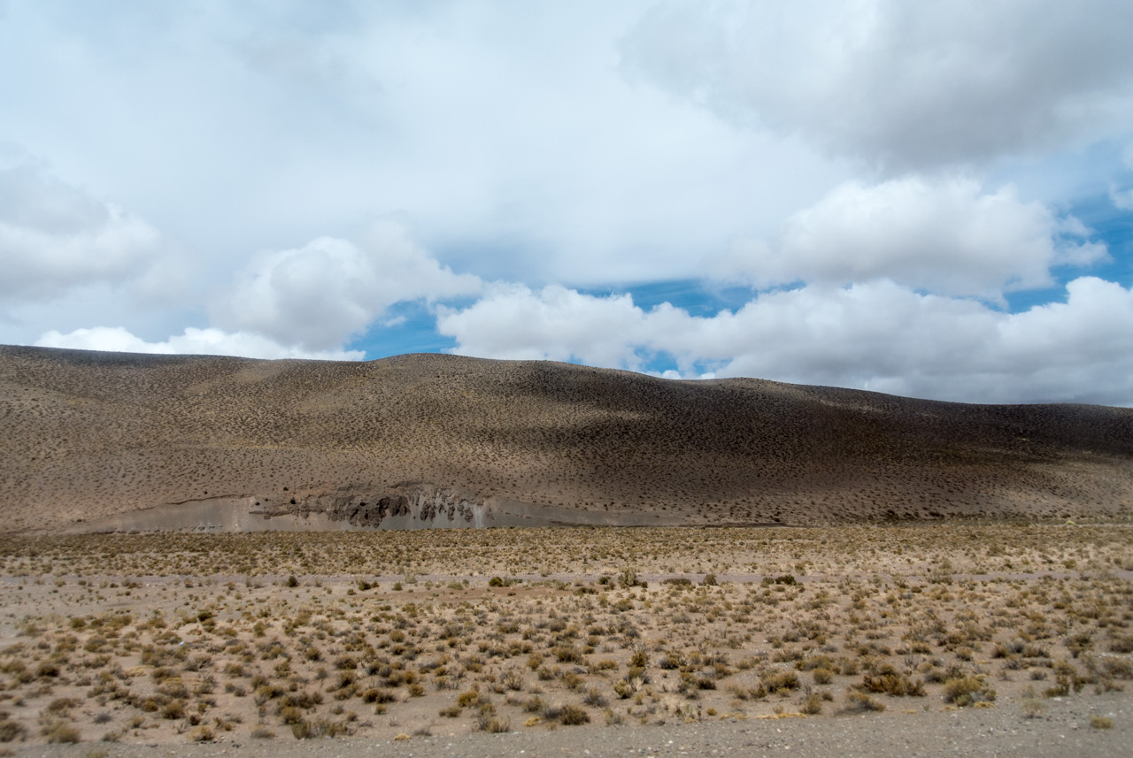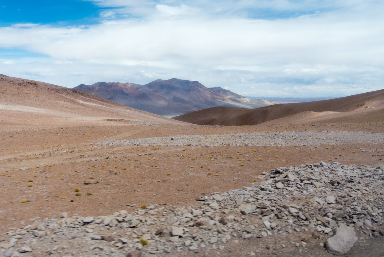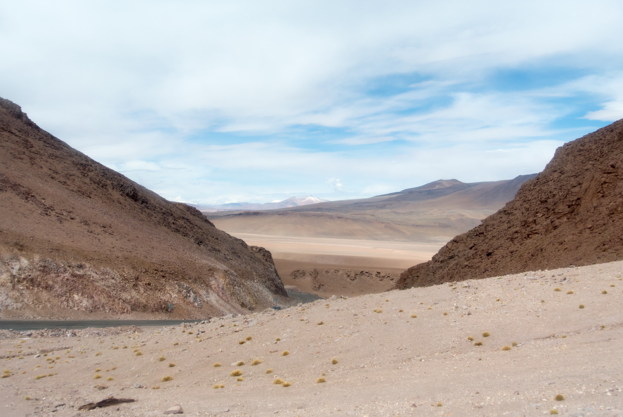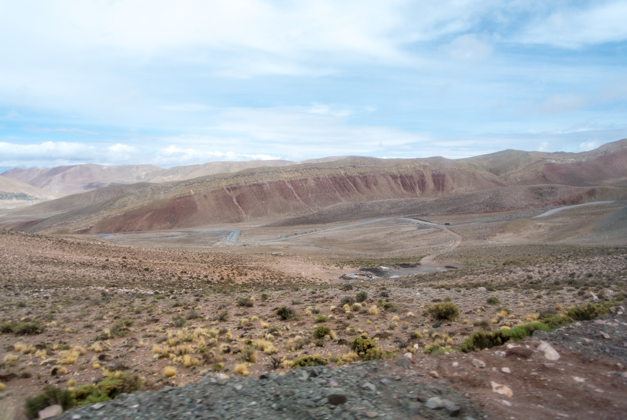 Nous continuons l’ascension et le décor devient de plus aride, si il est encore possible… et de plus en plus sauvage et tourmenté. Pas un cactus, pas une touffe d’herbe sèche et maigrichonne. Tout n’est que pierre, sable et ciel. Impossible de détacher le regard. Je n’aurai jamais si peu lu pendant mes périples, fascinée par le spectacle de la montagne. Quand est-ce que cette montée va finir ? Que va t’il rester si on continuait à monter comme çà ? Mais le but est finalement atteint, un but temporaire, mais nécessaire : au sommet du Paso de Jama, nous voilà au poste frontière entre l’Argentine et le Chili. A plus de 4000 mètres. Jamais je n’ai été aussi haut !