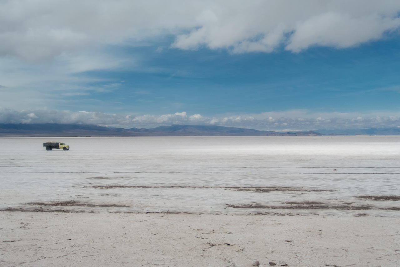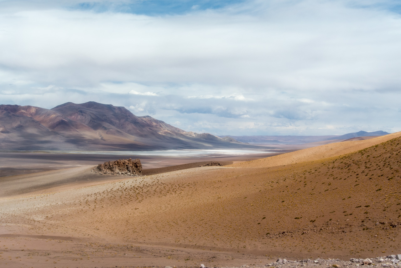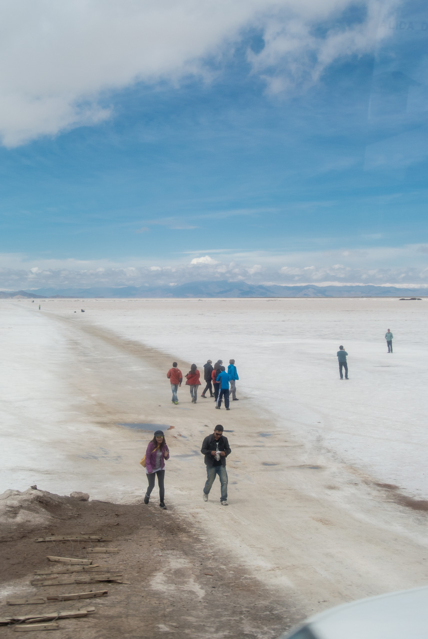Lentement mais surement, le bus commence son ascension et la végétation devient de plus en plus rabougrie. Sur ce monde de couleur chaude, contraste un ciel bleu… le temps s’est asséché sur la montagne. Il y a aussi des touches de blanc : arrivés sur un grand plateau, nous passons à coté de Salinas Grandes, une immense plaine salée qui fait un peu penser au Salar d’Uyuni, pas si lointain que ça. Des touristes y sont déjà, bien emmitouflés, lunettes de soleil sur le nez pour éviter l’aveuglement… certains sont un peu plus loin, en train de prendre la pause, de sauter en l’air… Mais nous nous éloignons déjà…. Ce sera l’unique marque d’être humain jusqu’à la frontière chilienne. Nous voilà dans un paysage où n’existe plus que des dégradés de jaune et d’orange… ça restera comme çà jusqu’à San Pedro, avec des variantes fantastiques dans les formes et les couleurs.