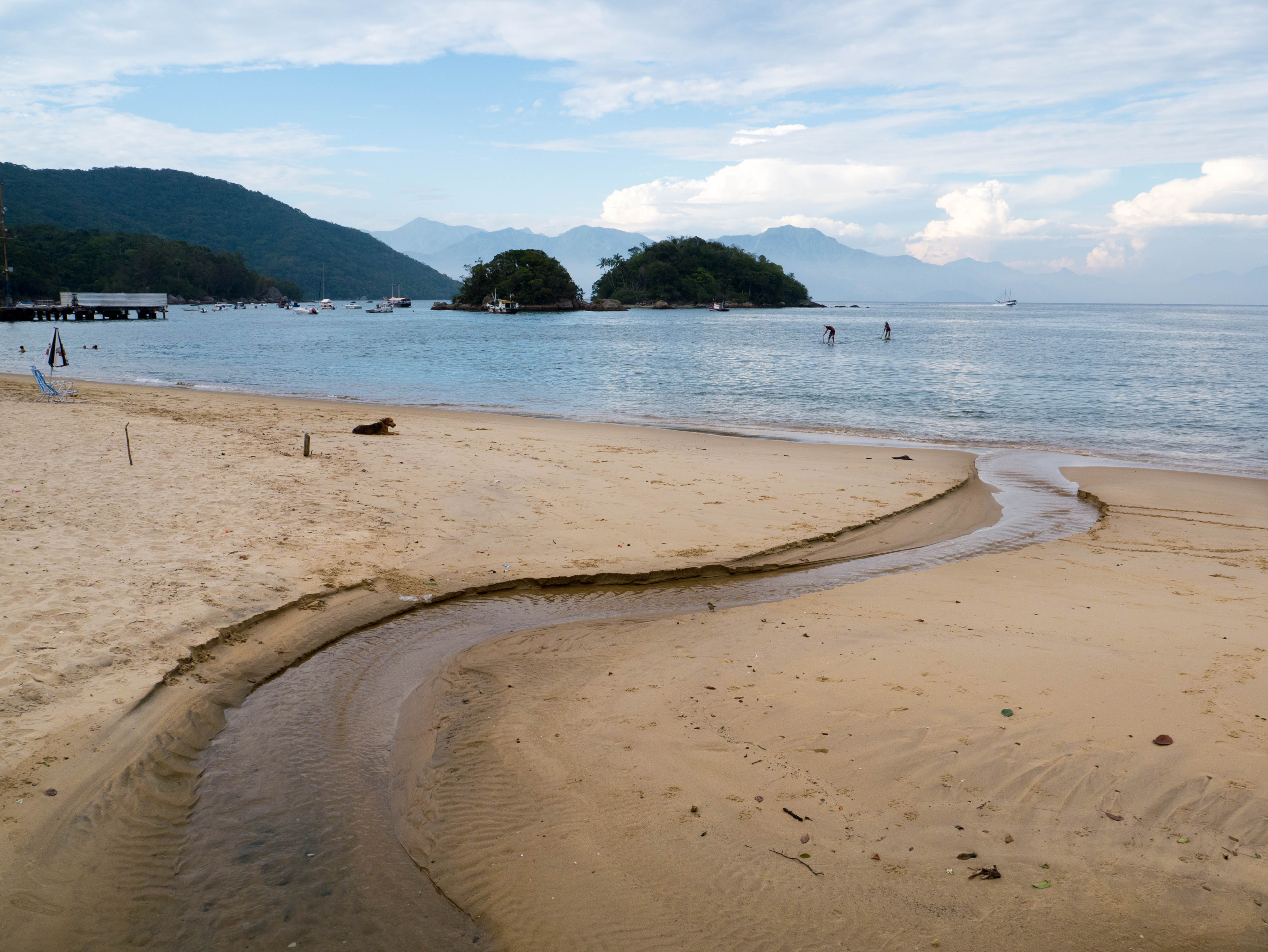 Une fois installée, je me lance dans mon « pèlerinage » : la balade le long de la plage d’Abraão vers le Cafe do Mar. Et là, surprise : le café était le seul à avoir un bar installé sur le sable… plus maintenant. Ils sont plusieurs à avoir envahi la plage, juste après le quai. Reste le pavement du trottoir qui s’arrête pour céder la place au sable battu, et enfin plus loin, à la plage, sans rien d’autre. L’autre surprise, c’est la petite rivière qu’il me fallait traverser tous les jours pour rejoindre ma pousada. Elle n’existe plus. C’était là que ma tongue baladeuse avait décidé de prendre un peu l’air. Et là, je me sens un peu triste. Comme si une chouette voisine qu’on pensait revoir avait déménagé sans crier gare.