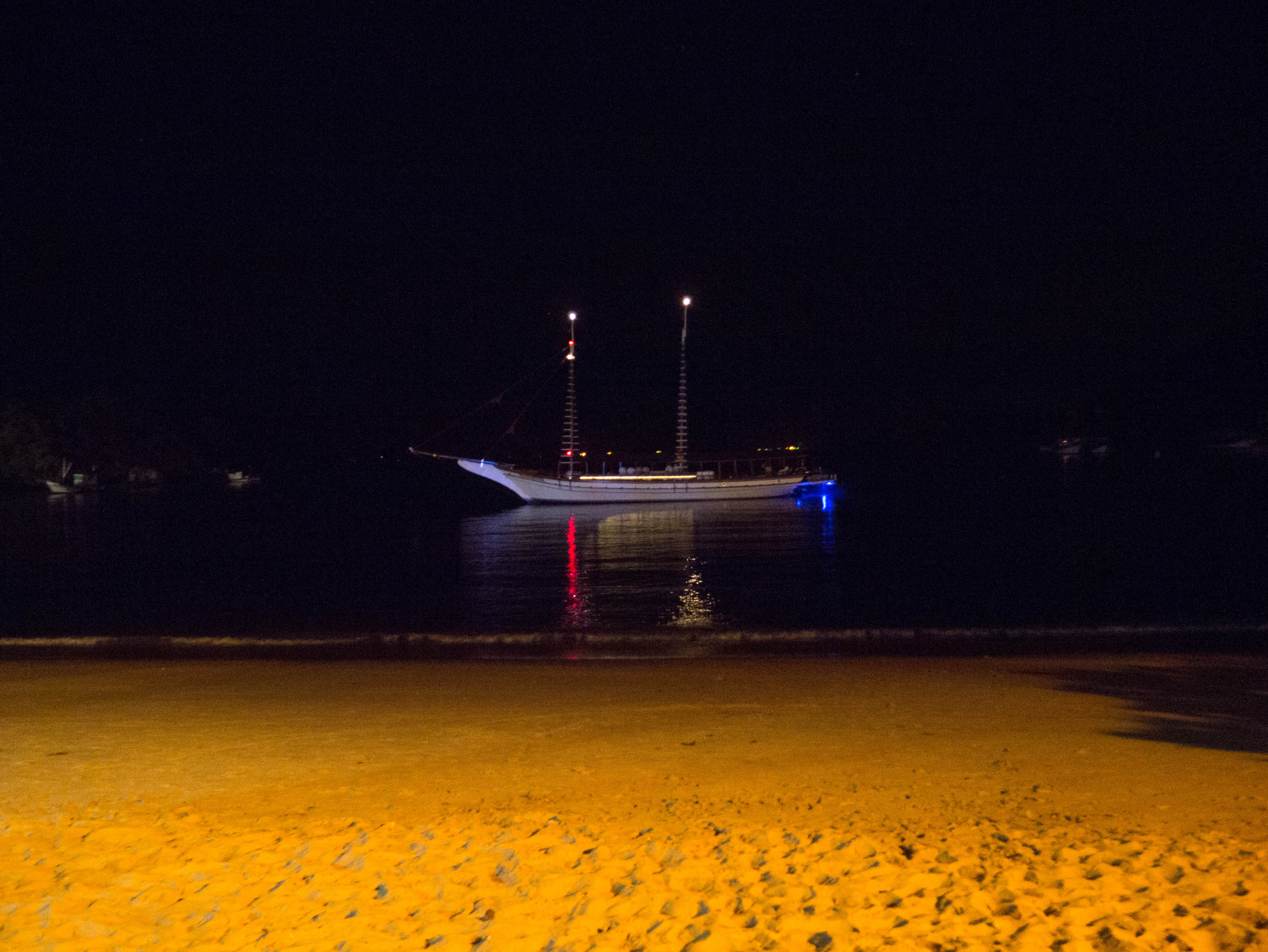 Deux heures plus tard, me voilà à bord. Ça me faisait tout drôle de retrouver ce vieux ferry… le même qu’il y a 5 ans. Un solide bateau américain, ayant fait ses classes en Louisiane et qui tous les jours, transporte visiteurs, habitants de l’île, provisions et matériel sur l’île. Même la météo est la même qu’il y à cinq ans. Gris, mais calme… la seule différence, c’est qu’il y a plus de gens sur le bateau. Même si nous ne sommes pas encore en pleine saison (Noël est dans 4 jours et tous les Brésiliens ne sont pas en congé), il y a quand même pas mal de monde sur l’île, puisque j’ai eu un peu de mal à trouver un logement qui ne soit pas trop cher. Cette fois, pas de petite pousada en bords de la plage, mais une auberge située au bout du village d’Abraão, le seul et unique village de l’île (l’île est protégée et il ne reste que quelques habitations dispersées).