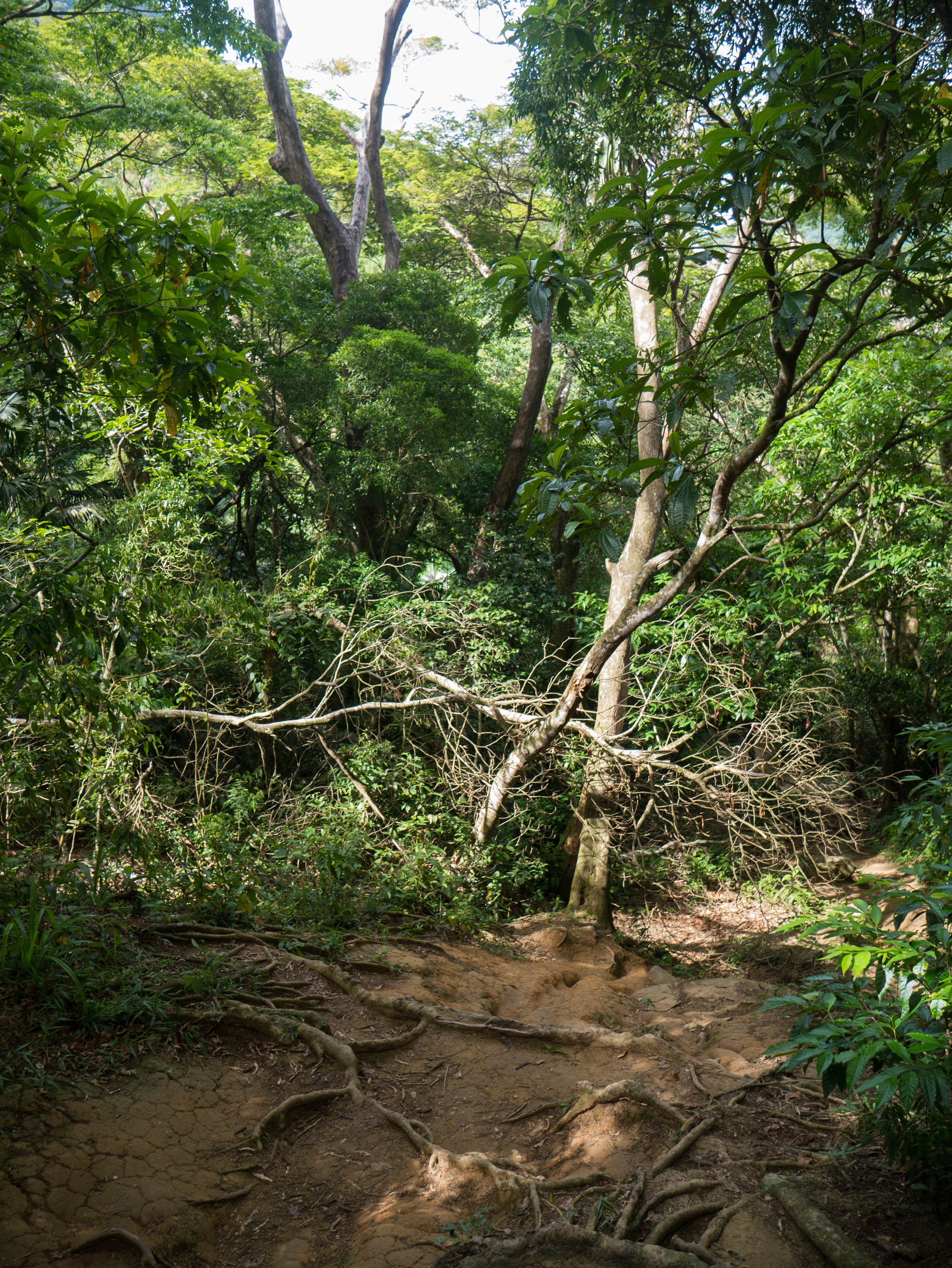 La randonnée s’effectue en 3 étapes : la première est la plus difficile, il s’agit de grimper de manière ininterrompue en haut d’une colline avec un sacré dénivelé. Si le sentier est bien balisé, certaines parties sont un peu en mauvais état (à cause des pluies et du « trafic »). Je vous recommande donc chaudement des chaussures de rando ou des baskets plutôt que des tongues ! Cette partie se marche à travers la forêt atlantique, c’est donc l’occasion d’observer les oiseaux et les singes sur le chemin mais voilà… il fait une chaleur infernale, même à l’ombre des arbres. La vague de chaleur commencée après mon arrivée au Brésil se prolonge et la dernière partie de l’ascension est assez pénible. J’ai carrément l’impression de chauffer de l’intérieur, ma bouteille d’eau est déjà vide et je peux tordre mon t-shirt tellement il est trempé de sueur. La récompense ? Une superbe vue depuis le point le plus haut de la randonnée sur le port et la baie. La descente se fait relativement rapidement, et on arrive sur la première plage : Praia das Palmas.