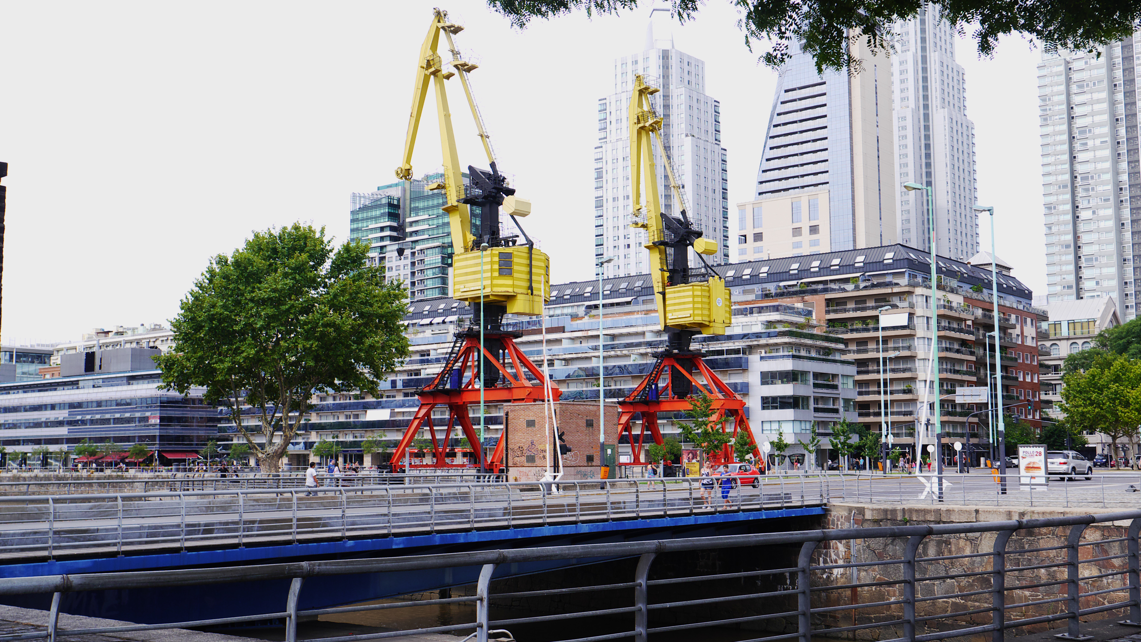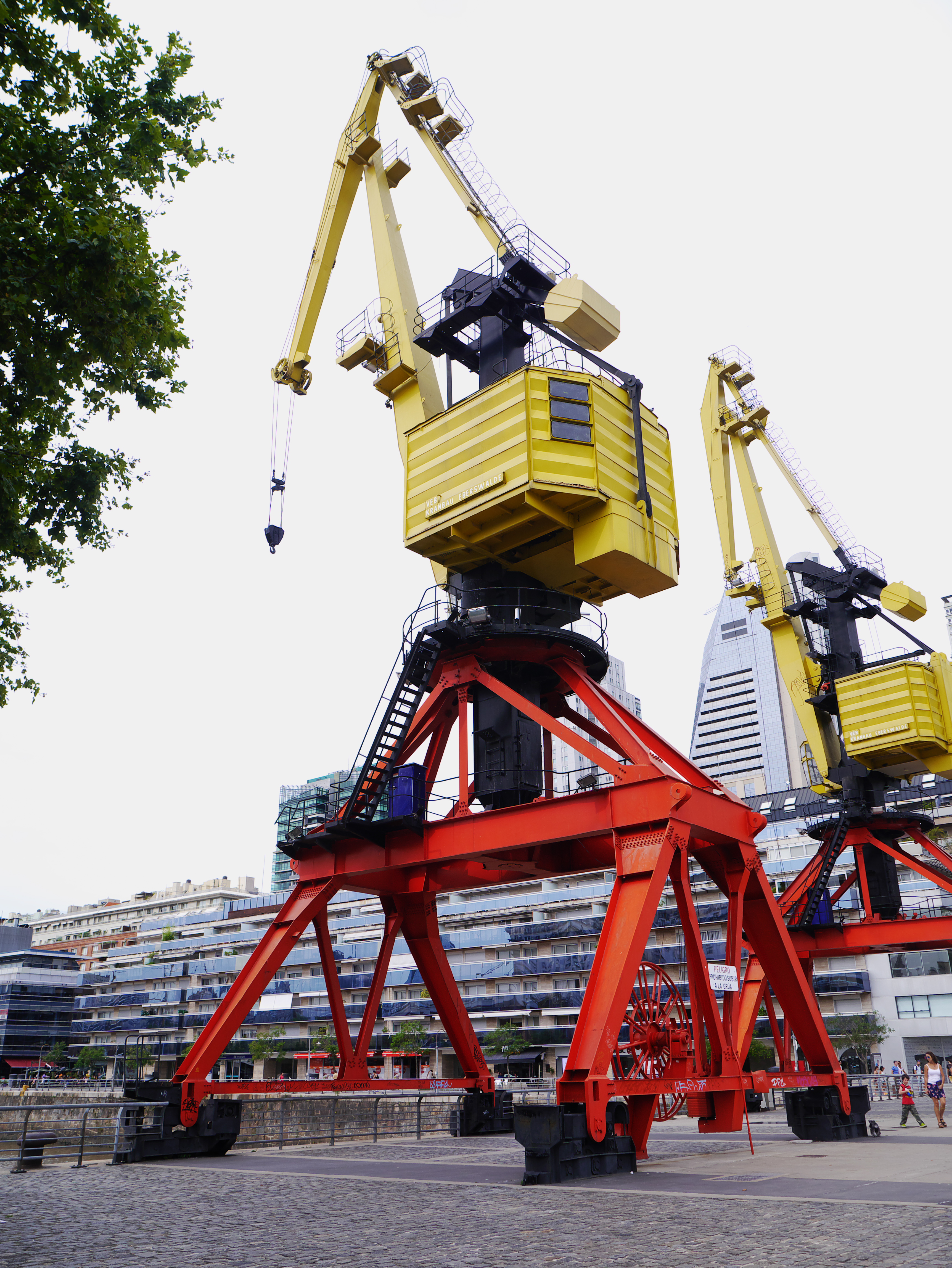Pour y accéder, c’est facile ! Puerto Madero se situe juste derrière la Casa Rosada, même si une la traversée du Passeo Colon reste une aventure (quelle maladie que ces immenses autoroutes urbaines à Buenos Aires). Côté ville, on trouve plutôt des anciens docks et hangars rénovés. De l’autre côté du bassin par contre, c’est un assortiment de gratte-ciels audacieux. Ici, Buenos Aires se fait très américaine avec ces monstres de verres et d’acier, ses rues en damier et ses petits parcs coupés au cordeau. En très peu de temps, Puerto Madero est devenu un quartier prisé. Non seulement pour de jeunes entrepreneurs venus s’installer dans de grands espaces nouvellement disponibles, mais aussi par des retraités fortunés, des expats et des amoureux de l’art (pas moins de 3 musées y ont ouvert : Fortabat Art Collection, le Faena Art Center et le Museo Ernesto de la Cárcova). Je traverse donc l’un des ponts qui relie le quai ouest à est. Sur le chemin, ont trouve des grues peintes en jaune, souvenirs du passé portuaire encore tout chaud. Tout au long des quais, ce ne sont que restaurants et des bars un peu chic, un peu sans âme aussi, ou en tout cas, je les ressens comme çà tant le contraste est violent avec le « vieux » Buenos Aires. Dans les rues perpendiculaires, ce sont plutôt des studios de designers, d’architecture ou des boîtes de comm’ qui se sont installées. Dans mes déambulations, je tombe aussi sur un des musées, le Faena Art Center.