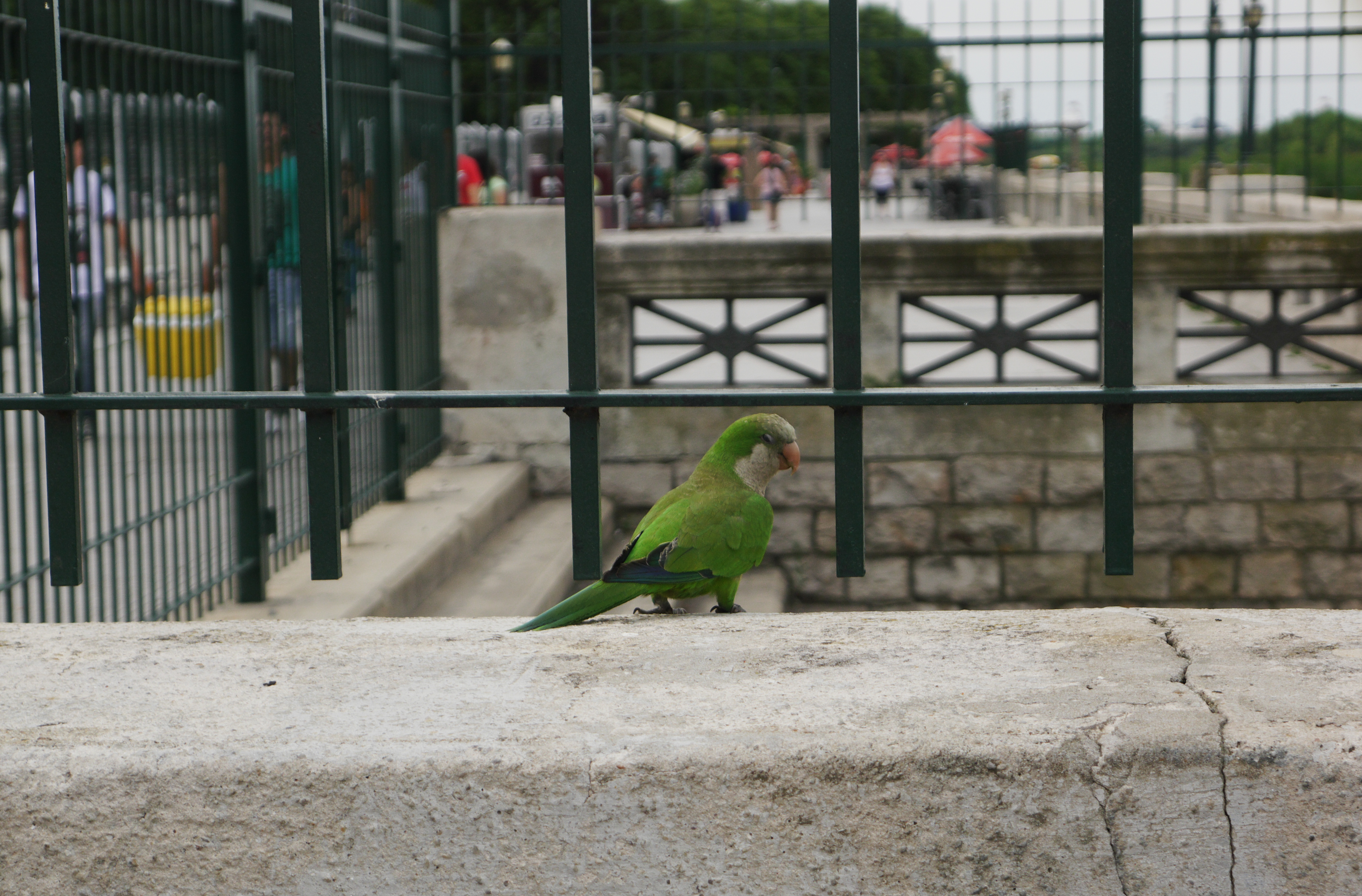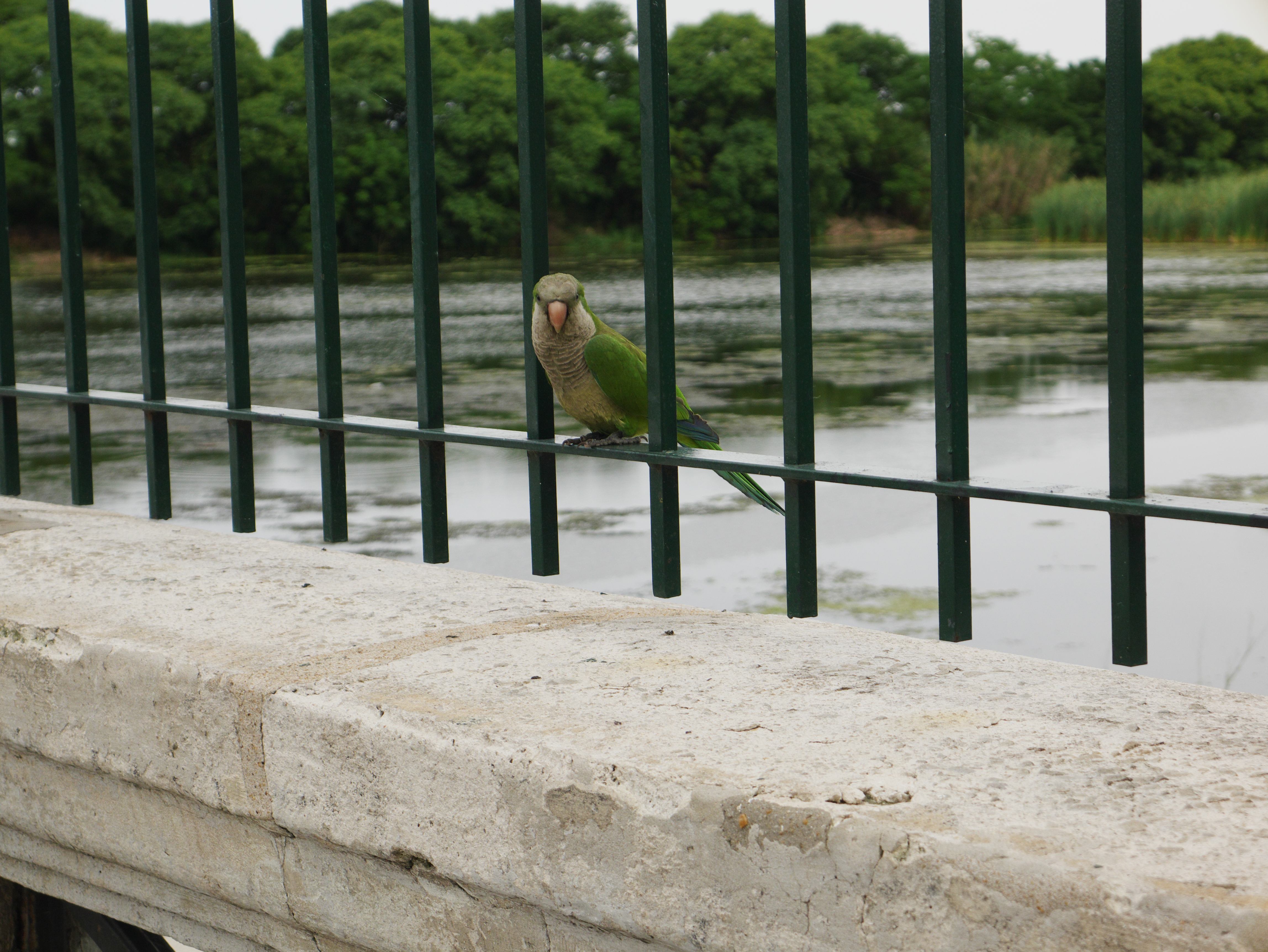 Mais le grand atout de Puerto Madero, c’est la réserve écologique Costanera Sur, un grand espace herbeux et marécageux coincé entre Puerto Madero et le fleuve qui est vite devenu le grand bol d’air des Porteños mais aussi, un coin de nidification pour de nombreux oiseaux. La réserve est assez étendue et l’accès n’est pas facile… comme l’après-midi était déjà bien avancé, je me suis contentée de me balader le long de la lagune. Une jolie promenade y est aménagée et c’était le moment idéal pour s’asseoir est déguster mon premier « choripan » (contraction de chorizon et pan), un peu comme hot-dog… mais meilleur, avec évidemment un peu de chimichurri pour épicer tout çà. Le chimichurri est sans doute la plus argentine des sauces. Elle est à base de vinaigre et mélange huile, persil, ail, origan, piment et citron (en gros) et on l’utilise copieusement sur toutes les viandes. Une tradition argentine à respecter. Pendant que j’enfourne (estomac sensible au gras, s’abstenir), mon pain saucisse, un couple de perruches sauvages vient monter la garde, au cas où j’oublierai un morceau.