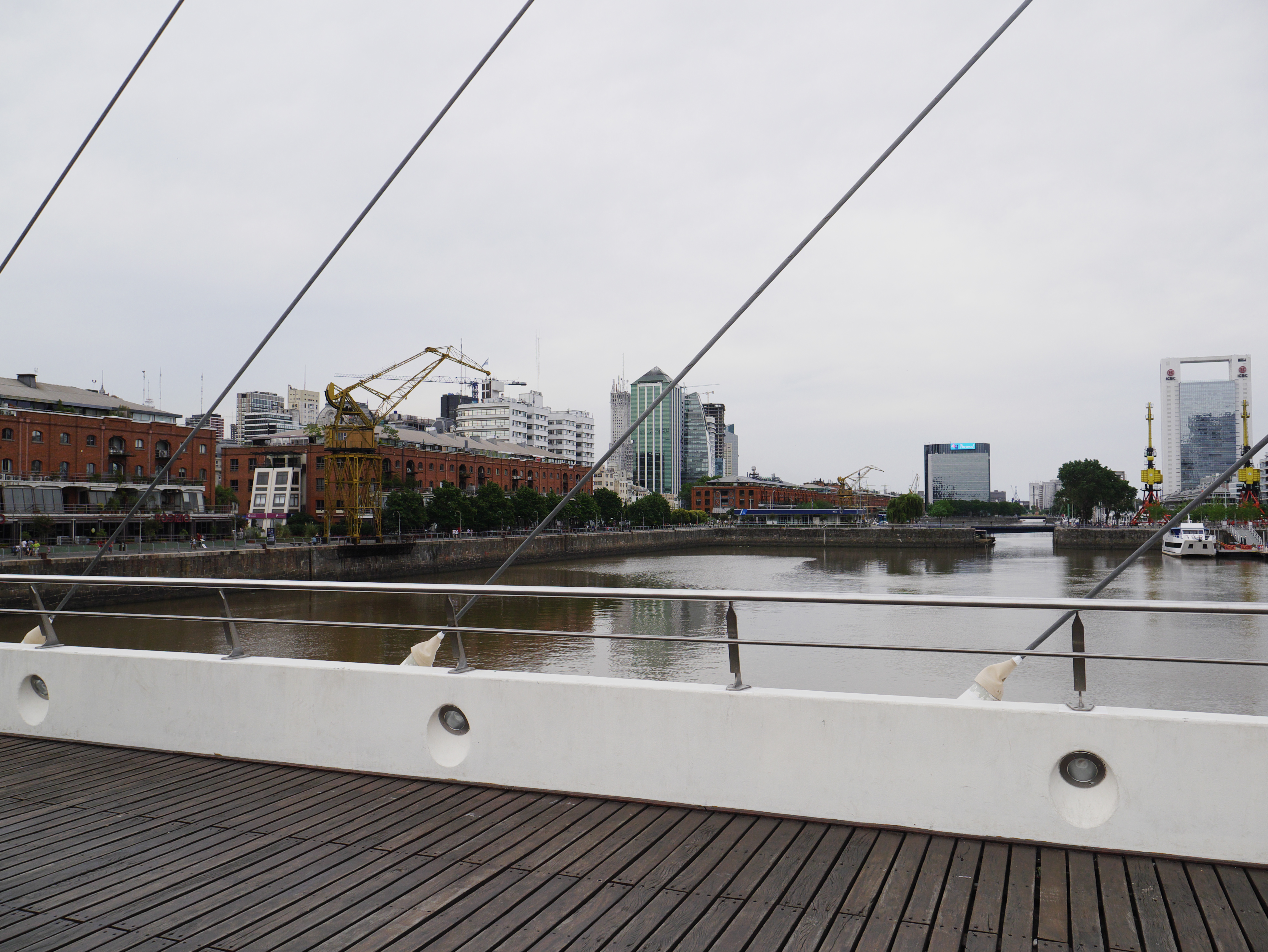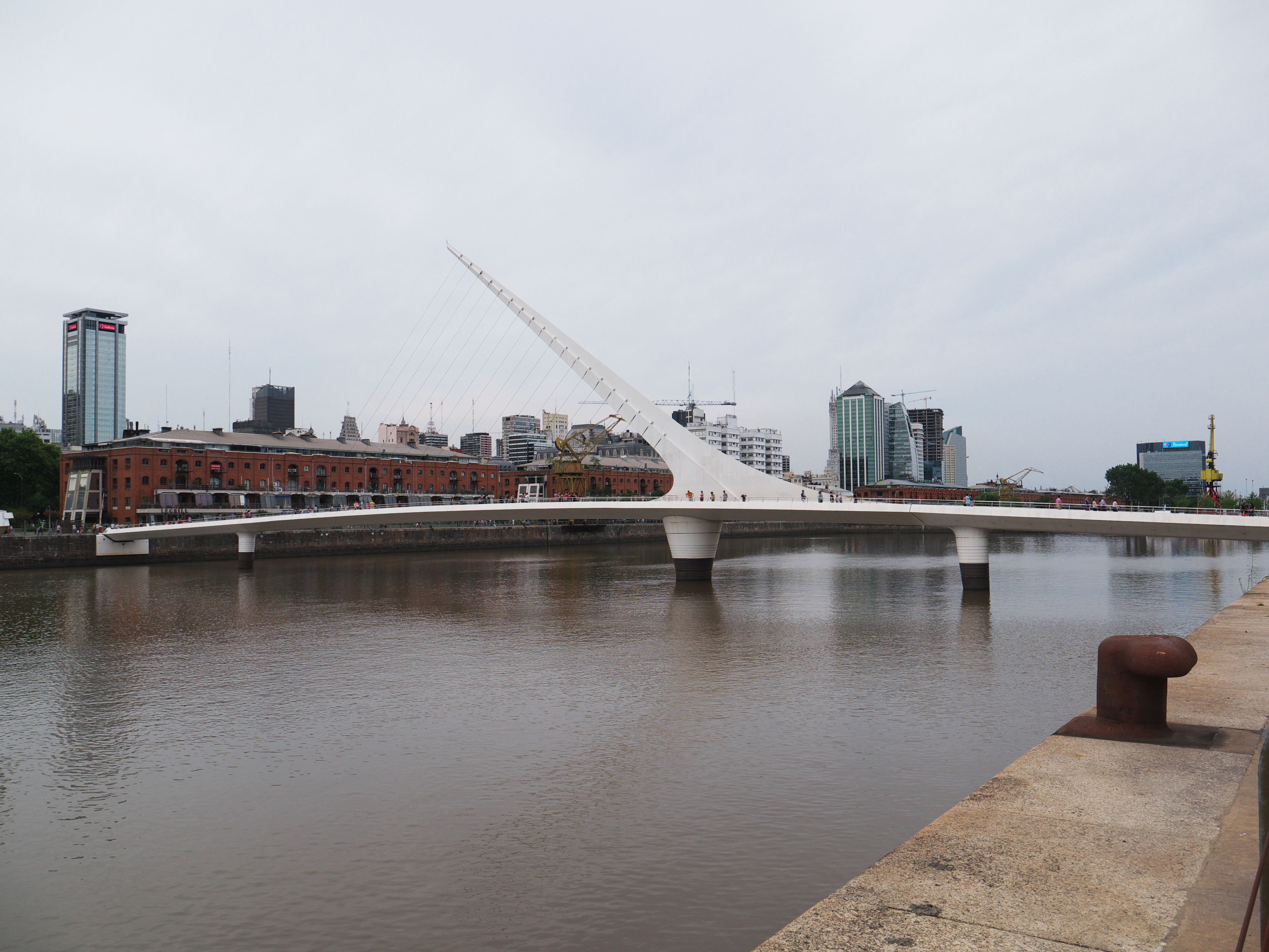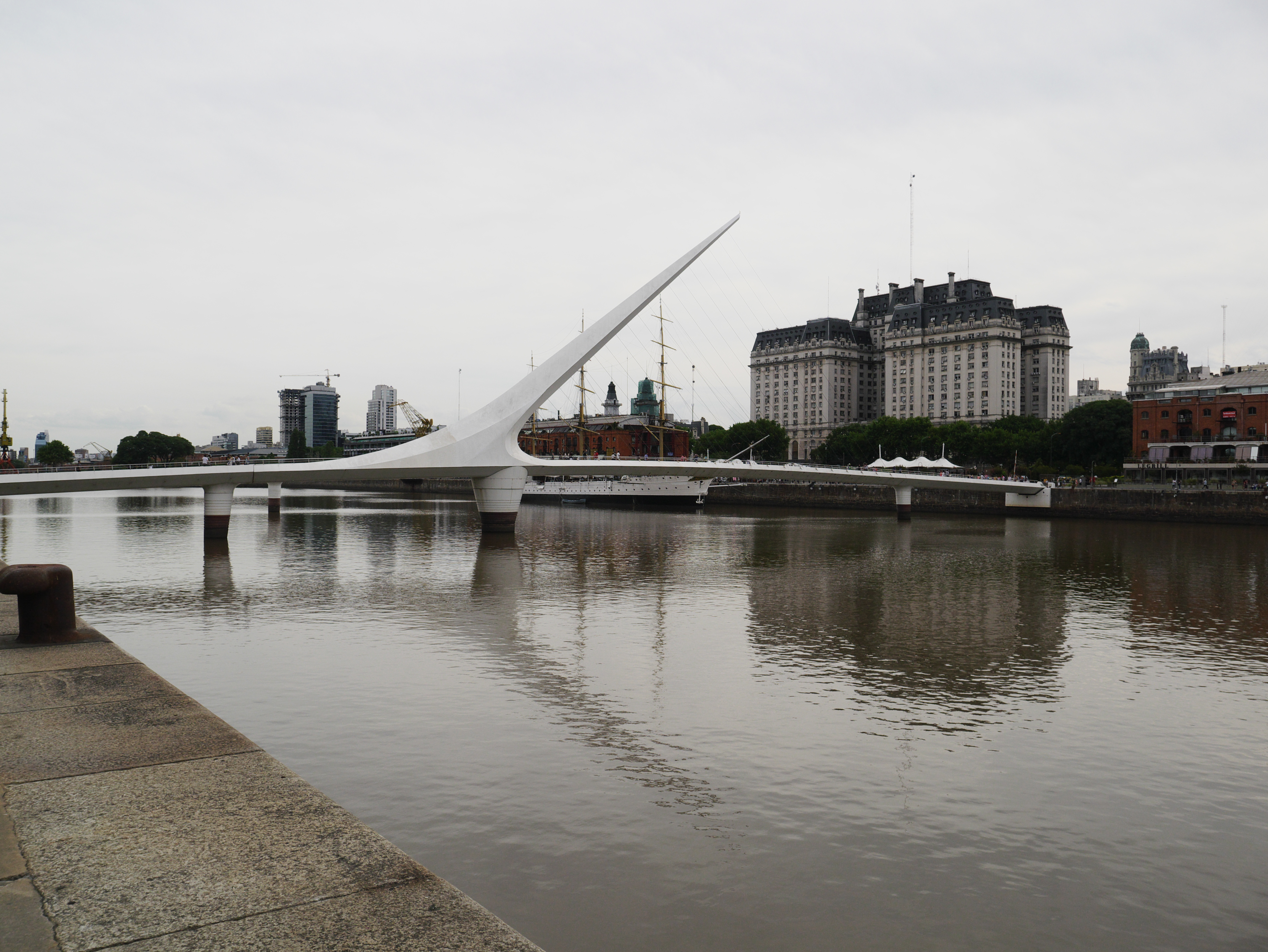 Ici, toutes les rues ont des noms de femmes : politiciennes, artistes, institutrices… C’est ainsi que l’a voulu le plan de développement de Puerto Madero. Pas étonnant qu’une des pièce maîtresse soit le Puente de la Mujer, le « Pont de la femme », unique ouvrage de Santiago Calatrava en Amérique latine. Ce pont piétonnier, tout fin et élancé est sensé représenter un couple dansant le tango (je cherche toujours la ressemblance).