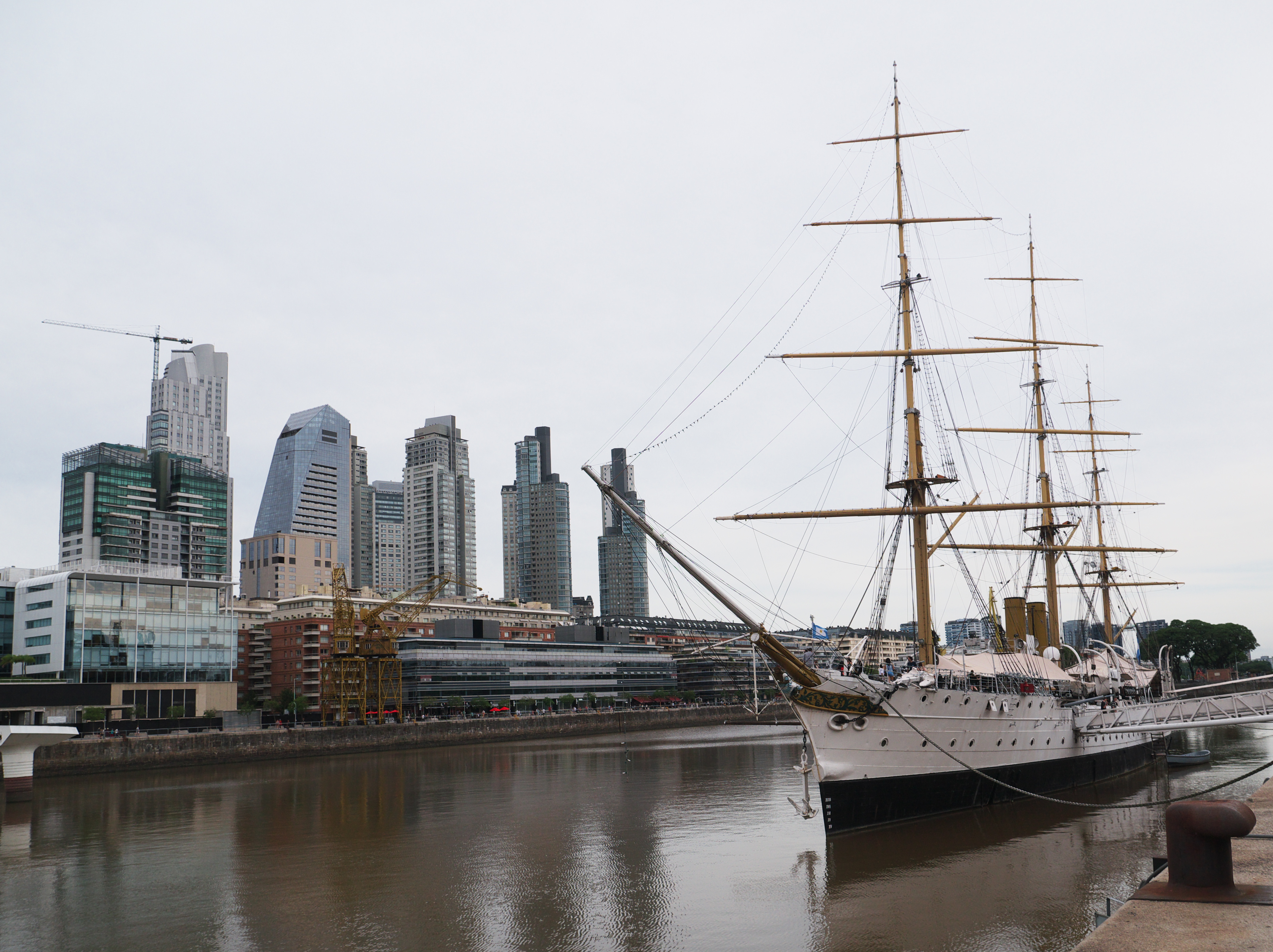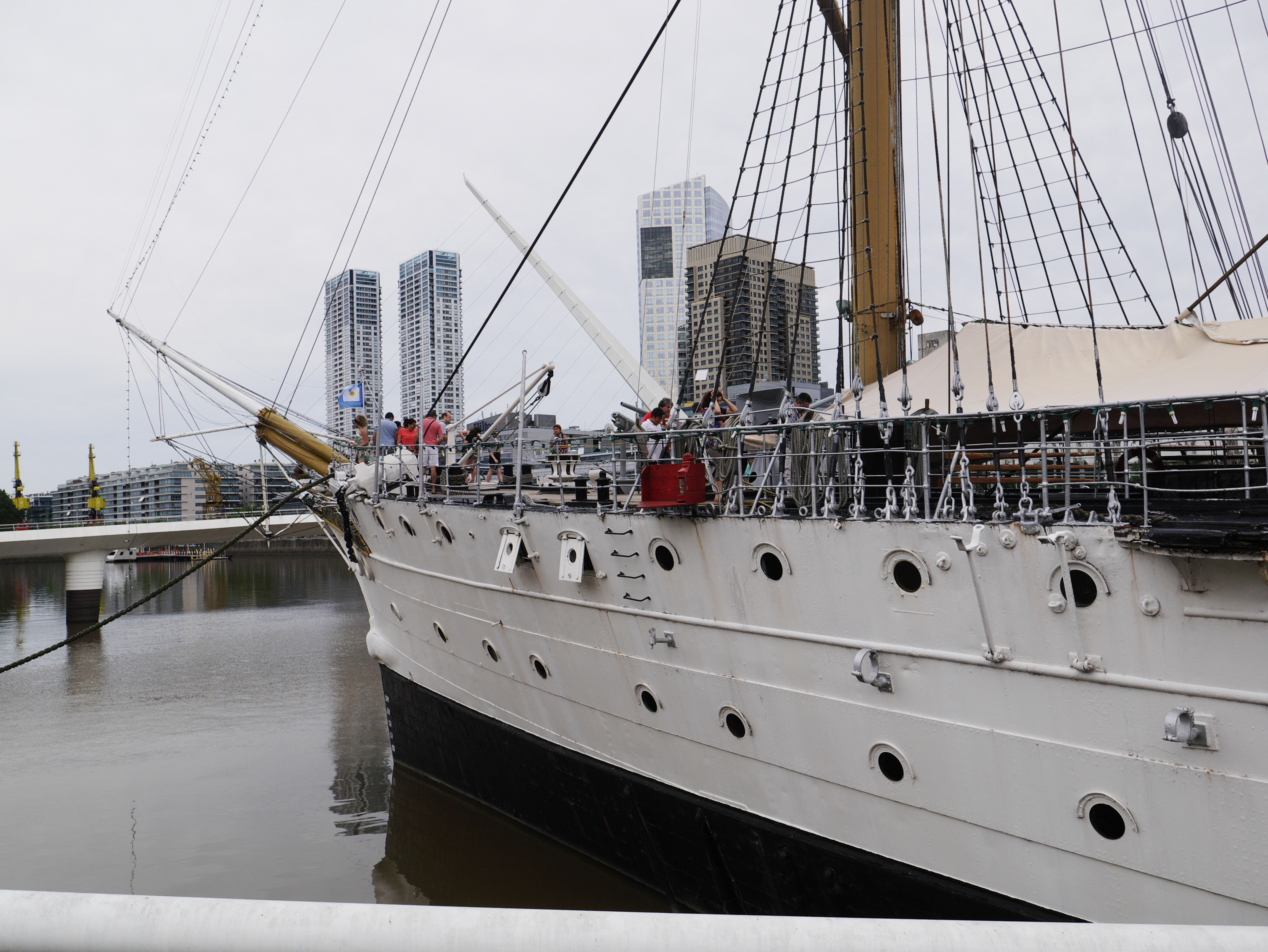 Un petit moment de détente plutôt agréable loin de la circulation de folie de la vile. Pour terminer, je repasse de l’autre côté du bassin, en traversant le Punte de la Mujer. De ce côté là, deux jolis navires tous blancs sont amarrés : ce sont des bateaux musées: la Frégate ARA Presidente Sarmiento (premier bateau école du pays) et l’ARA Uruguay, une valeureuse corvette ayant fait ses classes en Antarctique. Tous les deux sont ouvert aux visiteurs mais comme tous les musées d’Argentine. Je souhaitais en visiter un; le Presidente Sarmiento, mais malheureusement, il était fermé pour une fonction privée. Il ne me restera donc plus qu’à terminer cette découverte d’un Buenos Aires inhabituel, dans un des nombreux café de bords de quai. En sirotant une Quilmès bien froide, je mets à songer à tous ces marins, à tous ces bateaux qui ont fait escale à Buenos Aires et qui par leurs contes, ont fait de cette ville une légende.
