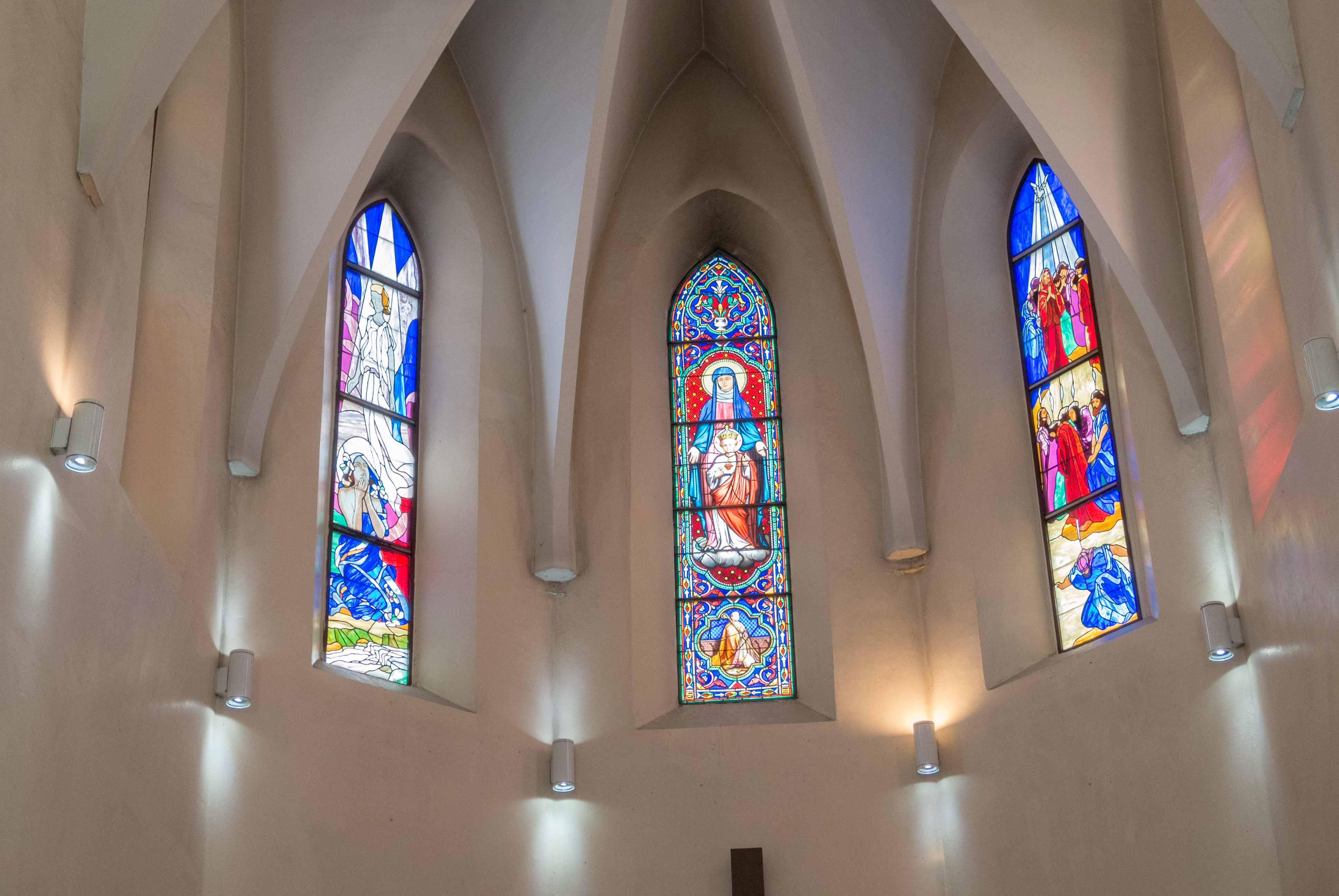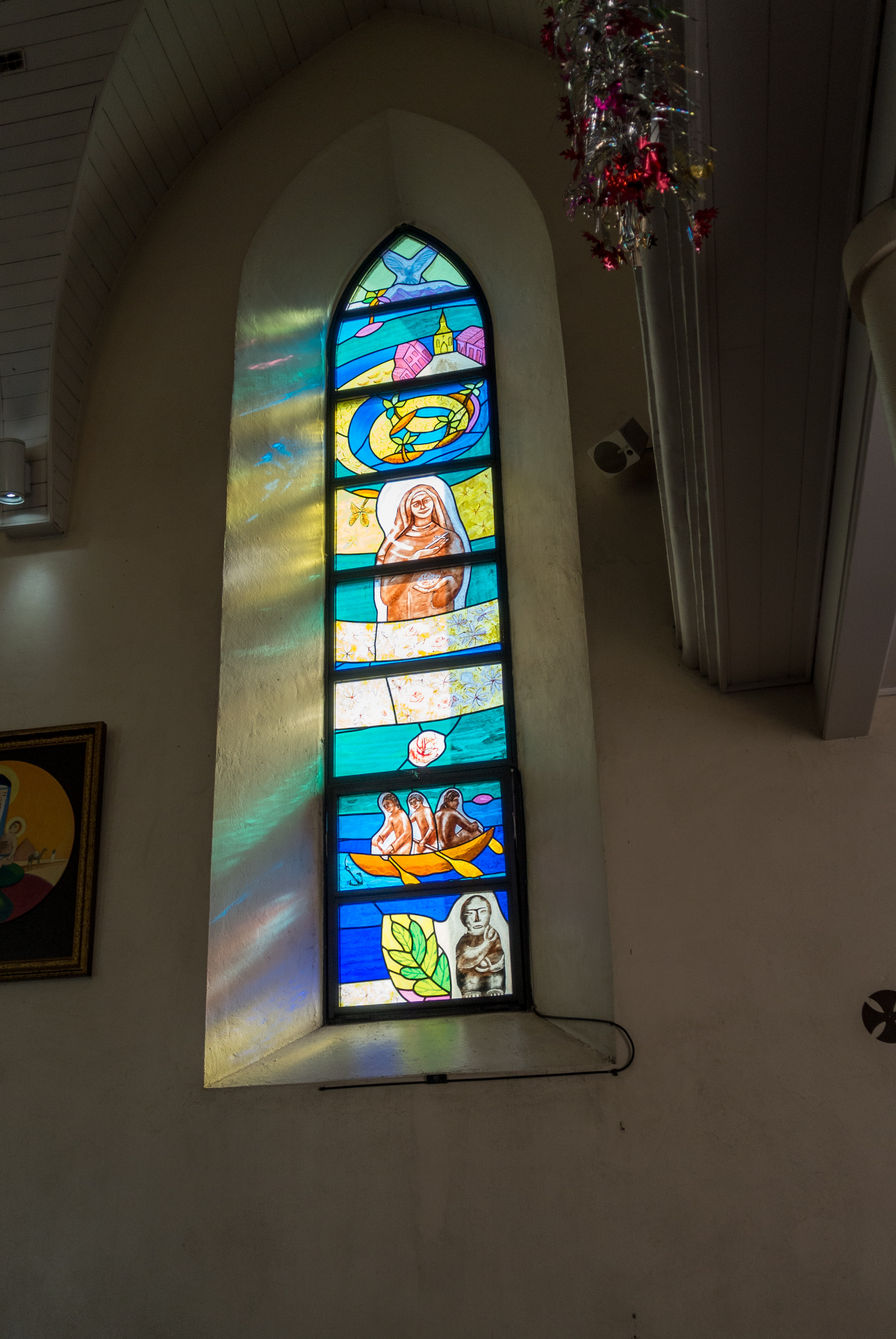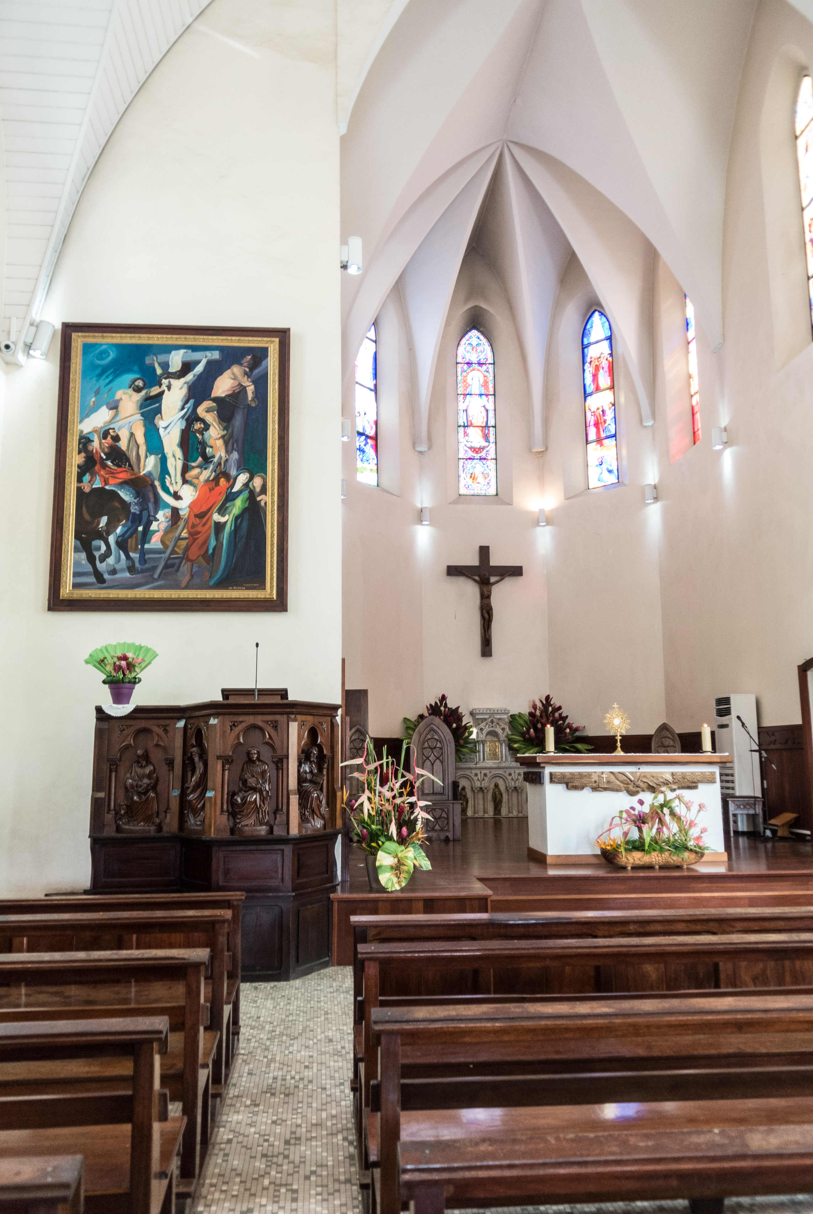 La cathédrale Notre-Dame de Pape'ete vaut bien aussi le détour. Peinte d'un jaune pimpant, ce sont ses vitraux qui m'auront charmé dans cette petite cathédrale. Des vitraux qui rappellent où on est : au cœur de la Polynésie. Des pirogues flottent sur des vitraux bleus lagons, qui se reflètent sur des murs blanchis. C'est simple, calme...