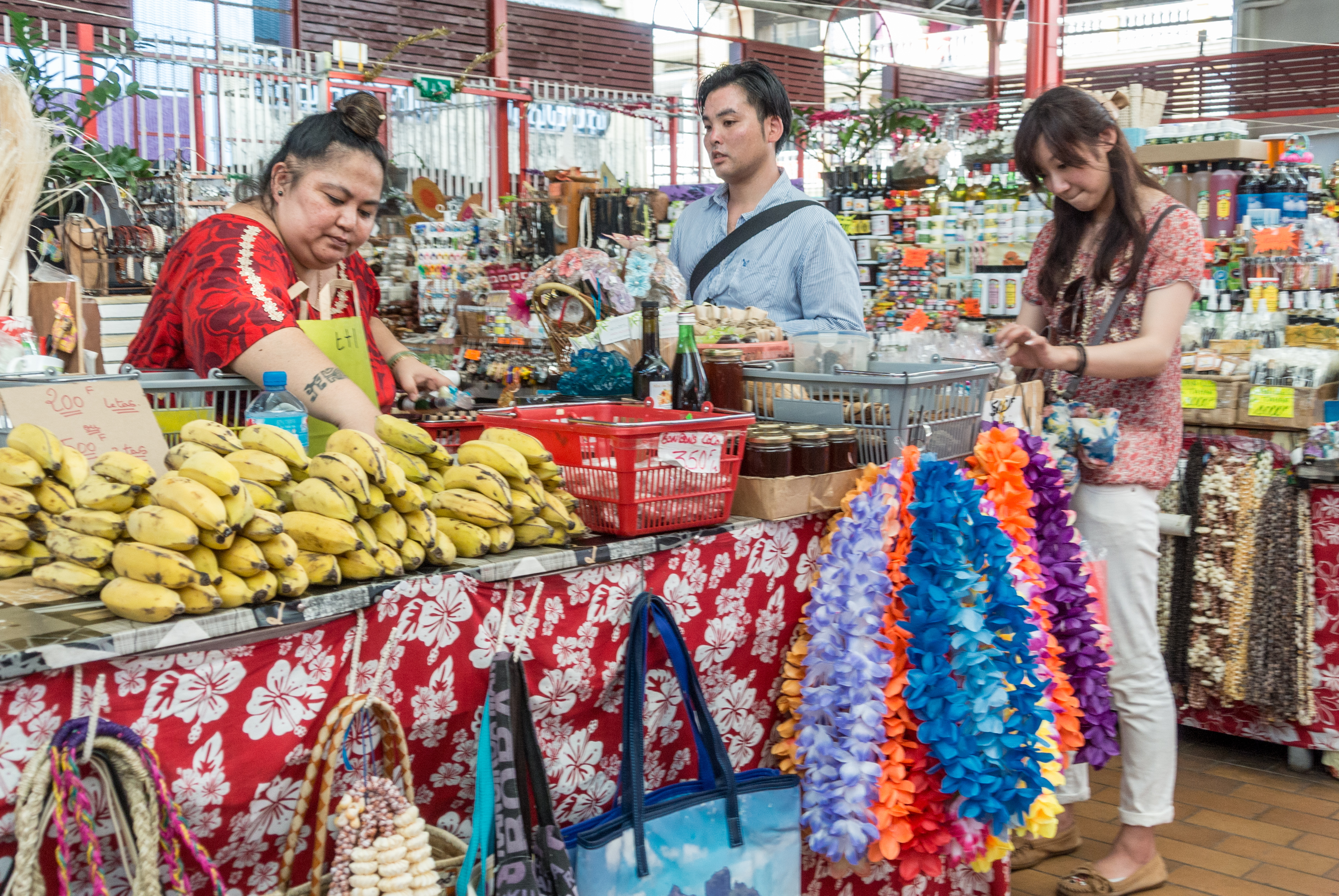On fait un petit détour au marché couvert, le cœur battant de Pape'ete. Ca explose de couleurs (celle des paréo, des fruits et légumes et des couronnes et colliers de fleurs) et d'odeurs : celle du monoï. J'y passerai de longues minutes à arpenter les allées du marché, à renifler, à humer pour trouver LE monoï qui me fera voyager.