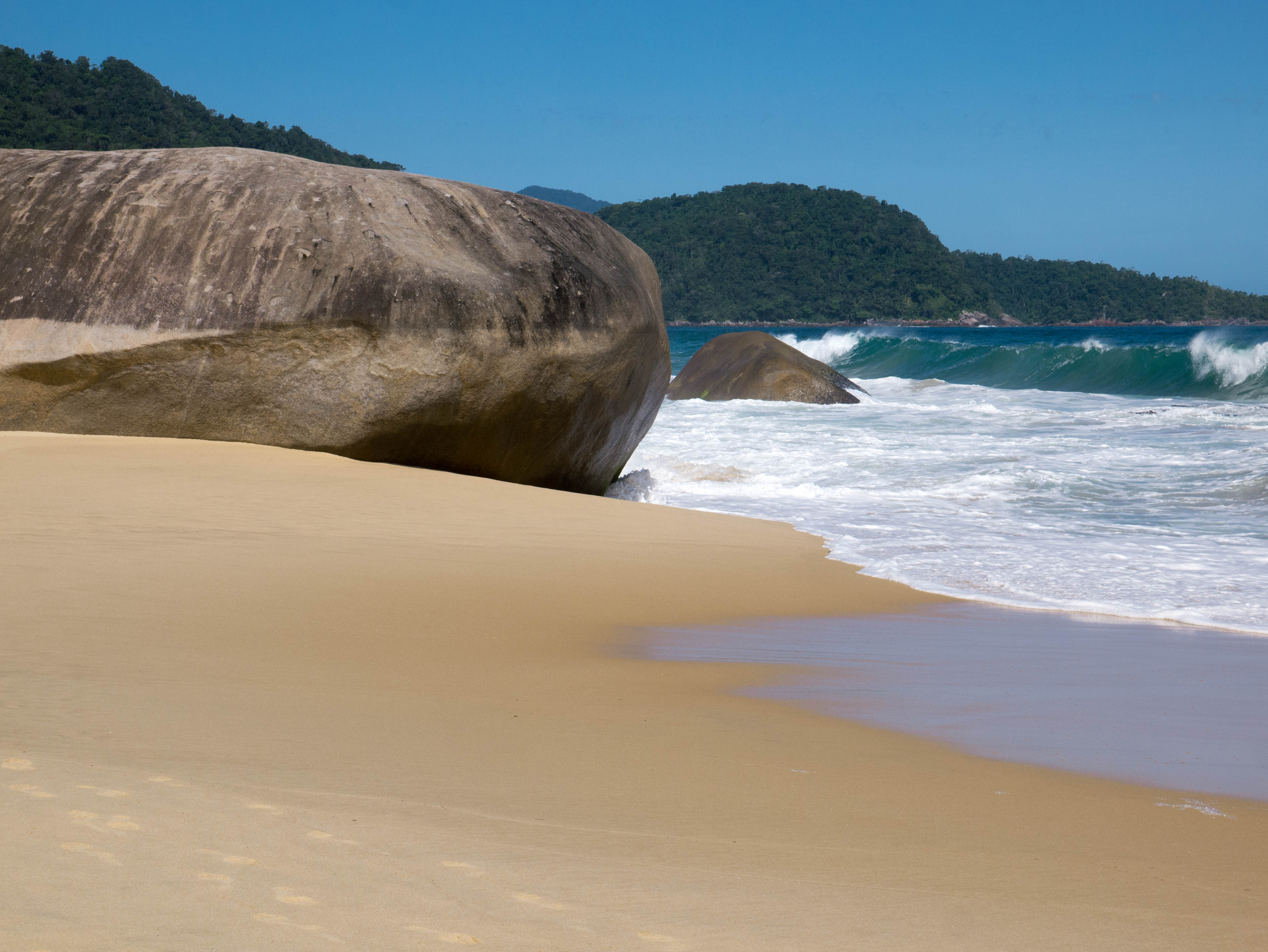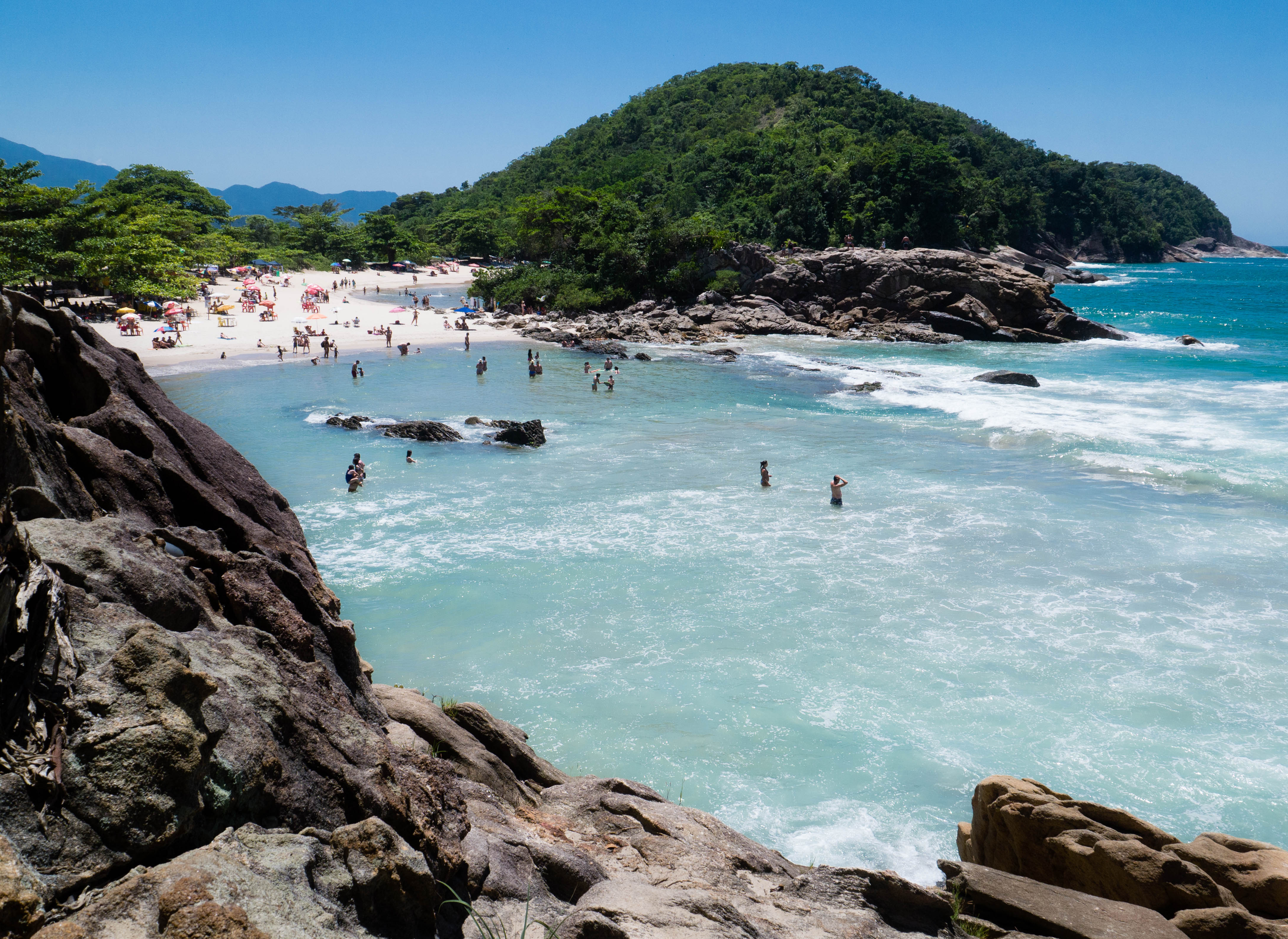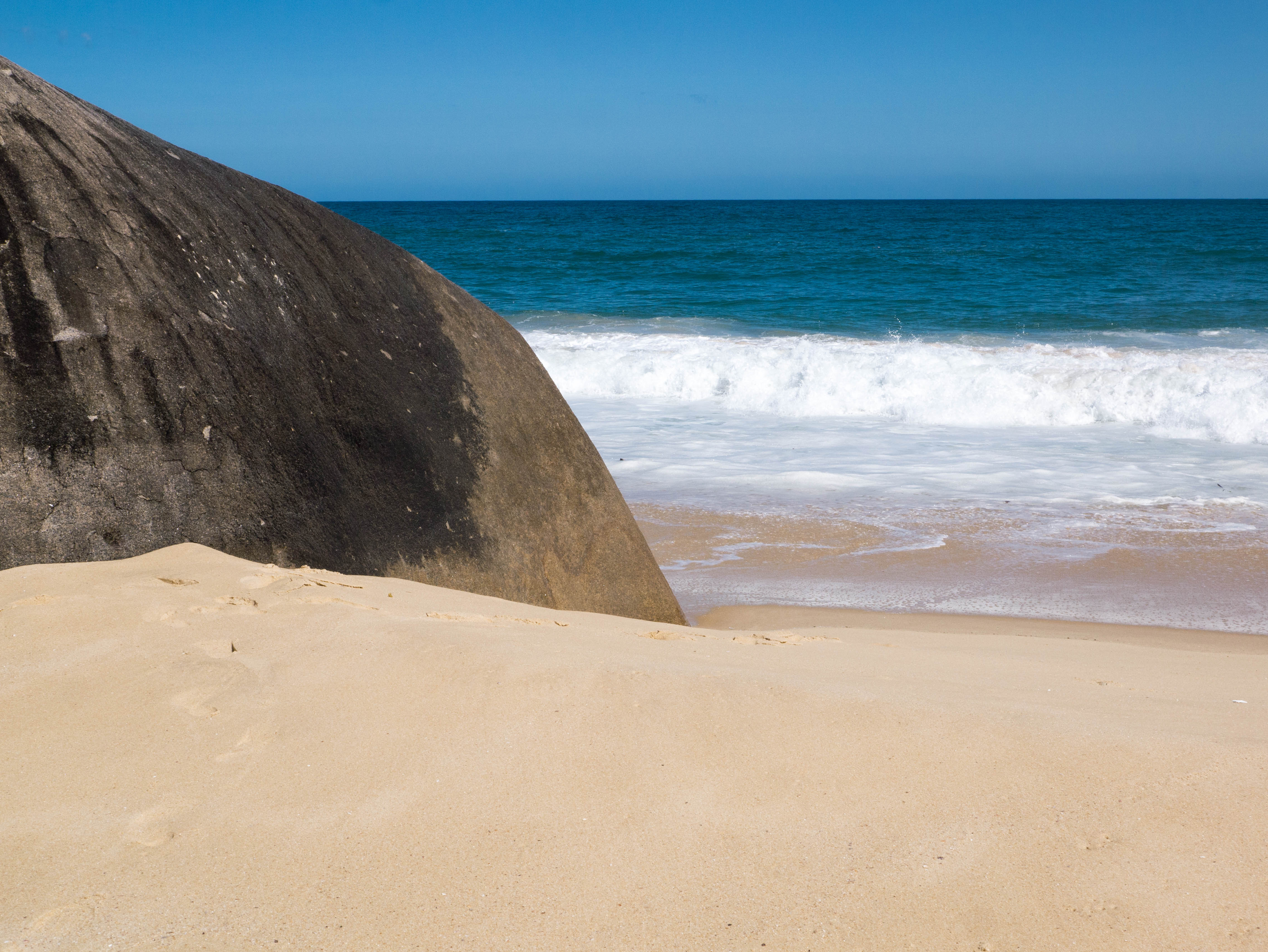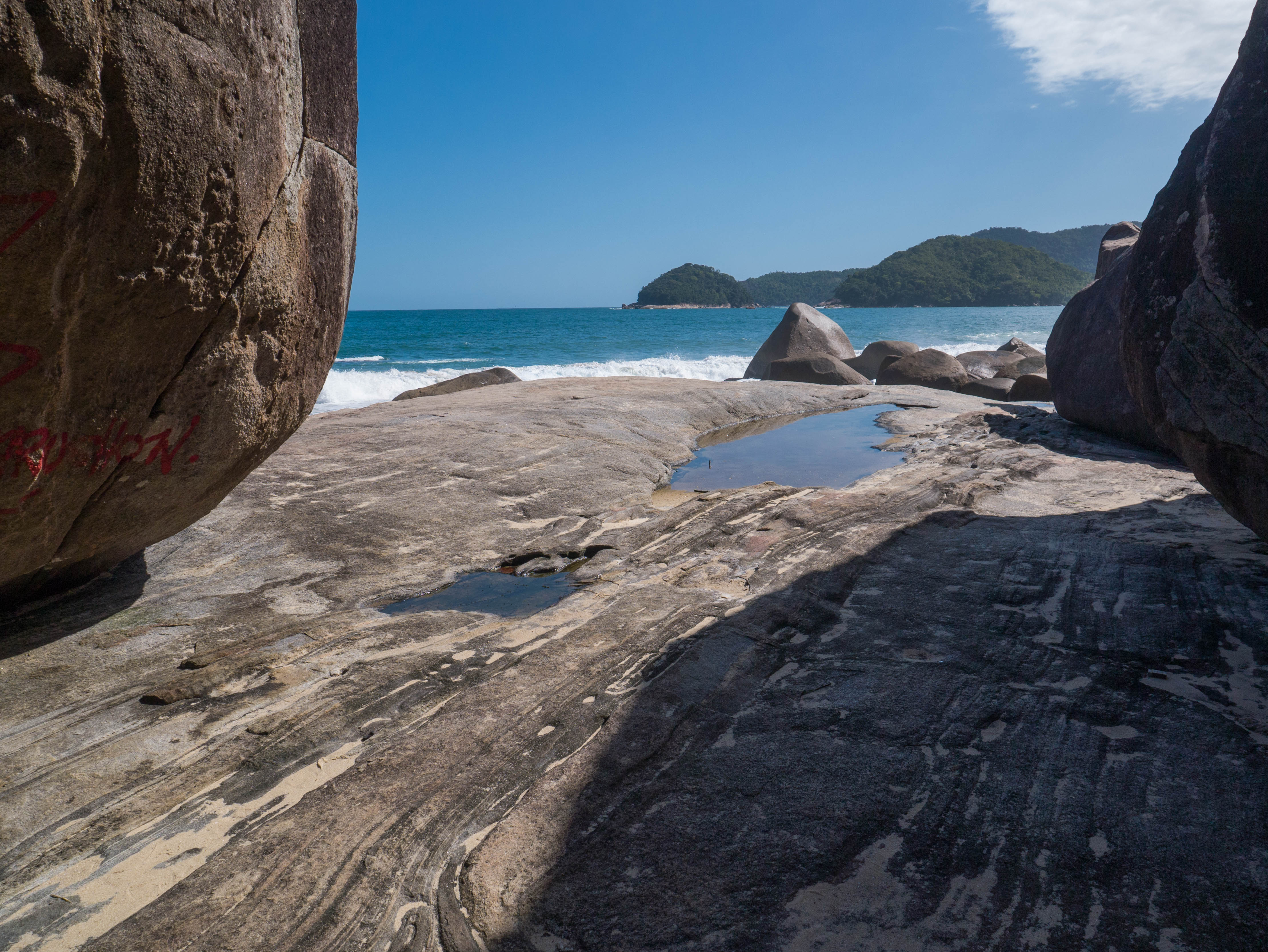 A droite de Praia do Meio, vous trouverez une petite rivière qui a de la peine à se jeter dans la mer. Traversez-la et prenez le petit sentier (un peu difficile à trouver) qui grimpe le long d’une petite falaise. Après une petite randonnée d’un quart d’heure, vous vous trouverez devant une des plus jolies plages de Trindade : Praia do Caxadaço, qui est plutôt le spot des surfeurs vu les vagues et le courant. Comme elle est un peu plus difficile d’accès (via la petite randonnée ou un passage en bateau depuis Praia do Meio), elle est bien moins fréquentée que les autres (vous trouverez juste un courageux vendeur qui attend les promeneurs à la sortie du sentier avec des boissons fraîches et un petit bar à l’autre bout de la plage). Le seul trafic que vous verrez sur cette plage sont les curieux qui doivent traverser toute la plage pour trouver le sentier qui mène à une des attractions principales de Trindade : la piscine naturelle.