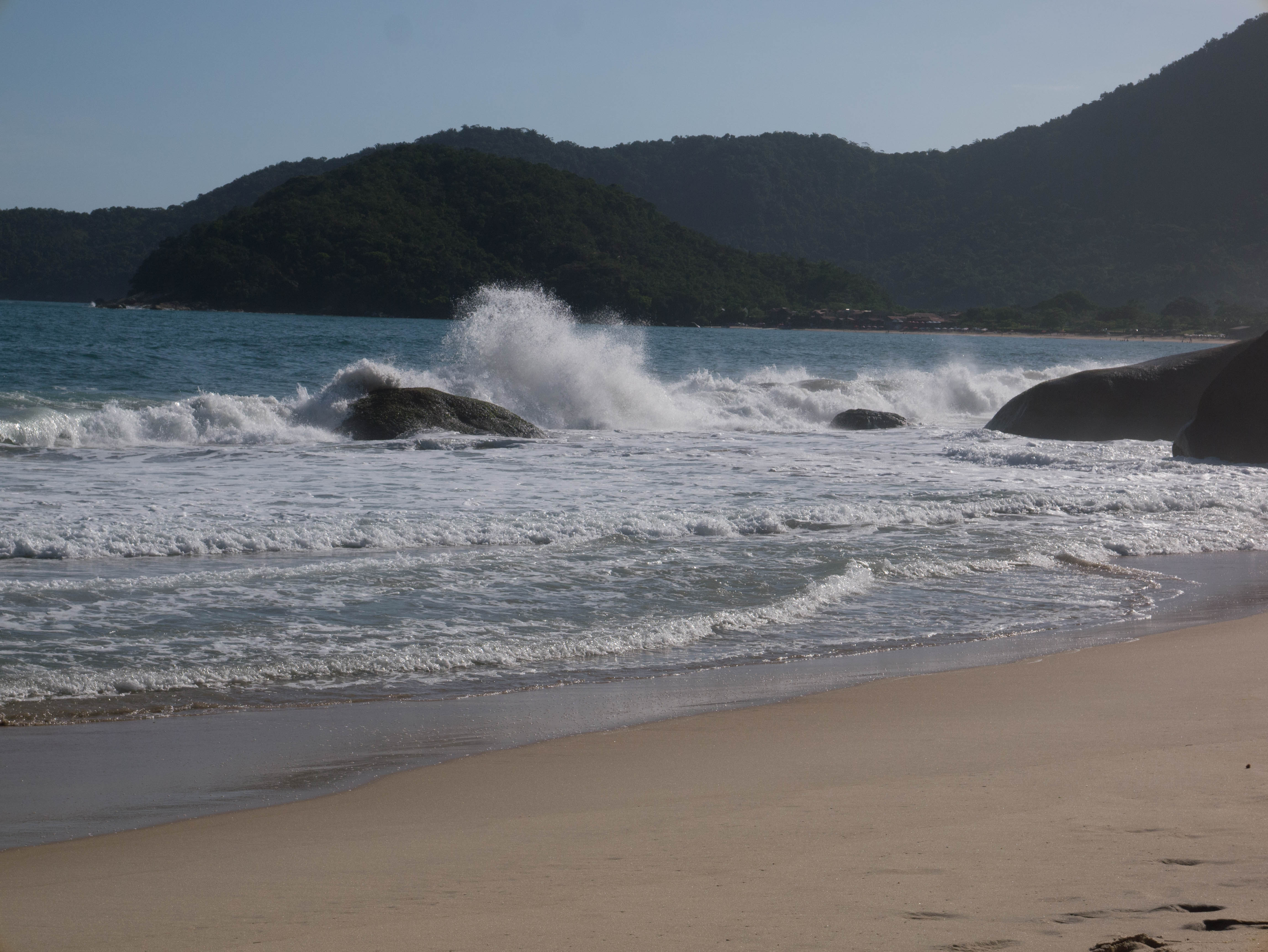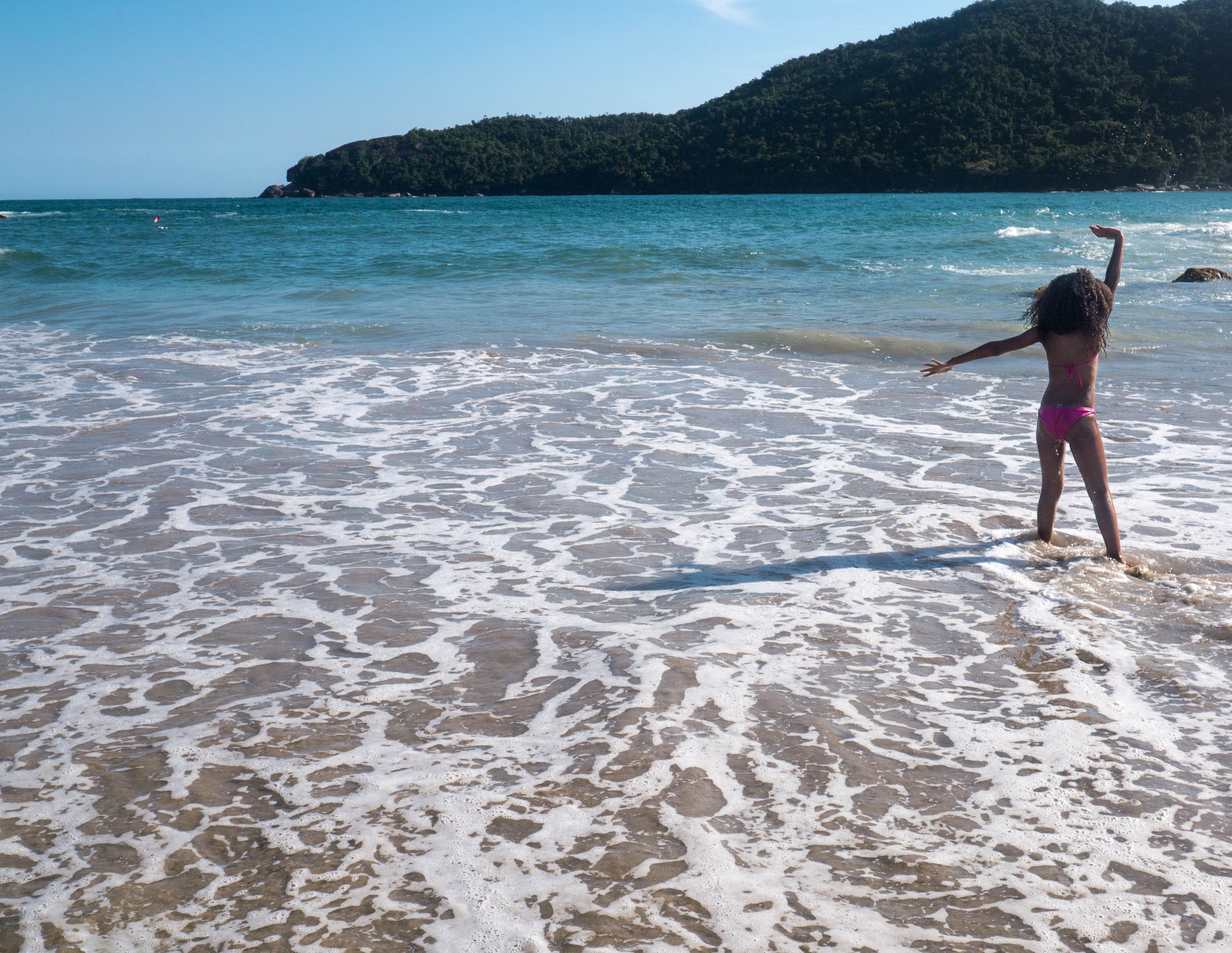 Première étape de la journée : Praia do Meio. Pour y accéder, on emprunte un petit sentier (attention aux serpents qui se cachent dans les herbes basses) En fait d’une plage, il s’agit de deux étendues de sable blond, séparées par un petit promontoire rocheux. La plage de gauche est relativement calme et de nombreux enfants y barbotent. Celle de droite est un peu plus agitée et parfaite pour du bodyboard ! D’ailleurs, de nombreux gamins affrontent les vagues et ne vous étonnez pas, si comme moi, vous vous ramenez avec une planche, qu’on vienne vous supplier pour la leur prêter (le plus dur étant de leur reprendre malgré les supplications).
