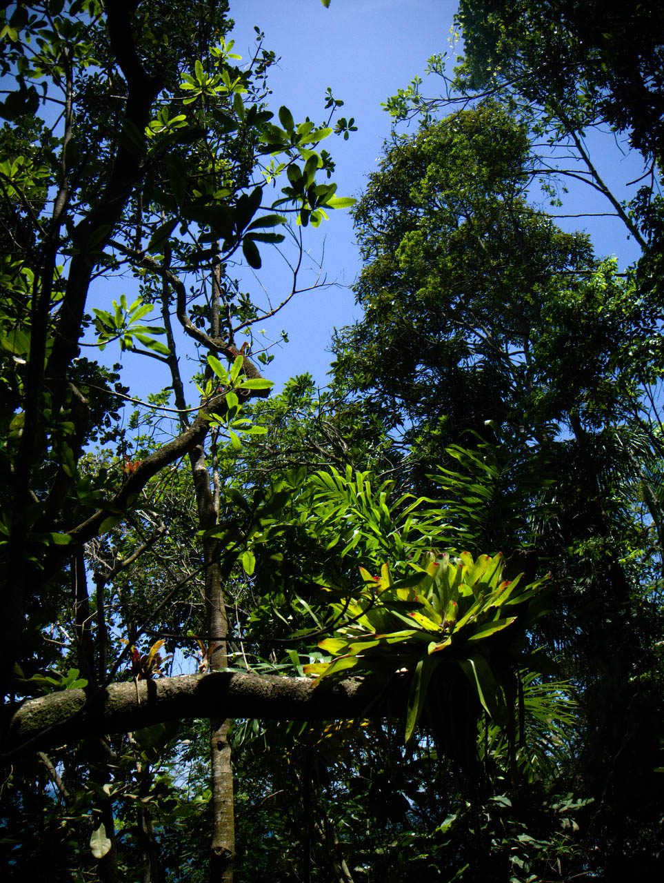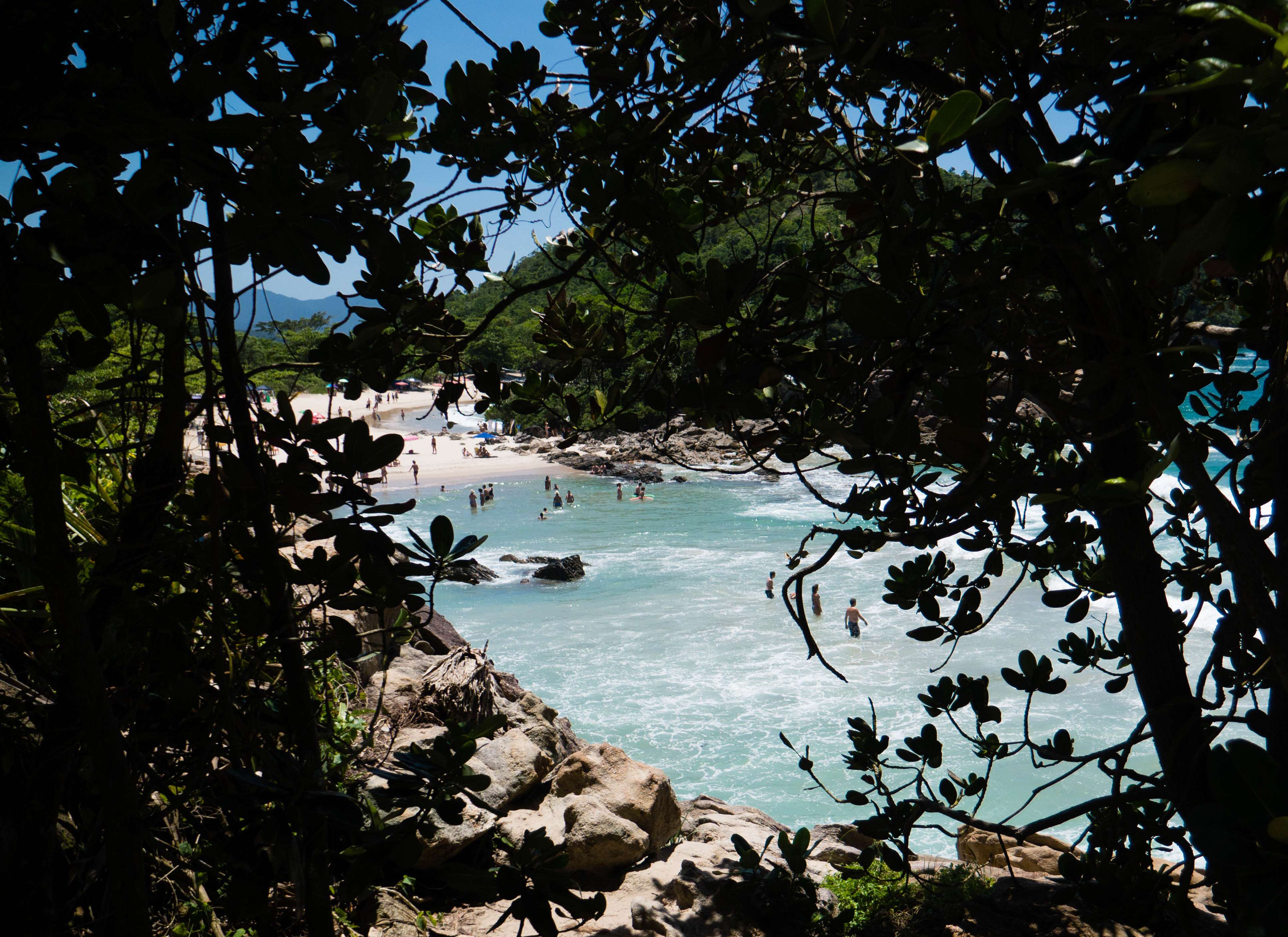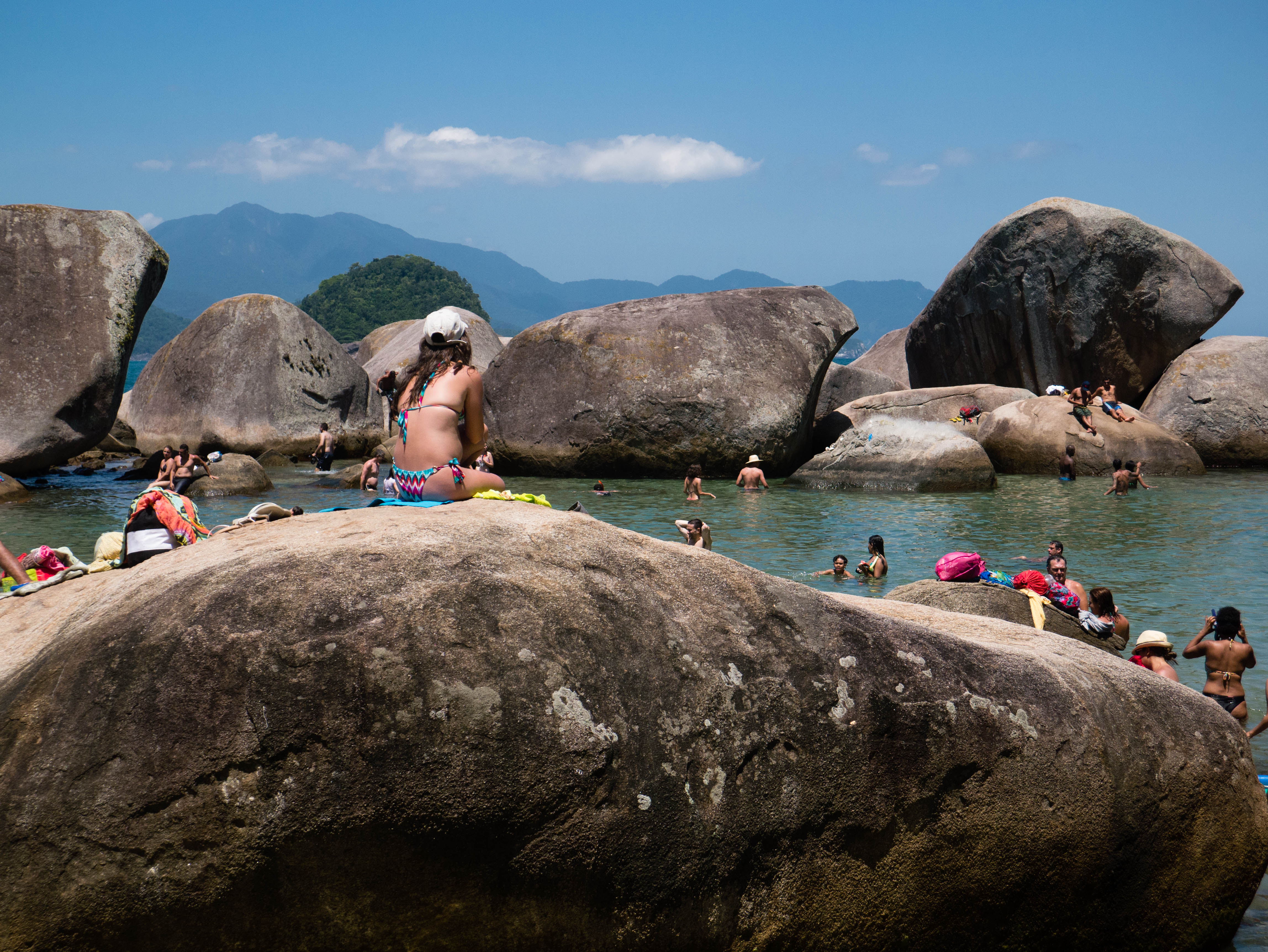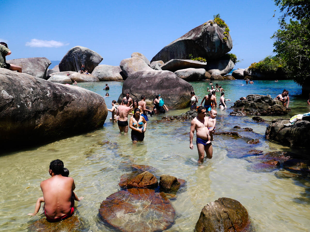 Pour accéder à la piscine naturelle, c’est à nouveau une mini-randonnée d’une grosse vingtaine de minutes dans la forêt (toujours à flanc de colline). Après cette petite promenade, la forêt s’ouvre sur un véritable bassin d’eau de mer, naturellement fermé par de grosses pierres polies par l’océan. A l’intérieur, plein de poissons, emprisonnés par la marée basse, qu’on peut admirer à faible profondeur…. mais aussi plein de gens ! Il semble que tout ce que compte Trindade de touristes se soit donné rendez-vous ici. Je m’éloigne un petit peu avec masque et tuba, dans des coins plus tranquilles, un peu plus profonds et surtout plus poissonneux (il y a de nombreuses familles avec enfants qui bien évidemment, ne s’éloignent pas trop du bord, en nageant 3 mètres plus loin, ça va déjà mieux). Le lieu est surprenant… et même idyllique mais malheureusement complètement gâché par le nombre de personnes présentes. Après une heure de barbotage parmi les poissons sergents et autres perroquets, prise d’une crise d’agoraphobie, je décide de quitter les lieux.