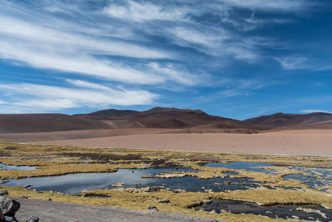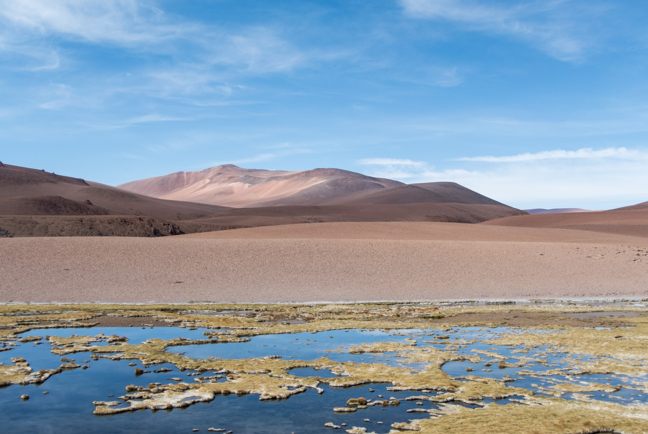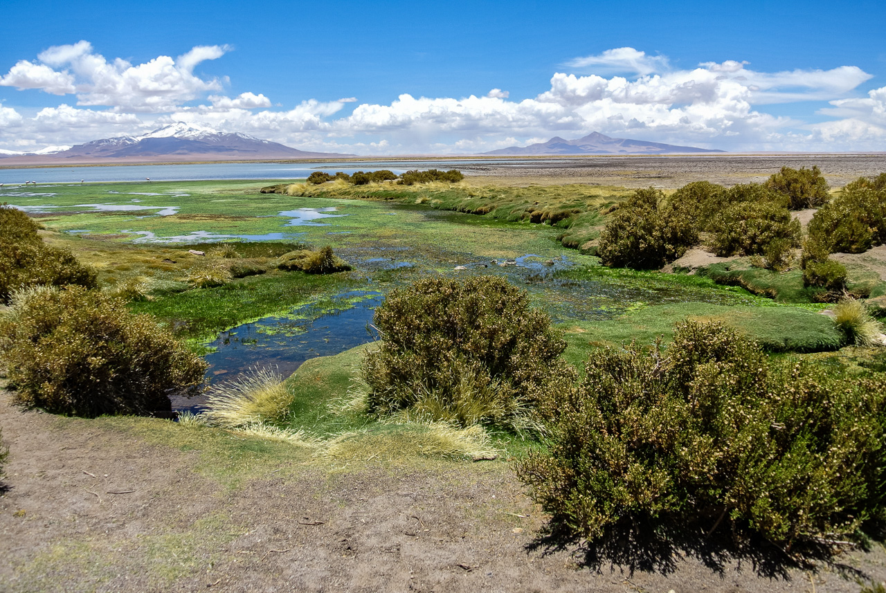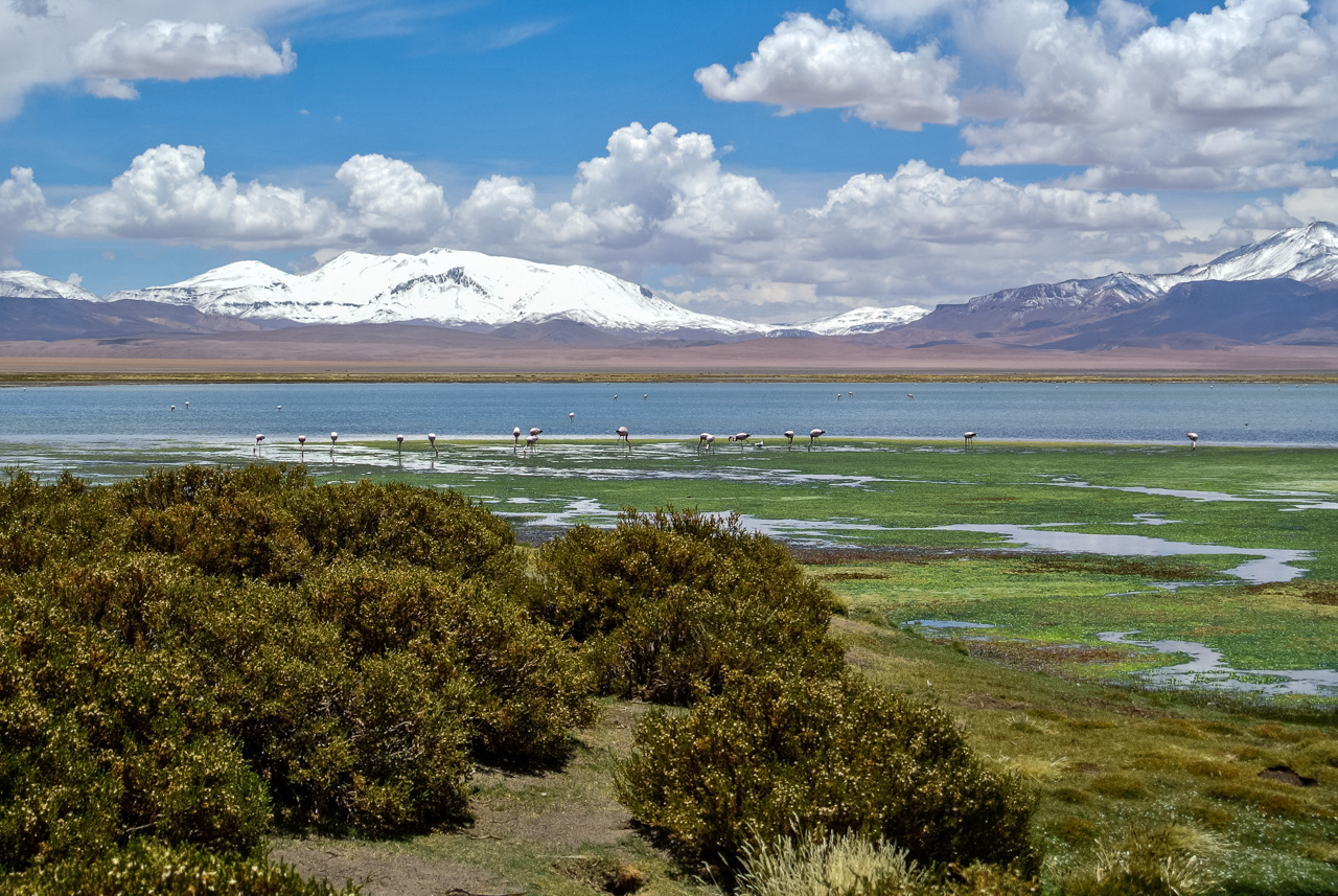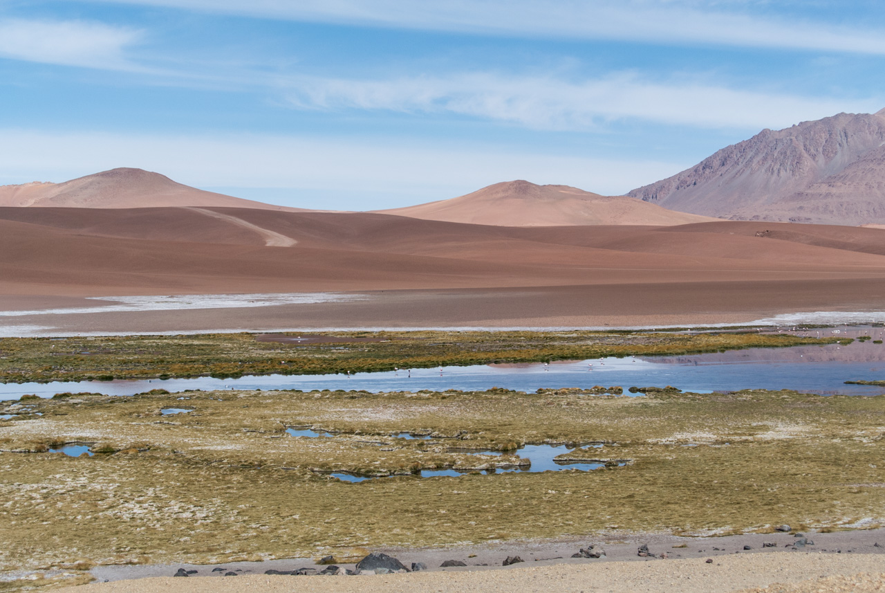 Si vous ne devez faire qu’une excursion, je vous recommande celle-ci. Départ TRÈS tôt le matin (à 7 heures) car il y a de la route à faire pour atteindre le but et crois-moi, Lectrice, Lecteur, ça en vaut VRAIMENT la peine. Avant de te lancer néanmoins, petit avertissement : le point le plus haut de cette excursion monte à 4900 mètres!!! Ce n’est pas rien, il faut donc être prudent lorsqu’on est pas habitués. L’excursion commence donc par un arrêt au Salar de Pujsas, une zone humide où la vie abonde, un étrange écran vert dans un paysage où rien ne pousse. Aux alentours, on ne voit que des collines et des montagnes dénudées. et pourtant… la lagune est remplie, ici aussi, de flamants. La vie a ce talent de trouver où s’infiltrer n’importe où!