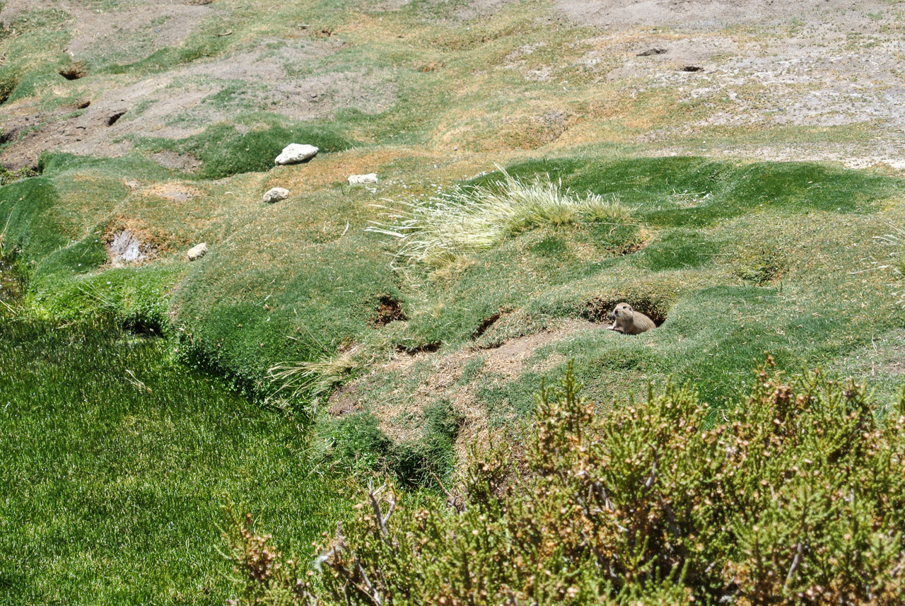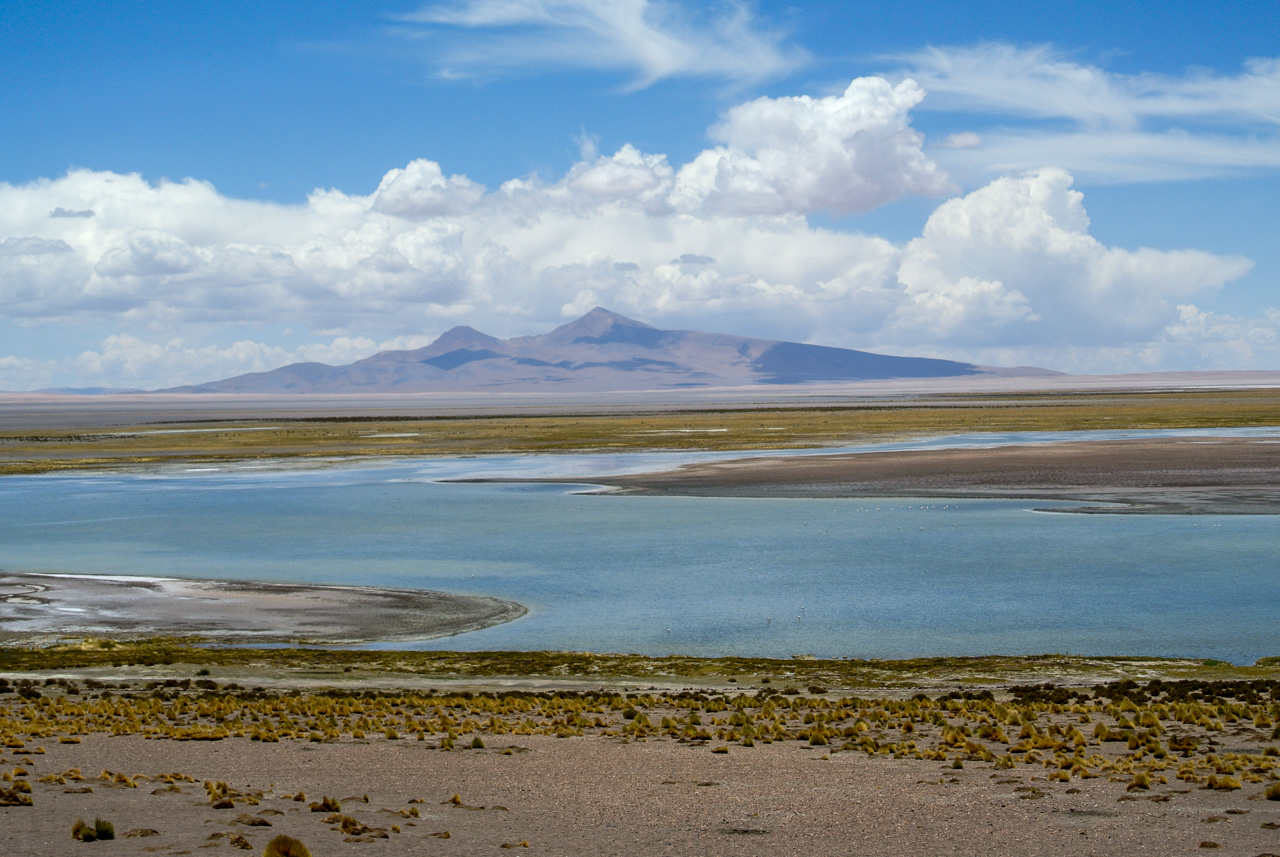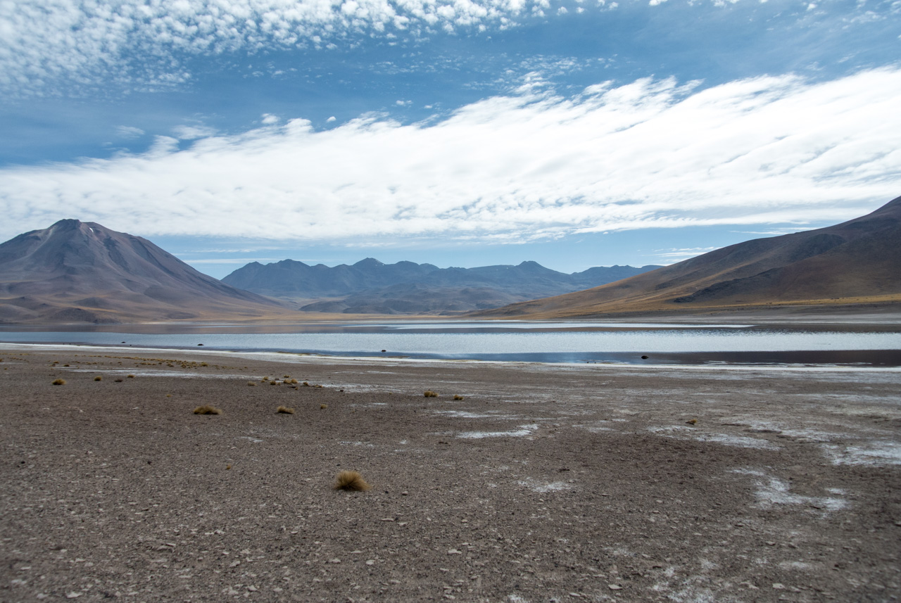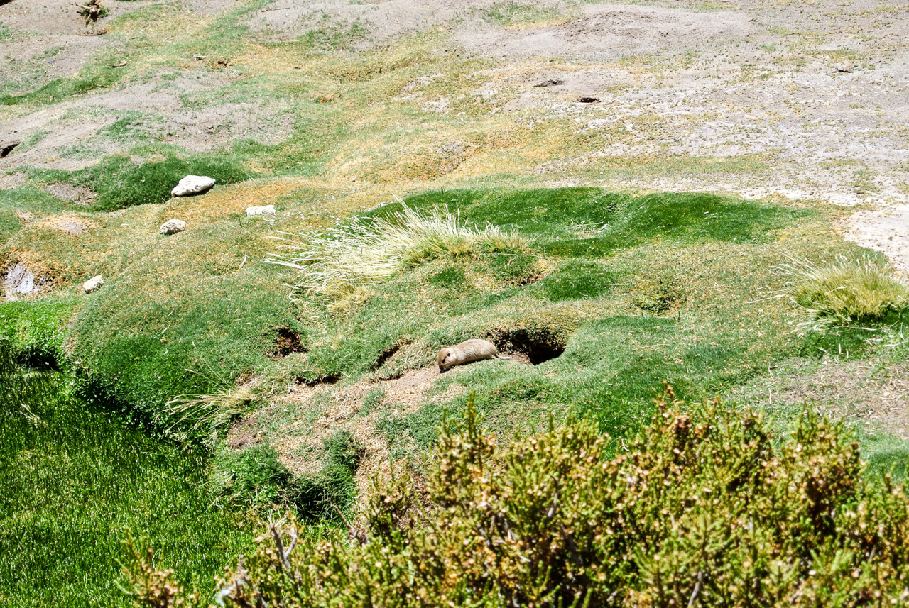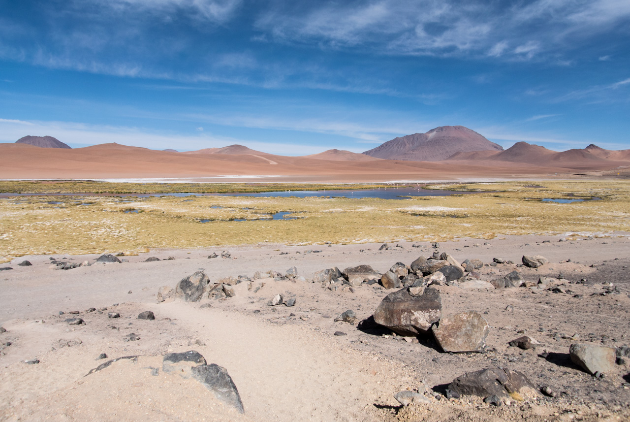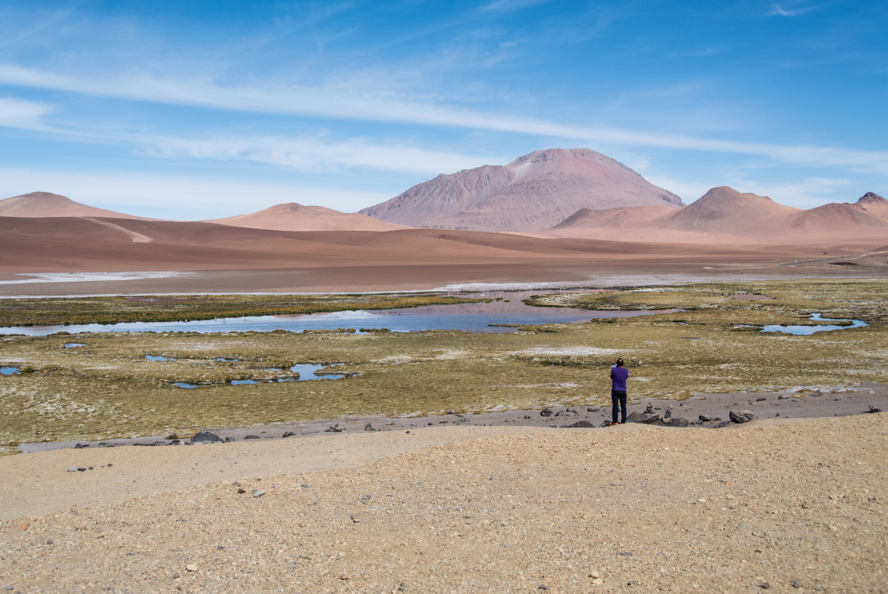 Si vous ne devez faire qu’une excursion, je vous recommande celle-ci. Départ TRÈS tôt le matin (à 7 heures) car il y a de la route à faire pour atteindre le but et crois-moi, Lectrice, Lecteur, ça en vaut VRAIMENT la peine. Avant de te lancer néanmoins, petit avertissement : le point le plus haut de cette excursion monte à 4900 mètres!!! Ce n’est pas rien, il faut donc être prudent lorsqu’on est pas habitués. L’excursion commence donc par un arrêt au Salar de Pujsas, une zone humide où la vie abonde, un étrange écran vert dans un paysage où rien ne pousse. Aux alentours, on ne voit que des collines et des montagnes dénudées. et pourtant… la lagune est remplie, ici aussi, de flamants. La vie a ce talent de trouver où s’infiltrer n’importe où!