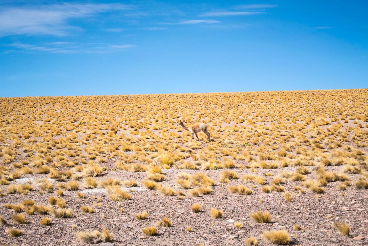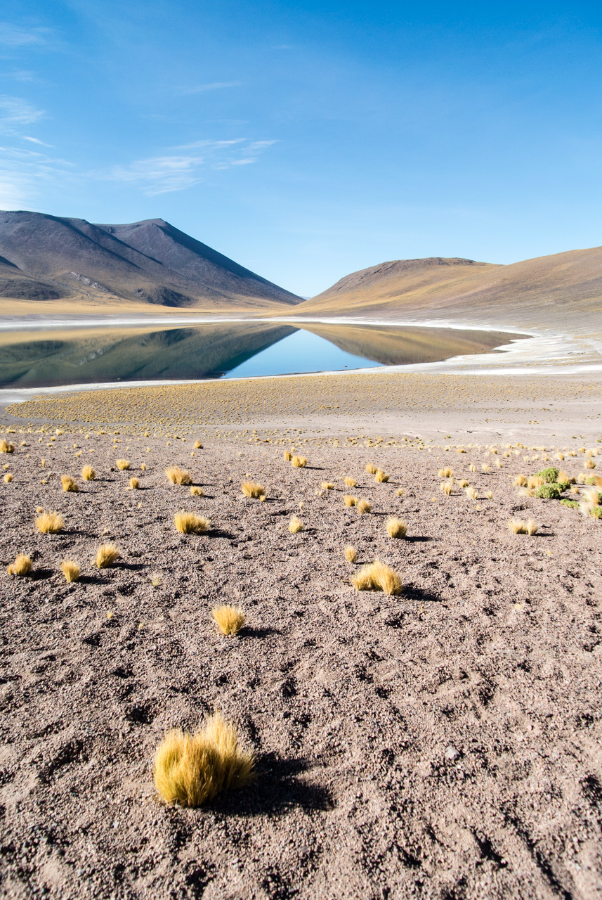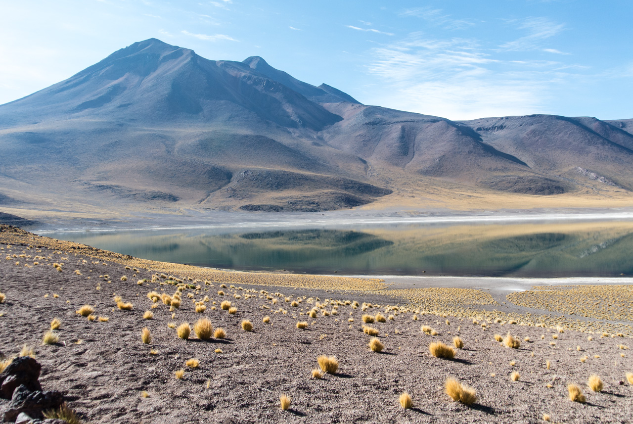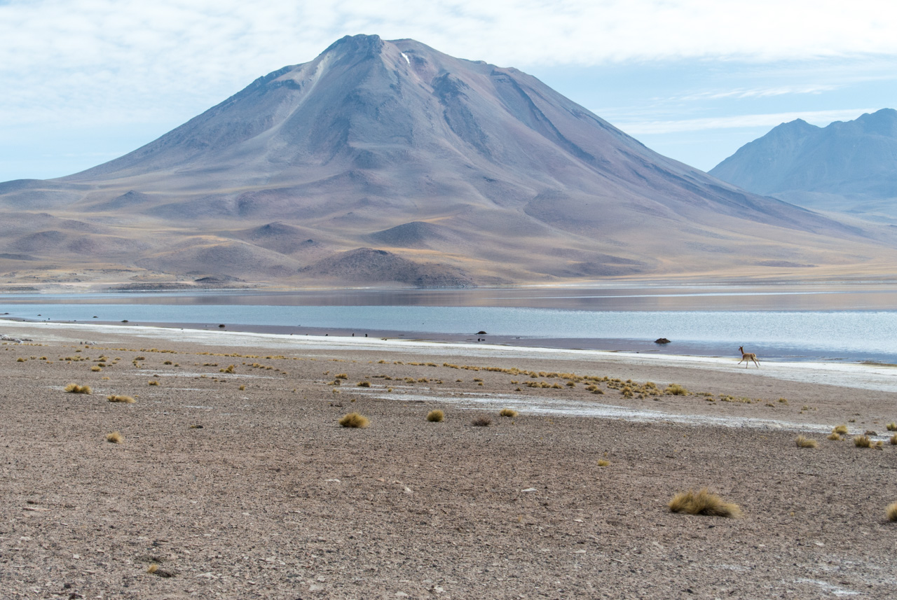 Pendant qu’on papote, le paysage désertique de l’Atacama défile dans les vitres du bus pendant que lentement; le soleil se lève. C’est que pour visiter l’Atacama, il faut se lever tôt, pour profiter de lumière matin, et de sa qualité. Direction : les Lagunas altiplanicas. Et elles ne s’appellent pas comme çà pour rien : elles se situent à 4000 mètres (attention ai mal de l’altitude). L’Altiplano est une immense plaine d’altitude, située à cheval sur quatre pays (le Chili, L’Argentine, la Bolivie et le Pérou). Dans un environnement hostile (beaucoup de vent et peu de pluie), seules quelques touffes d’herbes, du lichen et des buissons rabougris peuvent survivre mais par contre, les animaux ne manquent pas : le lama et ses cousins le guanaco et la vigogne, des renards, des rongeurs et surtout, une foule d’oiseau dont pas moins de 4 espèces de flamants roses qui nichent et se nourrissent dans les lagunes salées. C’est d’ailleurs à l’intérieur de la Réserve nationale Los Flamencos que se situent ces lagunes. Elles sont deux lagunes, Miniques et Miscantil, situés au pied des volcans du même nom. Par le hasard de la nature, les pieds du volcan Miscantil donnent l’impression de se croiser et se reflètent comme dans un miroir dans les eaux de sa lagune, formant comme le signe de l’infini dans un air d’une transparence presque irréelle. Mais ce qui reste dans ma mémoire, c’est un troupeau de vigognes, lancées au galop sur les rives de Miniques… désormais, pour moi, le symbole de la liberté, ce sont elles : des drôles d’animaux au long cou courant librement dans la lumière du matin !