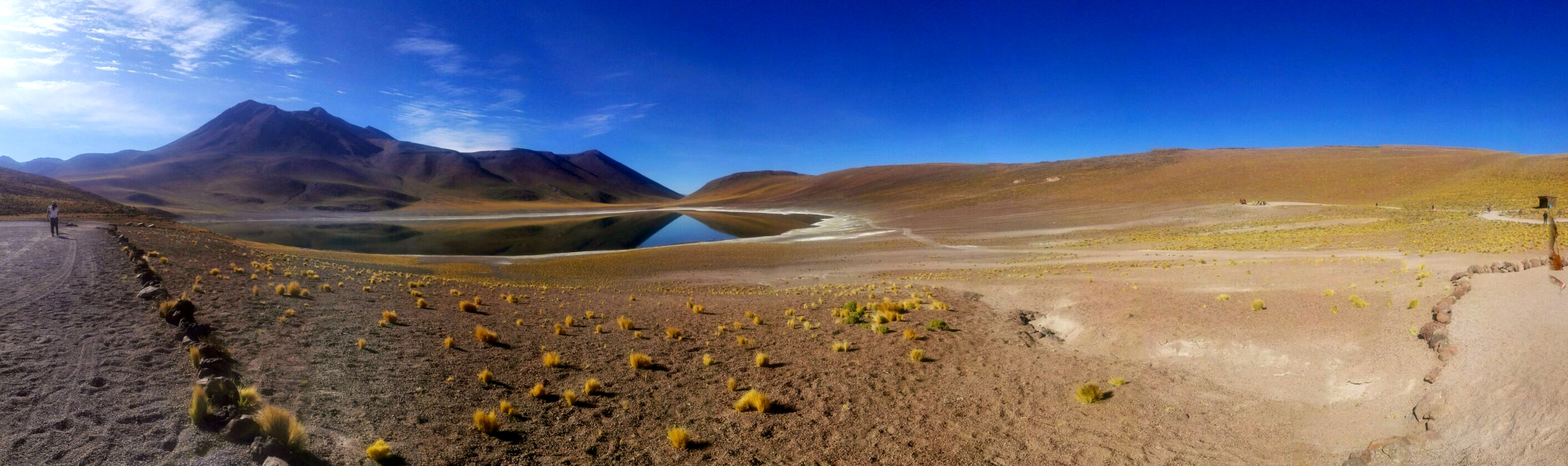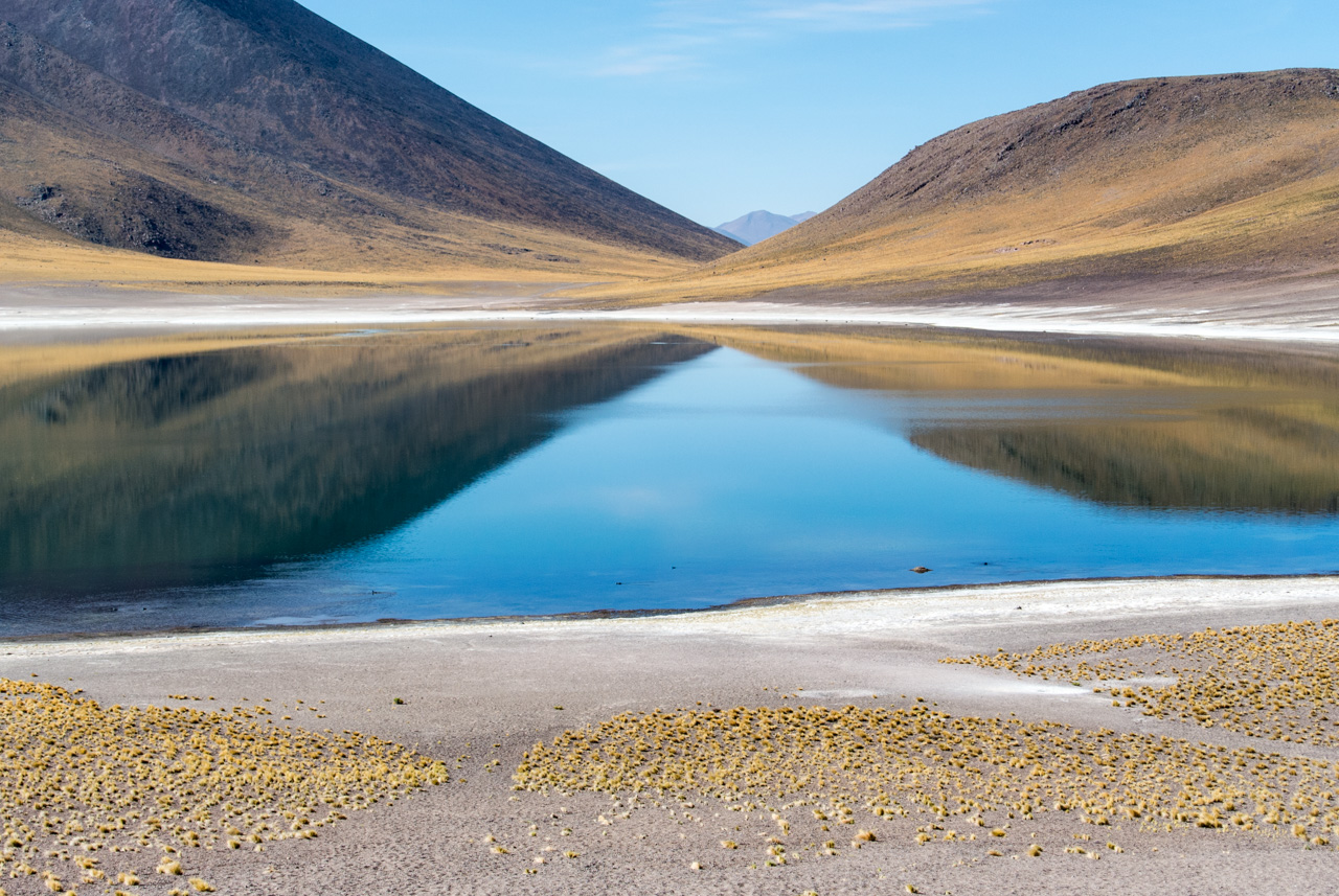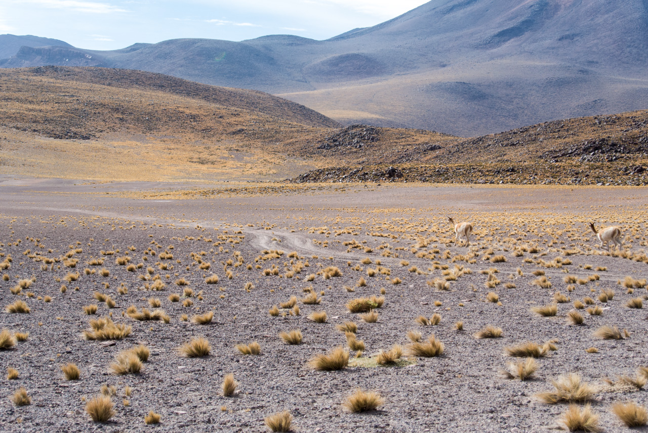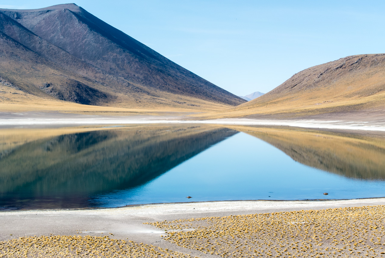 Pendant qu’on papote, le paysage désertique de l’Atacama défile dans les vitres du bus pendant que lentement; le soleil se lève. C’est que pour visiter l’Atacama, il faut se lever tôt, pour profiter de lumière matin, et de sa qualité. Direction : les Lagunas altiplanicas. Et elles ne s’appellent pas comme çà pour rien : elles se situent à 4000 mètres (attention ai mal de l’altitude). L’Altiplano est une immense plaine d’altitude, située à cheval sur quatre pays (le Chili, L’Argentine, la Bolivie et le Pérou). Dans un environnement hostile (beaucoup de vent et peu de pluie), seules quelques touffes d’herbes, du lichen et des buissons rabougris peuvent survivre mais par contre, les animaux ne manquent pas : le lama et ses cousins le guanaco et la vigogne, des renards, des rongeurs et surtout, une foule d’oiseau dont pas moins de 4 espèces de flamants roses qui nichent et se nourrissent dans les lagunes salées. C’est d’ailleurs à l’intérieur de la Réserve nationale Los Flamencos que se situent ces lagunes. Elles sont deux lagunes, Miniques et Miscantil, situés au pied des volcans du même nom. Par le hasard de la nature, les pieds du volcan Miscantil donnent l’impression de se croiser et se reflètent comme dans un miroir dans les eaux de sa lagune, formant comme le signe de l’infini dans un air d’une transparence presque irréelle. Mais ce qui reste dans ma mémoire, c’est un troupeau de vigognes, lancées au galop sur les rives de Miniques… désormais, pour moi, le symbole de la liberté, ce sont elles : des drôles d’animaux au long cou courant librement dans la lumière du matin !