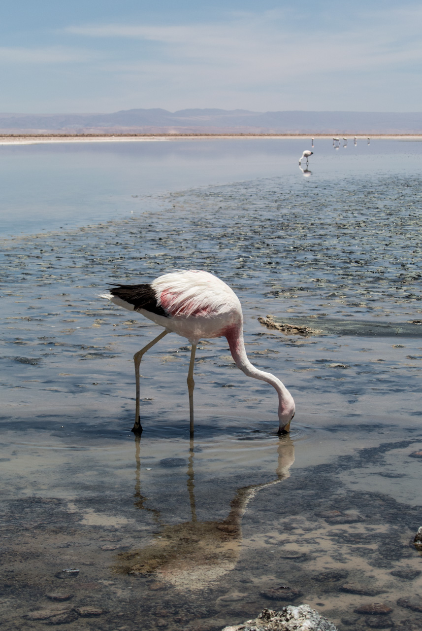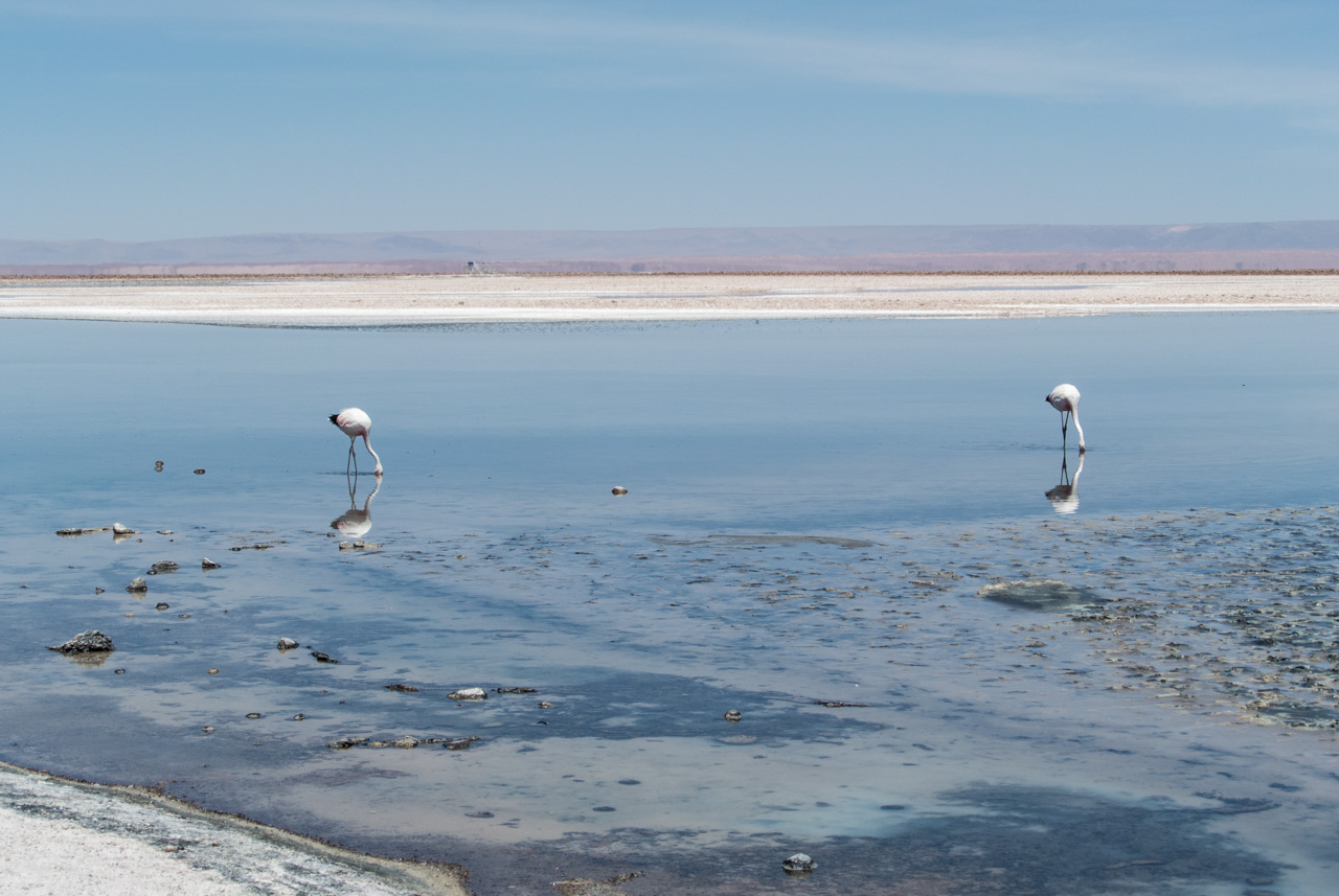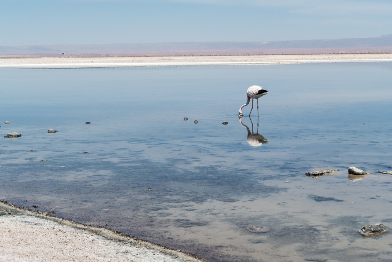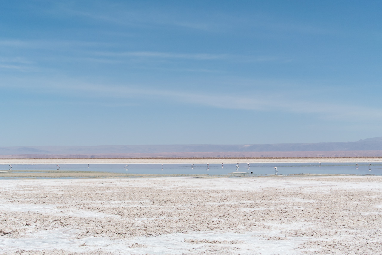 A l’entrée, on trouve un centre d’information qui vous renseigne sur les différentes espèces de flamants qu’on peut y trouver, comment ils ne nourrissent, ainsi que d’autres espèces présentes. Et le secret pour reconnaître un flamand d’un autre, c’est d’observer les couleurs des plumes des queues et du bords des ailes ainsi que les pâtes : queues noires et pâtes jaunes : c’est un flamant des Andes! Pas de bout de queue noire? C’est un flamant du Chili! Les autres, par élimination, sont des flamants de James. Armées par ces nouvelles connaissances, Susan et moi nous lançons sur les sentiers, bien balisés, de la lagune. Les volatiles, très habitués à la présence de spectateurs, ne semblent pas perturbés et continuent de se nourrir calmement de crevettes qui leur donnent leur jolie couleur rose. C’est fou, ils passent la plupart du temps le bec dans l’eau peu profonde à gratter le fond pour trouver ces crustacés.Ici aussi, le spectacle est hypnotique. Il n’existe plus que du bleu, celui du ciel et de la lagune, le blanc et le gris du sel avec quelques taches rosâtres : les flamants et leurs reflets dans l’eau. A l’horizon, on aperçoit quelques montagnes mais le soleil et sa réflexion sur le blanc du sel leur donne un aspect délavé et lointain.