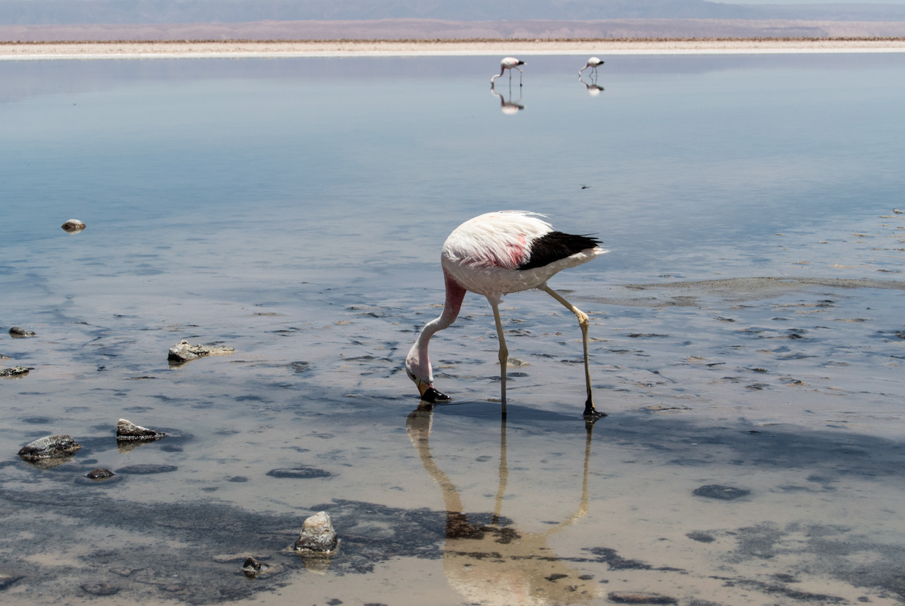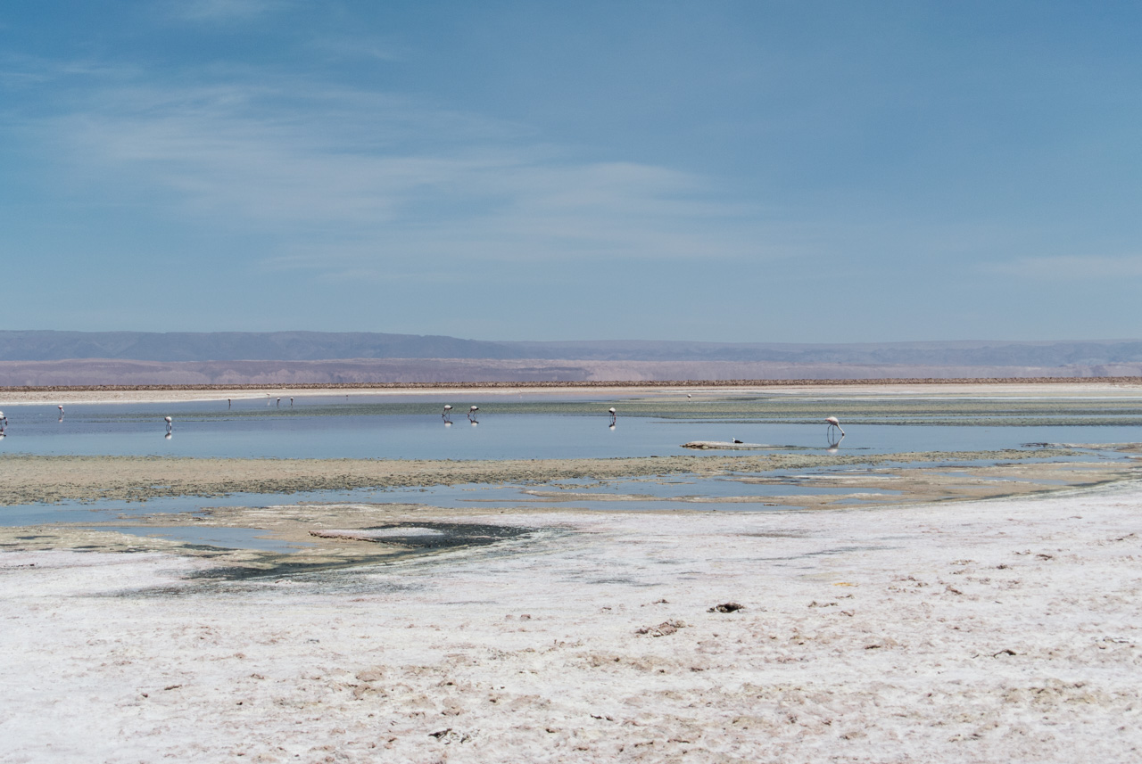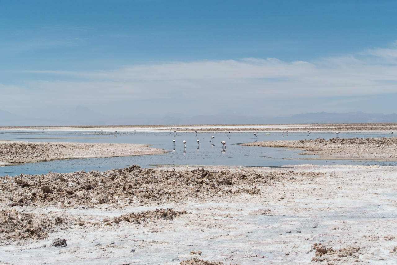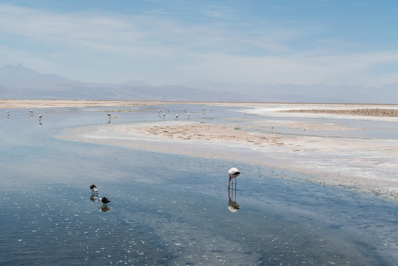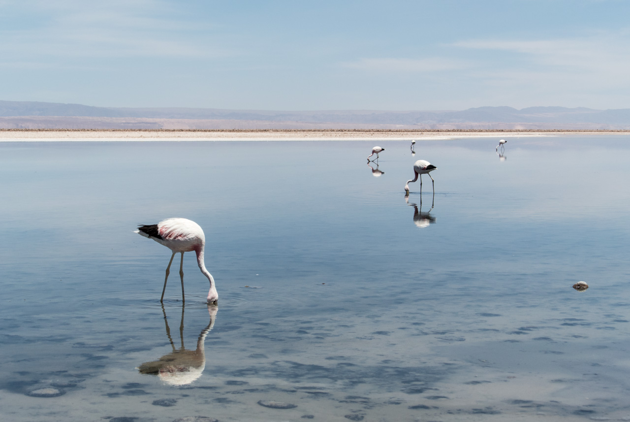 A l’entrée, on trouve un centre d’information qui vous renseigne sur les différentes espèces de flamants qu’on peut y trouver, comment ils ne nourrissent, ainsi que d’autres espèces présentes. Et le secret pour reconnaître un flamand d’un autre, c’est d’observer les couleurs des plumes des queues et du bords des ailes ainsi que les pâtes : queues noires et pâtes jaunes : c’est un flamant des Andes! Pas de bout de queue noire? C’est un flamant du Chili! Les autres, par élimination, sont des flamants de James. Armées par ces nouvelles connaissances, Susan et moi nous lançons sur les sentiers, bien balisés, de la lagune. Les volatiles, très habitués à la présence de spectateurs, ne semblent pas perturbés et continuent de se nourrir calmement de crevettes qui leur donnent leur jolie couleur rose. C’est fou, ils passent la plupart du temps le bec dans l’eau peu profonde à gratter le fond pour trouver ces crustacés.Ici aussi, le spectacle est hypnotique. Il n’existe plus que du bleu, celui du ciel et de la lagune, le blanc et le gris du sel avec quelques taches rosâtres : les flamants et leurs reflets dans l’eau. A l’horizon, on aperçoit quelques montagnes mais le soleil et sa réflexion sur le blanc du sel leur donne un aspect délavé et lointain.