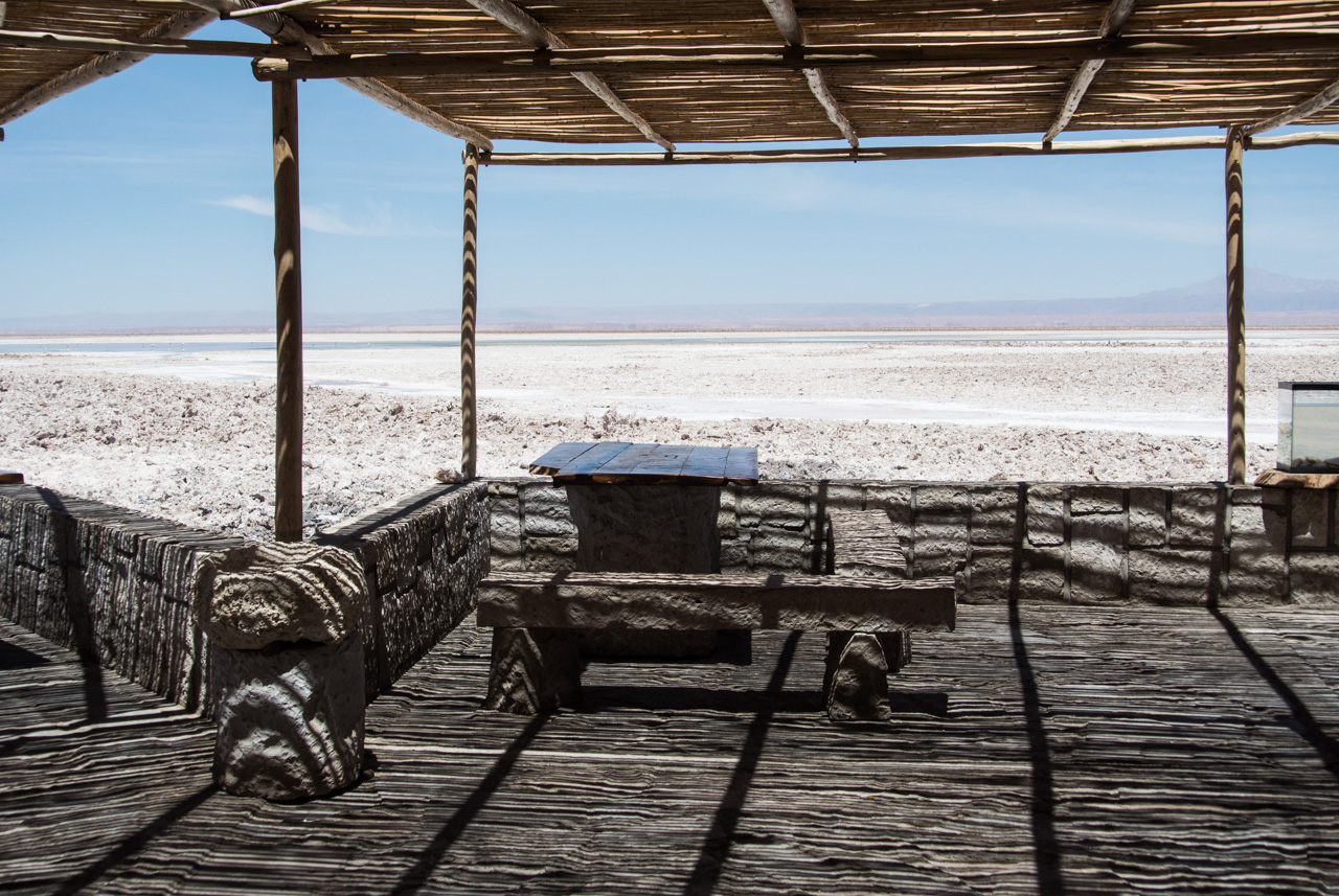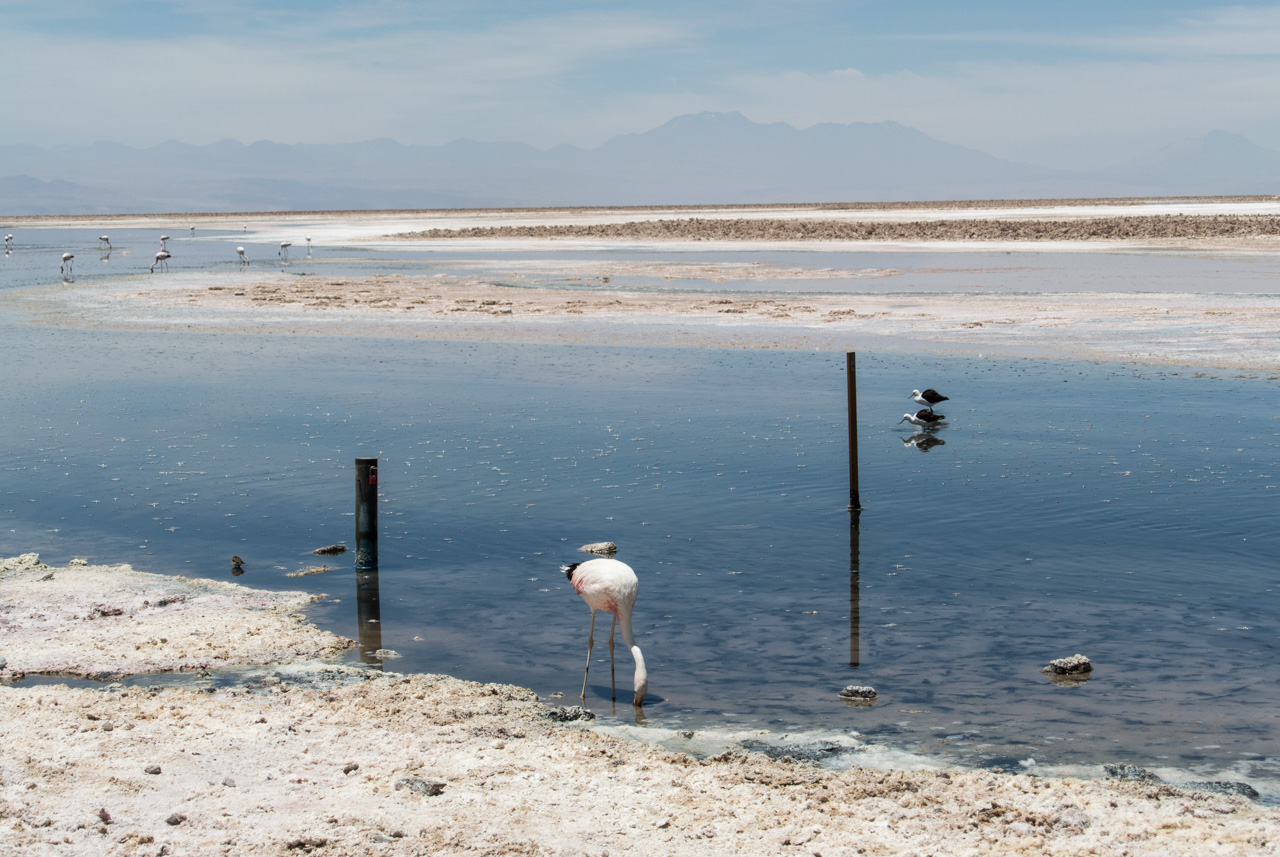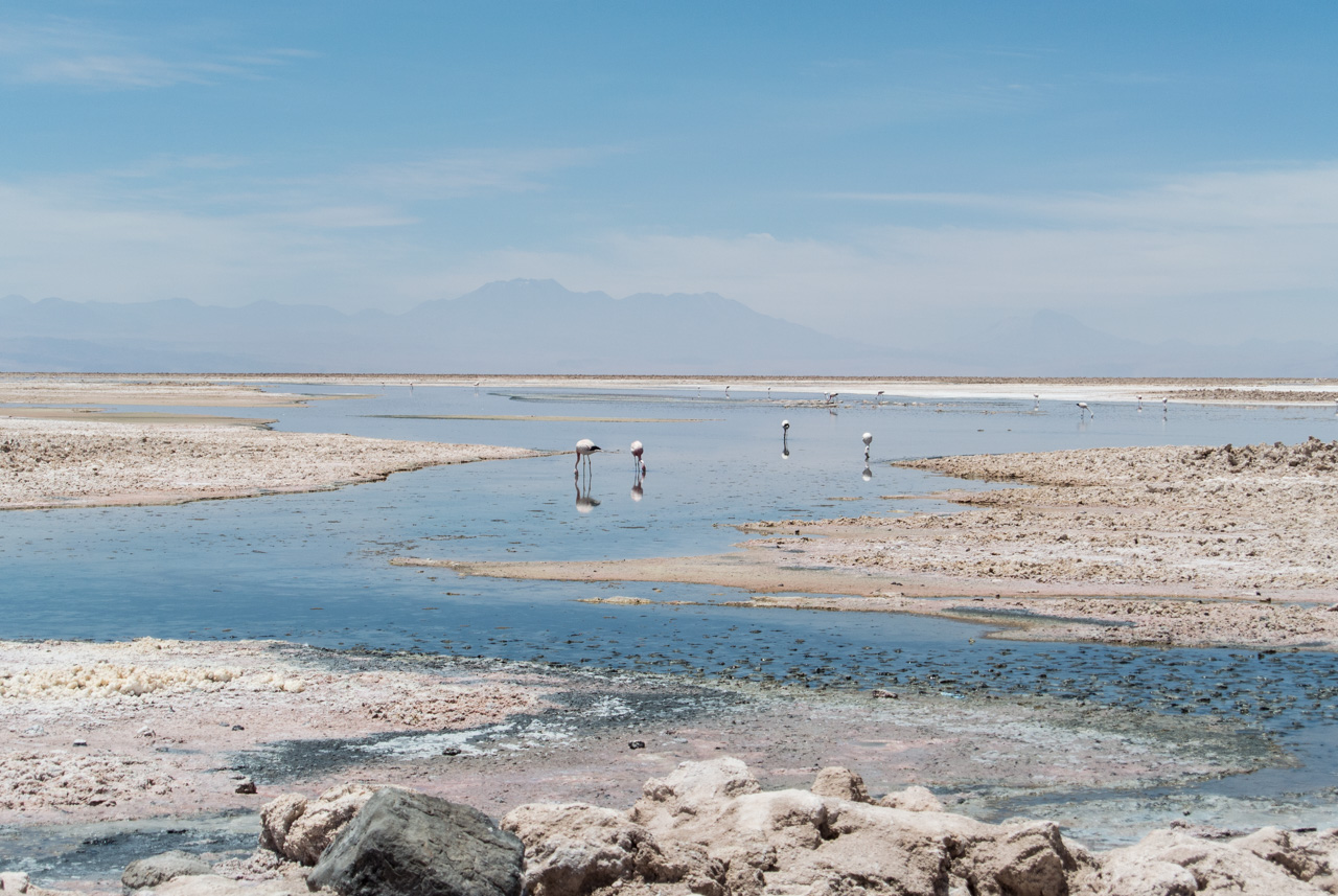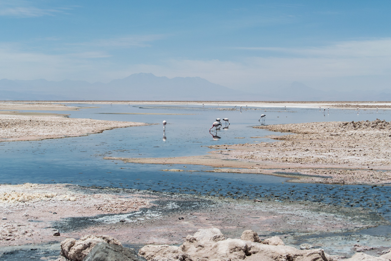 A l’entrée, on trouve un centre d’information qui vous renseigne sur les différentes espèces de flamants qu’on peut y trouver, comment ils ne nourrissent, ainsi que d’autres espèces présentes. Et le secret pour reconnaître un flamand d’un autre, c’est d’observer les couleurs des plumes des queues et du bords des ailes ainsi que les pâtes : queues noires et pâtes jaunes : c’est un flamant des Andes! Pas de bout de queue noire? C’est un flamant du Chili! Les autres, par élimination, sont des flamants de James. Armées par ces nouvelles connaissances, Susan et moi nous lançons sur les sentiers, bien balisés, de la lagune. Les volatiles, très habitués à la présence de spectateurs, ne semblent pas perturbés et continuent de se nourrir calmement de crevettes qui leur donnent leur jolie couleur rose. C’est fou, ils passent la plupart du temps le bec dans l’eau peu profonde à gratter le fond pour trouver ces crustacés.Ici aussi, le spectacle est hypnotique. Il n’existe plus que du bleu, celui du ciel et de la lagune, le blanc et le gris du sel avec quelques taches rosâtres : les flamants et leurs reflets dans l’eau. A l’horizon, on aperçoit quelques montagnes mais le soleil et sa réflexion sur le blanc du sel leur donne un aspect délavé et lointain.