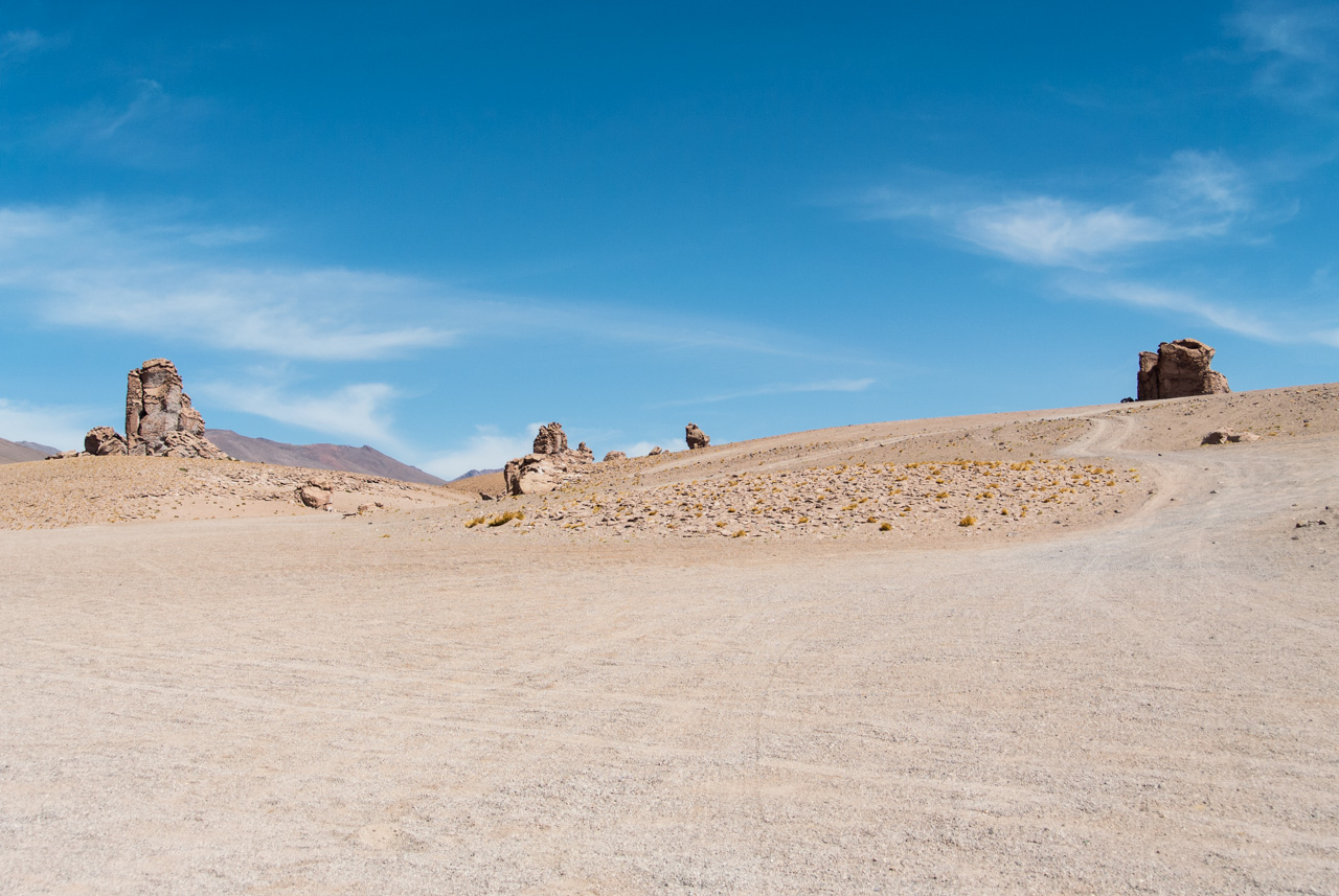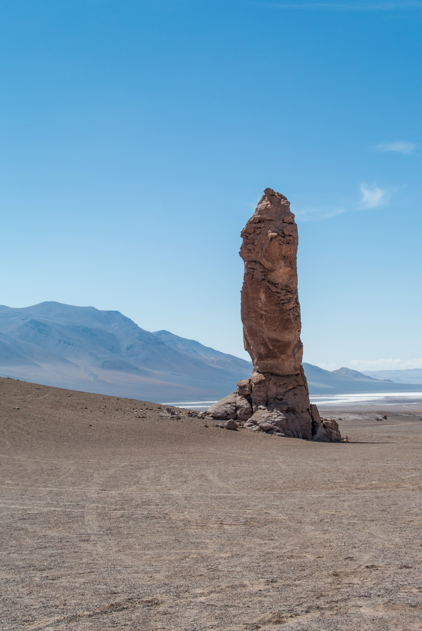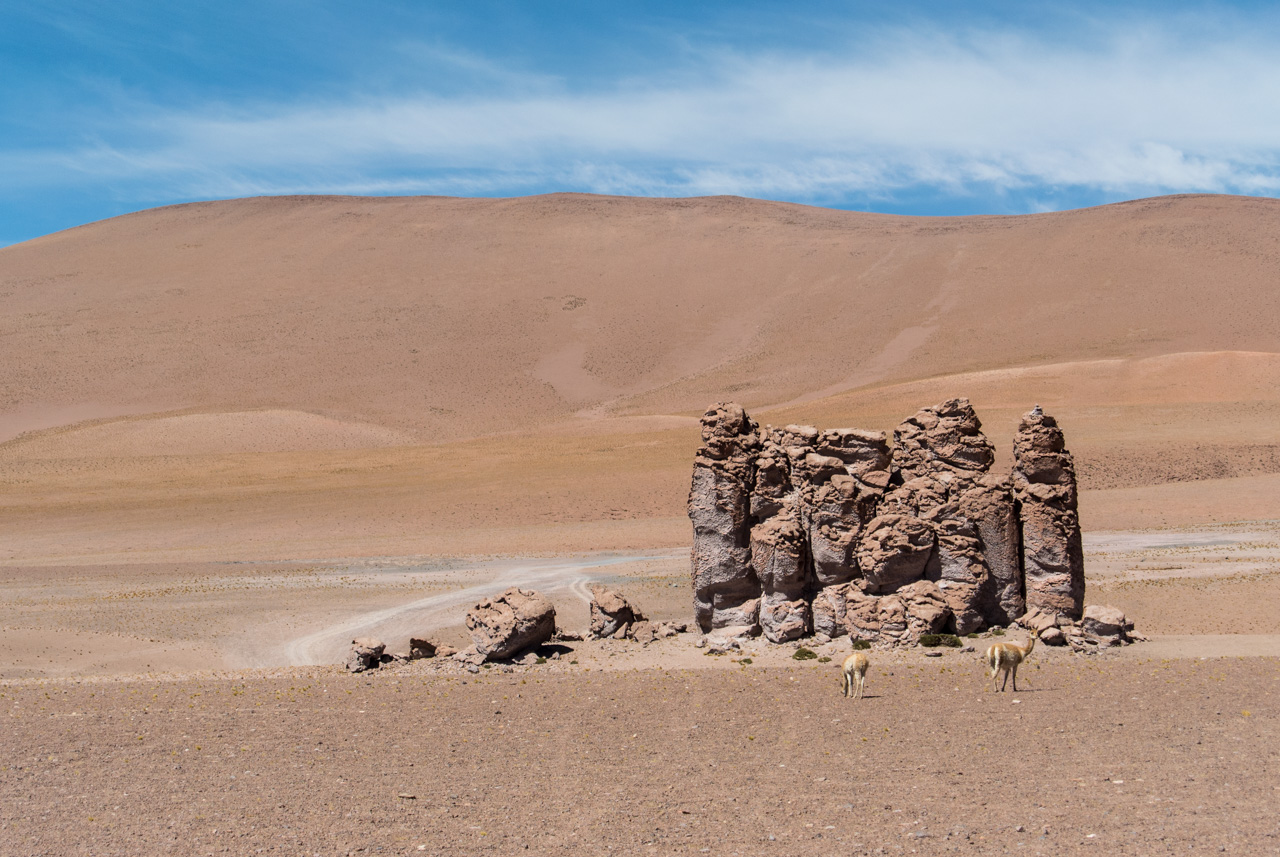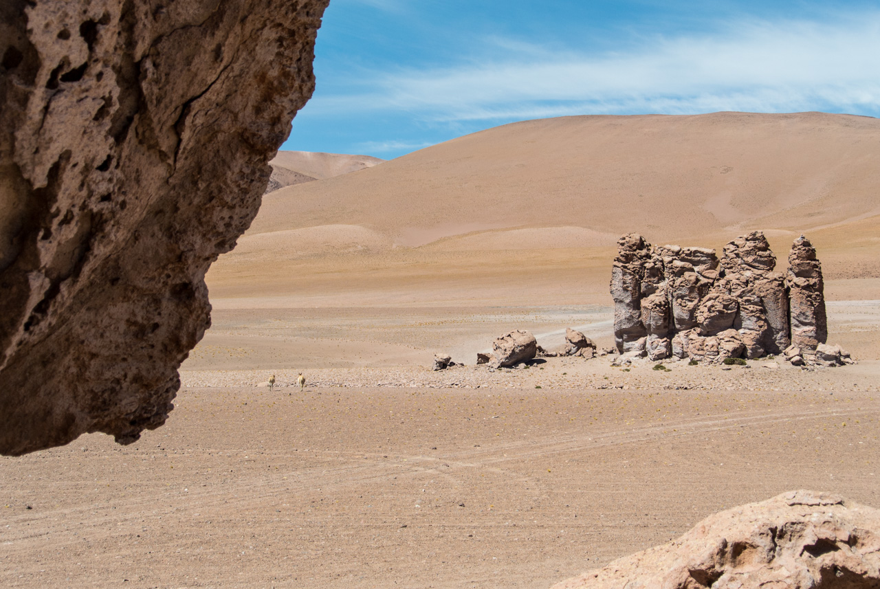 Une fois que l’on quitte la lagune, le monde devient progressivement de plus en plus minéral. La route pavée s’arrête… nous sommes dans le coin le plus reculé du parc et il n’y a plus de route ! Rien que les traces de pneus de véhicules, que vous ne verrez d’ailleurs tant l’espace est vaste. Et puis soudain, un géant : une sentinelle solitaire, puis d’autres : on les appelle ces pierres dressées vers le ciel les moines de la Pacara. Et comme les moines se promènent toujours à l’ombre d’édifices religieux, ce sont les ‘cathédrales » que l’on voit toutes proches.Nous aurons l’occasion de nous promener à loisirs et de choisir « notre » moine. Les pierres sont tellement énormes que nous avons la permission de grimper dessus. Je ne me prive pas et m’installe sur une plateforme rocheuse pour admirer le paysage. J’en prends tellement plein les yeux depuis plusieurs jours que je me demande comment il est possible que chaque paysage arrive à en surpasser un autre. Après cette pause, il faut finalement redescendre, nous reprenons le sentier et filons dans le désert, libres comme les vigognes des lagunas altiplanicas. Il n’y a que nous, dans notre boite de métal, la vitesse, et le désert. Rien que cette sensation vaut le coup de faire cette excursion.