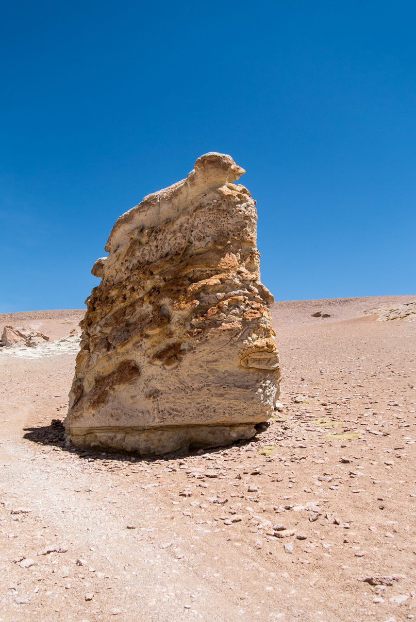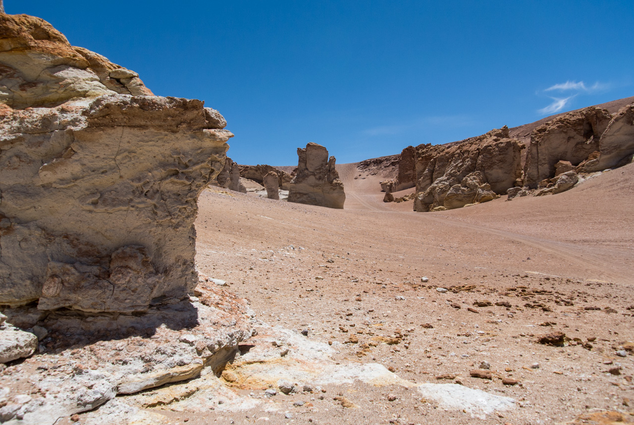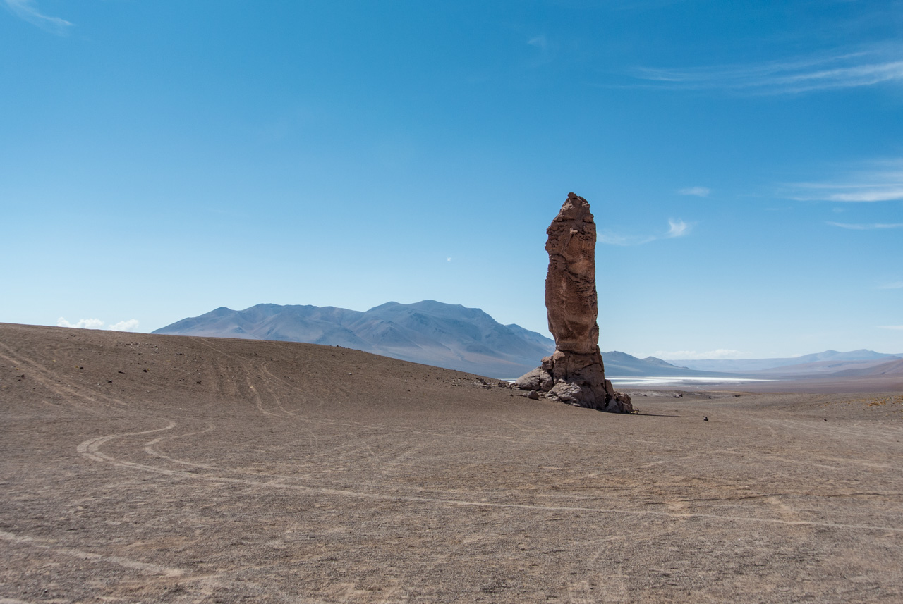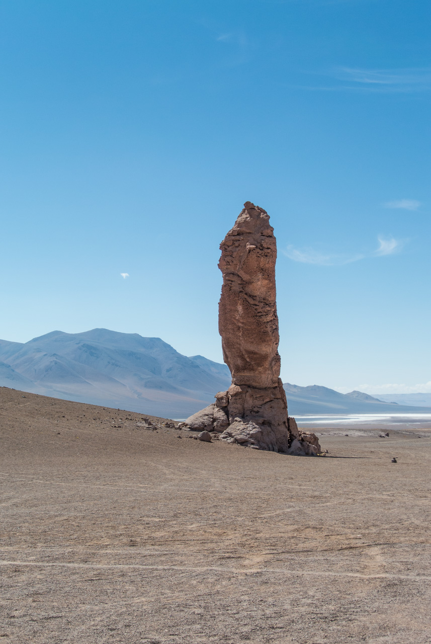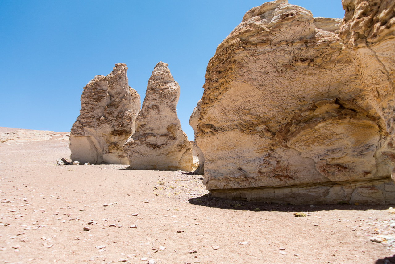 Une fois que l’on quitte la lagune, le monde devient progressivement de plus en plus minéral. La route pavée s’arrête… nous sommes dans le coin le plus reculé du parc et il n’y a plus de route ! Rien que les traces de pneus de véhicules, que vous ne verrez d’ailleurs tant l’espace est vaste. Et puis soudain, un géant : une sentinelle solitaire, puis d’autres : on les appelle ces pierres dressées vers le ciel les moines de la Pacara. Et comme les moines se promènent toujours à l’ombre d’édifices religieux, ce sont les ‘cathédrales » que l’on voit toutes proches.Nous aurons l’occasion de nous promener à loisirs et de choisir « notre » moine. Les pierres sont tellement énormes que nous avons la permission de grimper dessus. Je ne me prive pas et m’installe sur une plateforme rocheuse pour admirer le paysage. J’en prends tellement plein les yeux depuis plusieurs jours que je me demande comment il est possible que chaque paysage arrive à en surpasser un autre. Après cette pause, il faut finalement redescendre, nous reprenons le sentier et filons dans le désert, libres comme les vigognes des lagunas altiplanicas. Il n’y a que nous, dans notre boite de métal, la vitesse, et le désert. Rien que cette sensation vaut le coup de faire cette excursion.