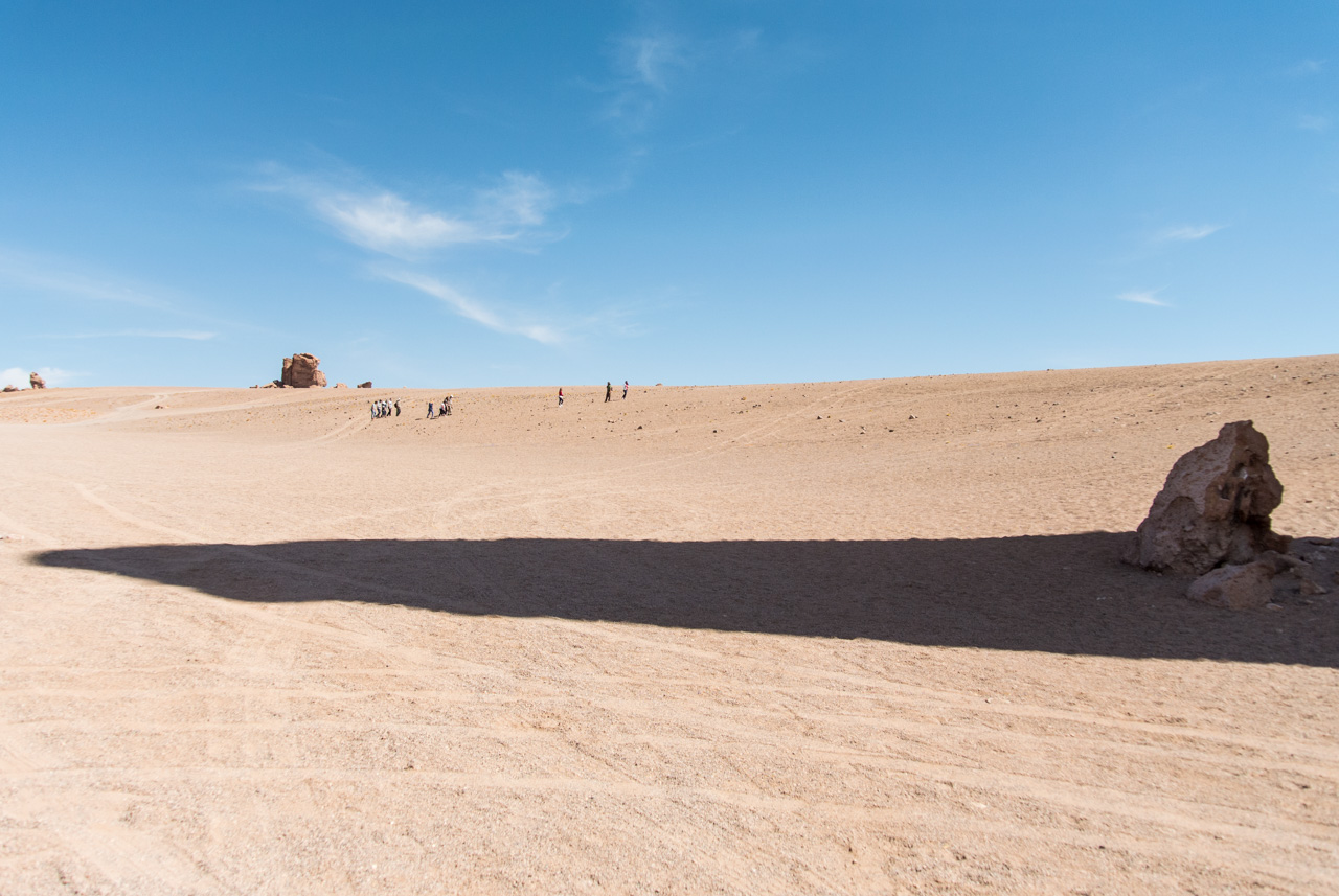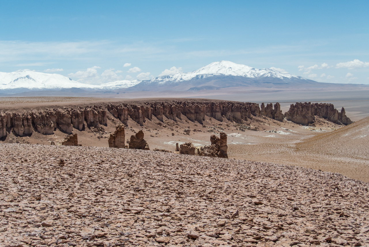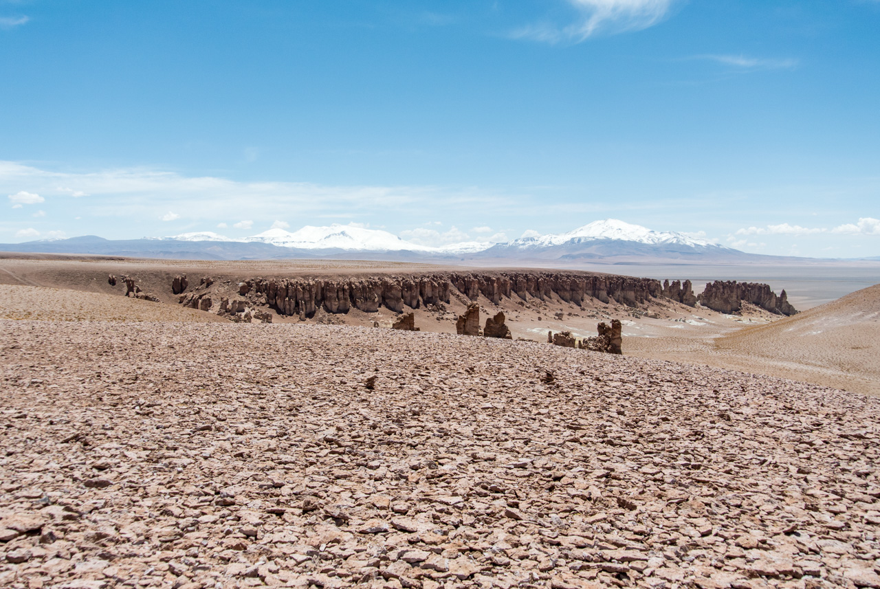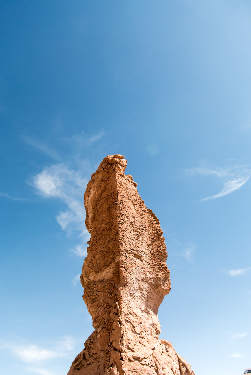 Une fois que l’on quitte la lagune, le monde devient progressivement de plus en plus minéral. La route pavée s’arrête… nous sommes dans le coin le plus reculé du parc et il n’y a plus de route ! Rien que les traces de pneus de véhicules, que vous ne verrez d’ailleurs tant l’espace est vaste. Et puis soudain, un géant : une sentinelle solitaire, puis d’autres : on les appelle ces pierres dressées vers le ciel les moines de la Pacara. Et comme les moines se promènent toujours à l’ombre d’édifices religieux, ce sont les ‘cathédrales » que l’on voit toutes proches.Nous aurons l’occasion de nous promener à loisirs et de choisir « notre » moine. Les pierres sont tellement énormes que nous avons la permission de grimper dessus. Je ne me prive pas et m’installe sur une plateforme rocheuse pour admirer le paysage. J’en prends tellement plein les yeux depuis plusieurs jours que je me demande comment il est possible que chaque paysage arrive à en surpasser un autre. Après cette pause, il faut finalement redescendre, nous reprenons le sentier et filons dans le désert, libres comme les vigognes des lagunas altiplanicas. Il n’y a que nous, dans notre boite de métal, la vitesse, et le désert. Rien que cette sensation vaut le coup de faire cette excursion.