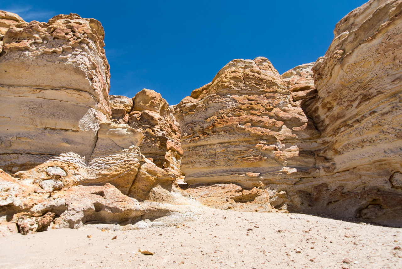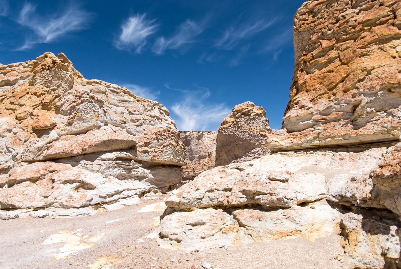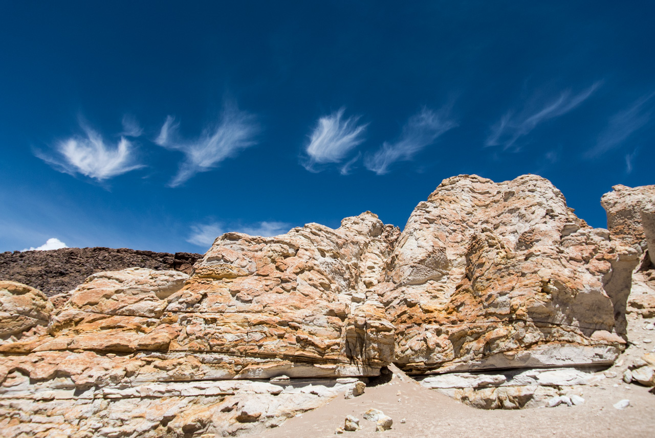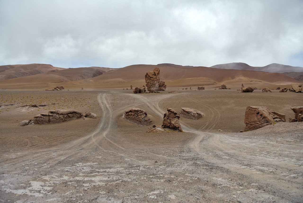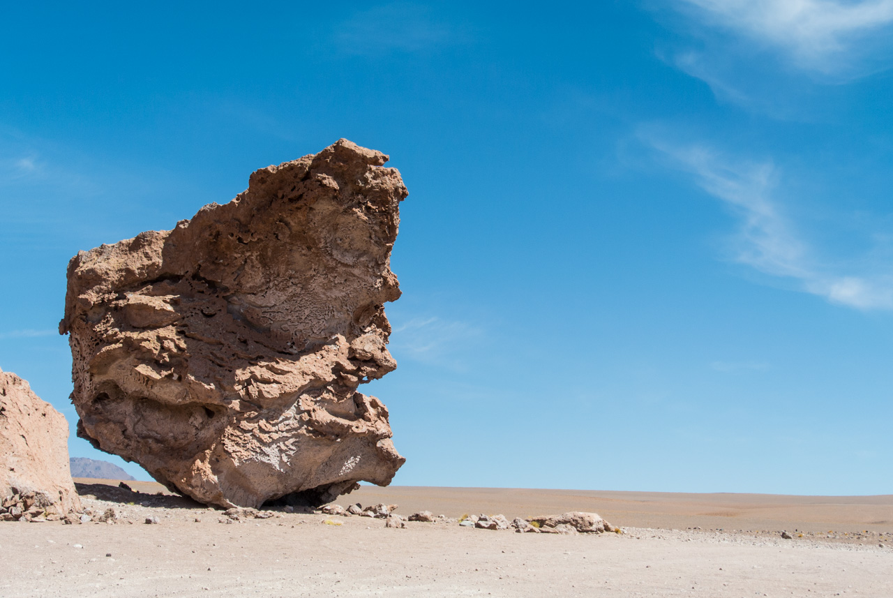 Une fois que l’on quitte la lagune, le monde devient progressivement de plus en plus minéral. La route pavée s’arrête… nous sommes dans le coin le plus reculé du parc et il n’y a plus de route ! Rien que les traces de pneus de véhicules, que vous ne verrez d’ailleurs tant l’espace est vaste. Et puis soudain, un géant : une sentinelle solitaire, puis d’autres : on les appelle ces pierres dressées vers le ciel les moines de la Pacara. Et comme les moines se promènent toujours à l’ombre d’édifices religieux, ce sont les ‘cathédrales » que l’on voit toutes proches.Nous aurons l’occasion de nous promener à loisirs et de choisir « notre » moine. Les pierres sont tellement énormes que nous avons la permission de grimper dessus. Je ne me prive pas et m’installe sur une plateforme rocheuse pour admirer le paysage. J’en prends tellement plein les yeux depuis plusieurs jours que je me demande comment il est possible que chaque paysage arrive à en surpasser un autre. Après cette pause, il faut finalement redescendre, nous reprenons le sentier et filons dans le désert, libres comme les vigognes des lagunas altiplanicas. Il n’y a que nous, dans notre boite de métal, la vitesse, et le désert. Rien que cette sensation vaut le coup de faire cette excursion.