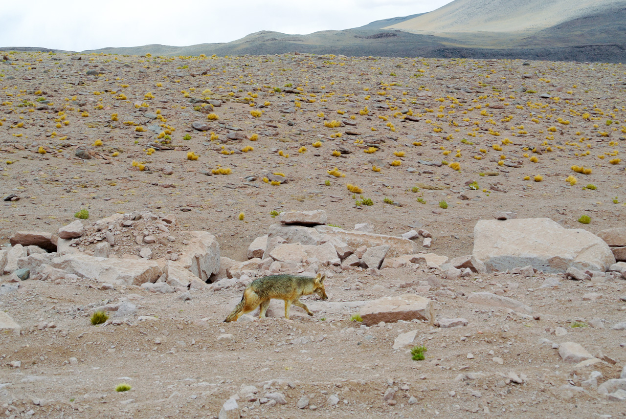 Enfin, voilà le clou du spectacle : le salar de Tara! Voilà les plantes. Le vert revient, un gros rongeur (un chinchilla?) sort furtivement de son trou avant de retourner se cacher. Pendant que notre guide dresse la table du déjeuner, notre petit groupe (nous sommes royalement cinq, et un il n’y a qu’un seul autre groupe de la même taille qui finit de déjeuner), nous avons tout le temps qu’il faut pour nous promener et admirer : c’est décidément l’endroit de l’Atacama où la faune et la flore explosent. De la Bolivie toute proche, court un fleuve qui franchit la frontière et nourrit ces petits marais. Au loin, on distingue des flamants roses, mais on y trouve aussi des canards et d’autres sortes d’oiseaux. Au loin, les sommets des Andes, coiffés de leurs neiges éternelles semblent si proches… c’est comme les coins d’un mouchoir qu’on aurait brodé pour faire l’ensemble plus joli. Dans ce somptueux décor, nous allons déjeuner : salade, poulet, riz, jus de fruit et thé à la coca que je m’empresse d’avaler (et oui, ça aide avec l’altitude). Je n’ai pas envie de partir et pourtant… le ciel se couvre tout doucement, et vient l’heure de rentrer. Avec la disparition du soleil, le désert prend un aspect dramatique et mystérieux… pendant que les autres passagères somnolent à l’arrière, moi, qui suis installée à côté de notre guide et chauffeur, je regarde… avidement. Soudain, un renard passe, solitaire. Et libre.