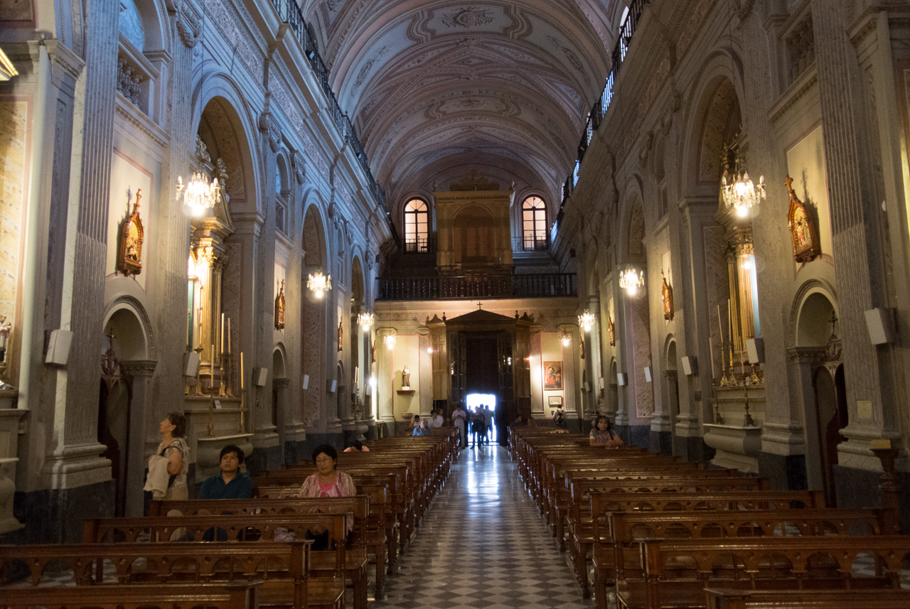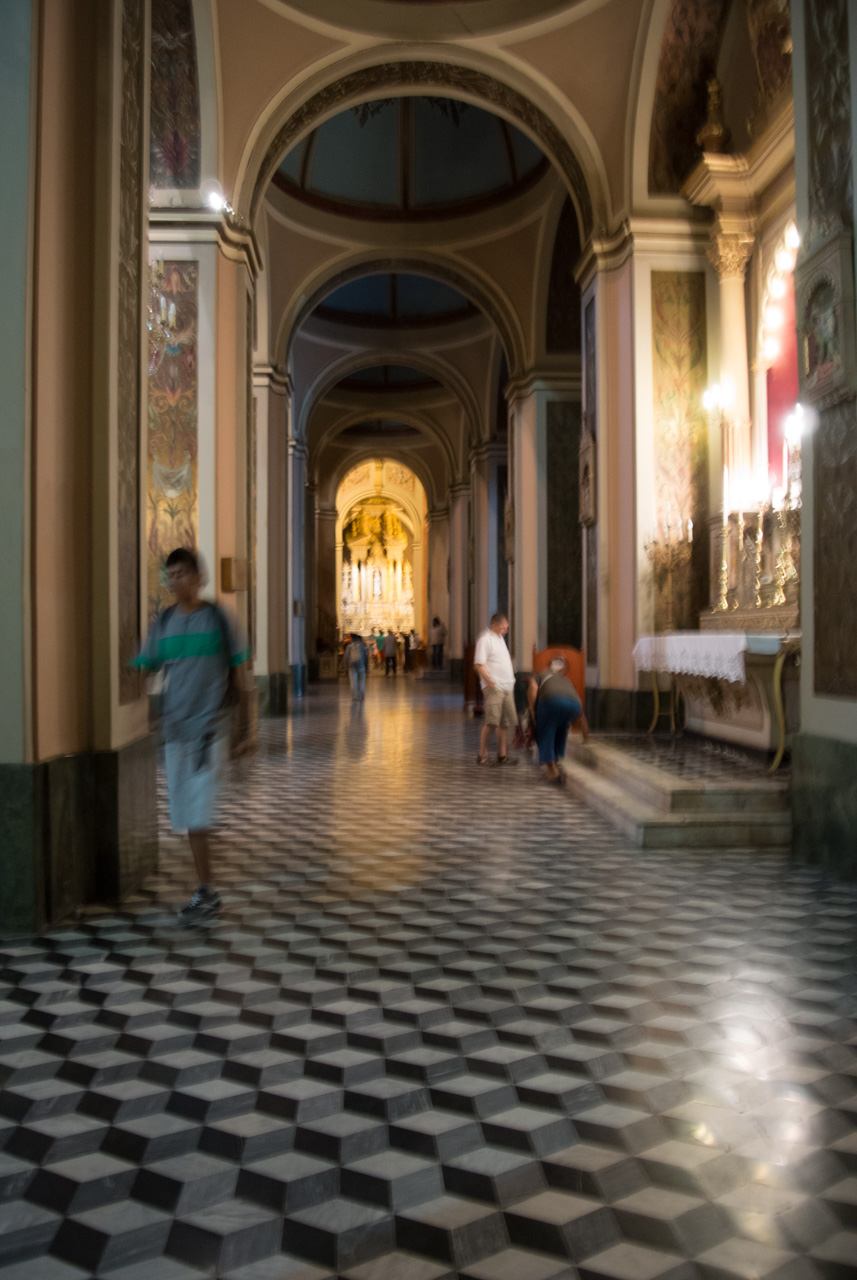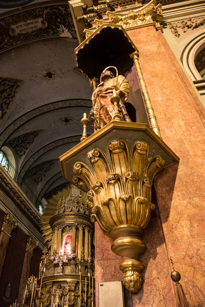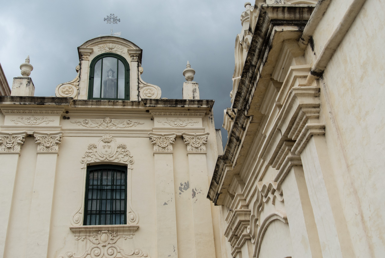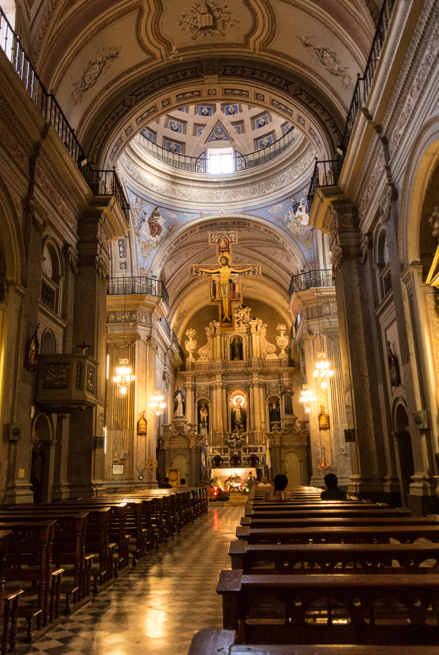 Un peu plus loin, on trouve l’une des églises à ne pas manquer de Salta : La Basilique San Francisco. On ne peut pas la louper : elle est toute de rouge vêtue… et au moment de ma visite, en cours de rénovation. Quel contraste avec le couvent voisin, tout blanc et sans chi-chi. Ici, c’est le baroque triomphant qui s’exprime : depuis une façade chargée jusqu’au choeur théâtral, tout est fait pour en mettre plein les yeux… et !a marche : la basilique est inscrite au patrimoine mondial de l’UNECSO.